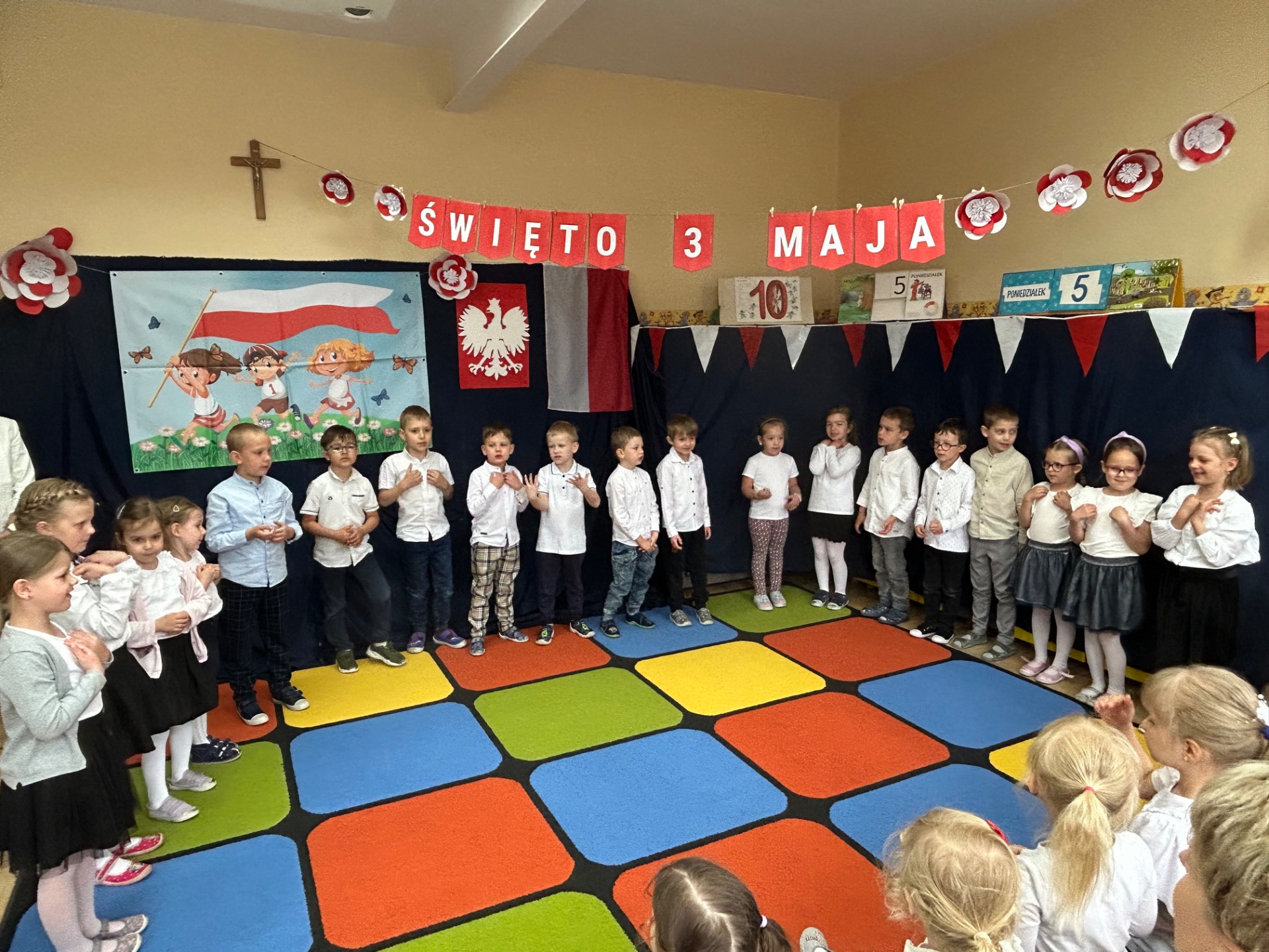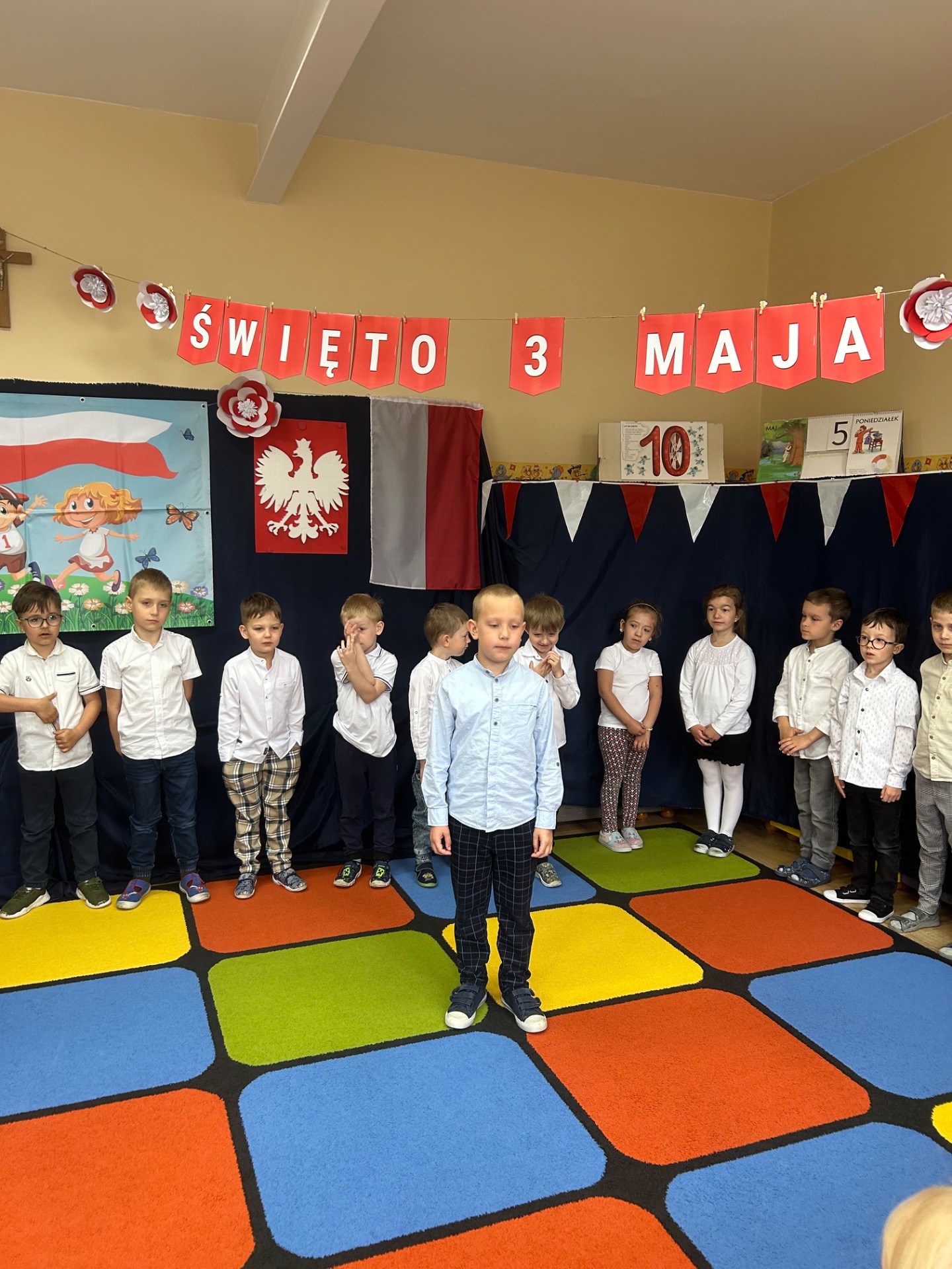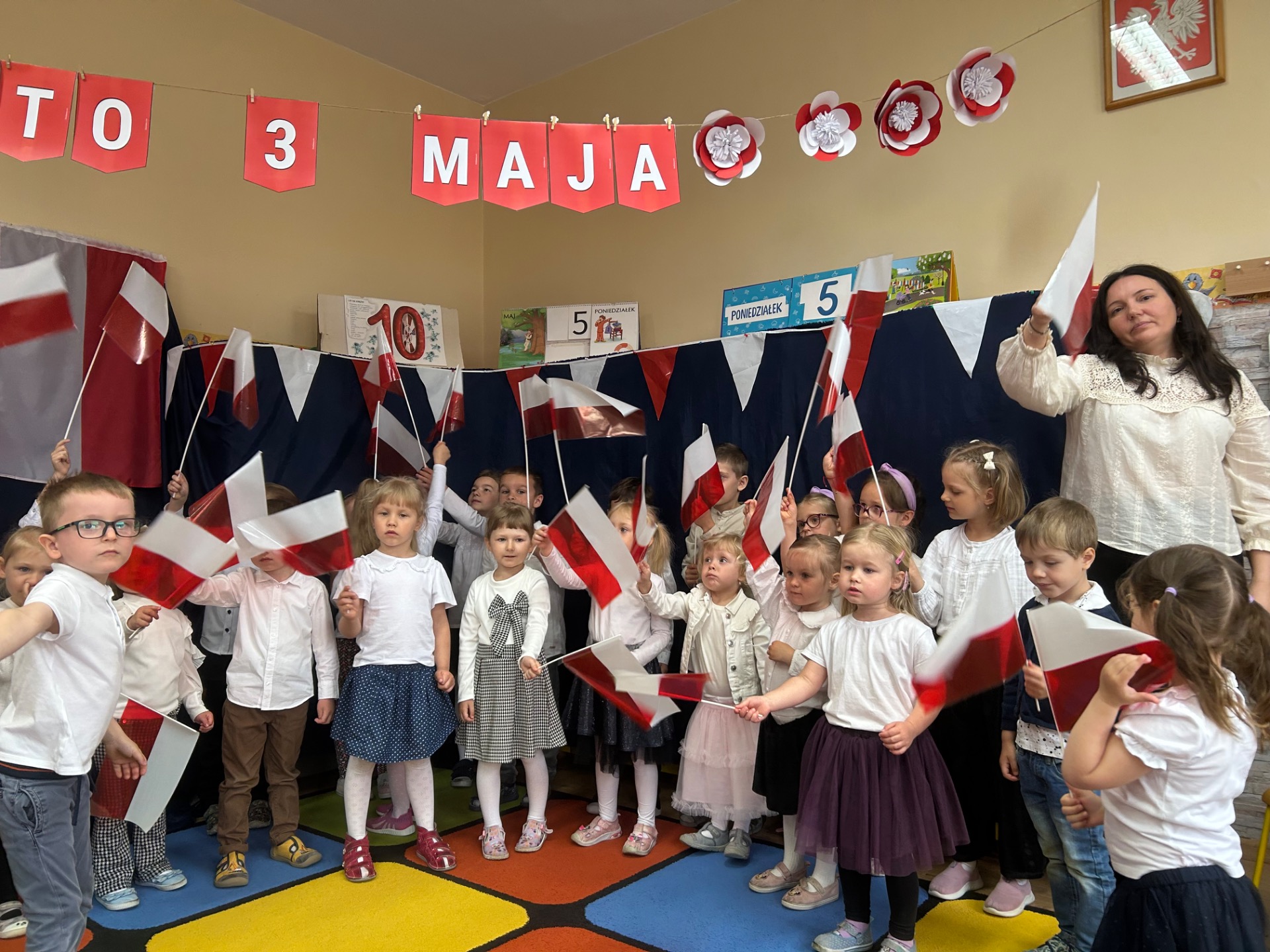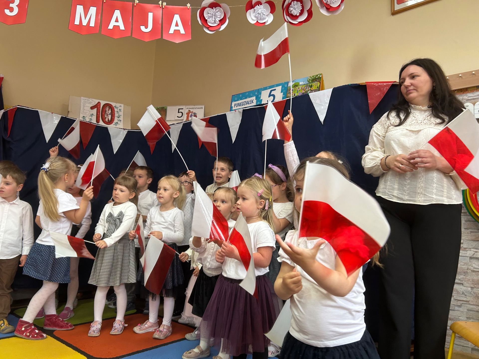 W poniedziałek, 5 maja, w naszym przedszkolu odbyła się akademia z okazji Święta Konstytucji 3 Maja. Dzieci, ubrane w stroje galowe, z wielkim zaangażowaniem odśpiewały hymn państwowy, a następnie zaprezentowały piosenki związane z Polską oraz recytowały wiersze o tematyce patriotycznej. Sala została udekorowana w barwy narodowe, co dodatkowo podkreśliło podniosły charakter uroczystości. Była to doskonała okazja do rozmowy o wartościach patriotycznych i symbolach narodowych.