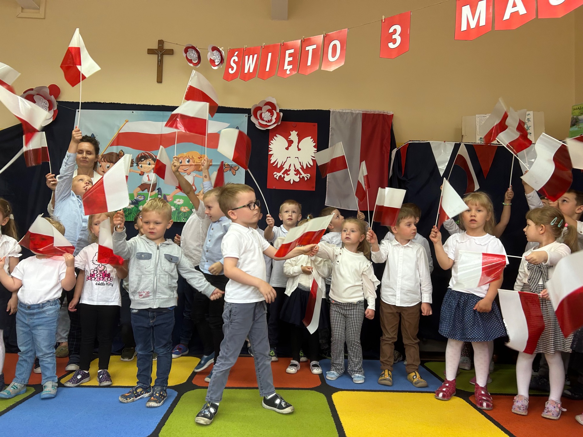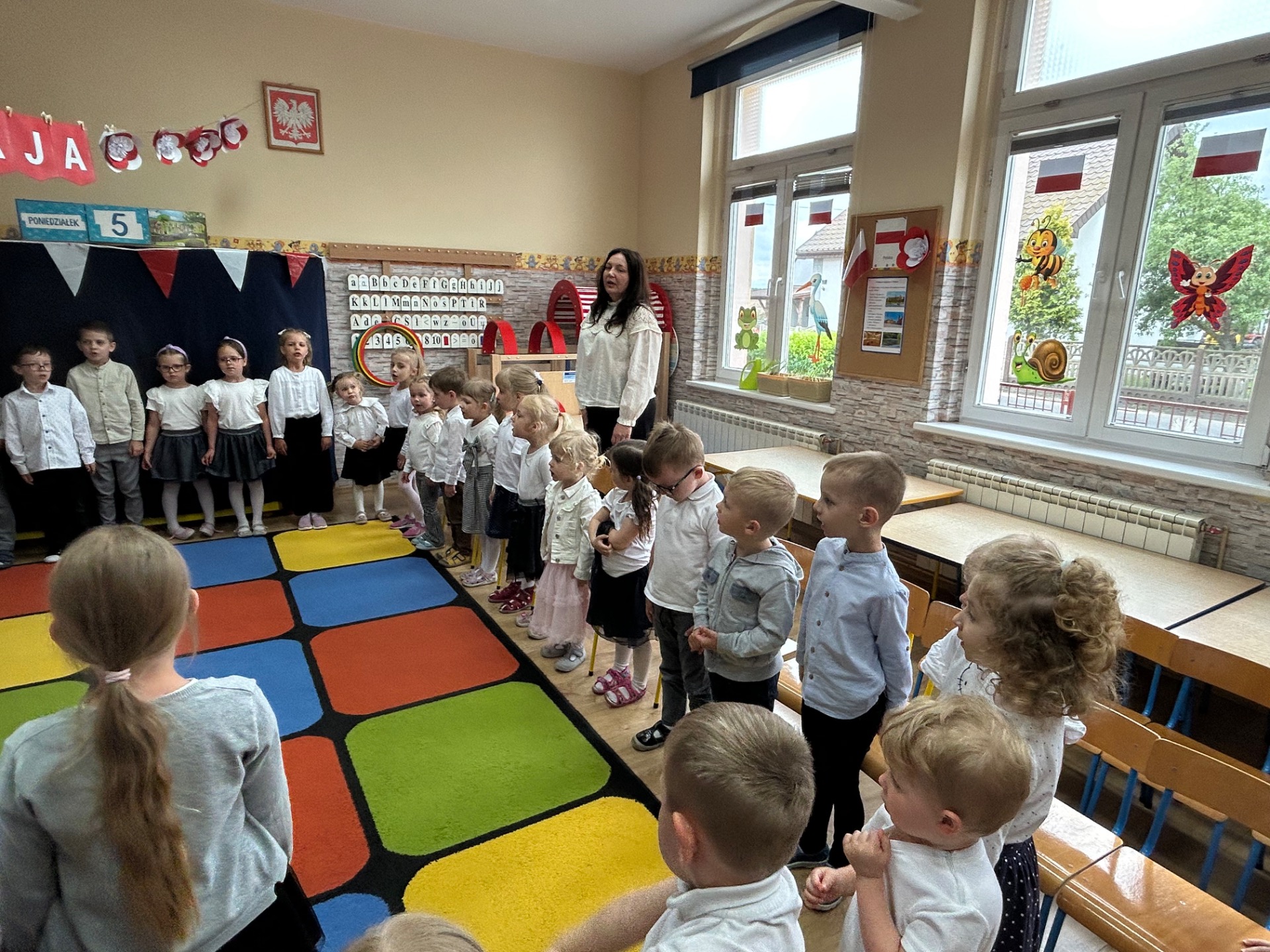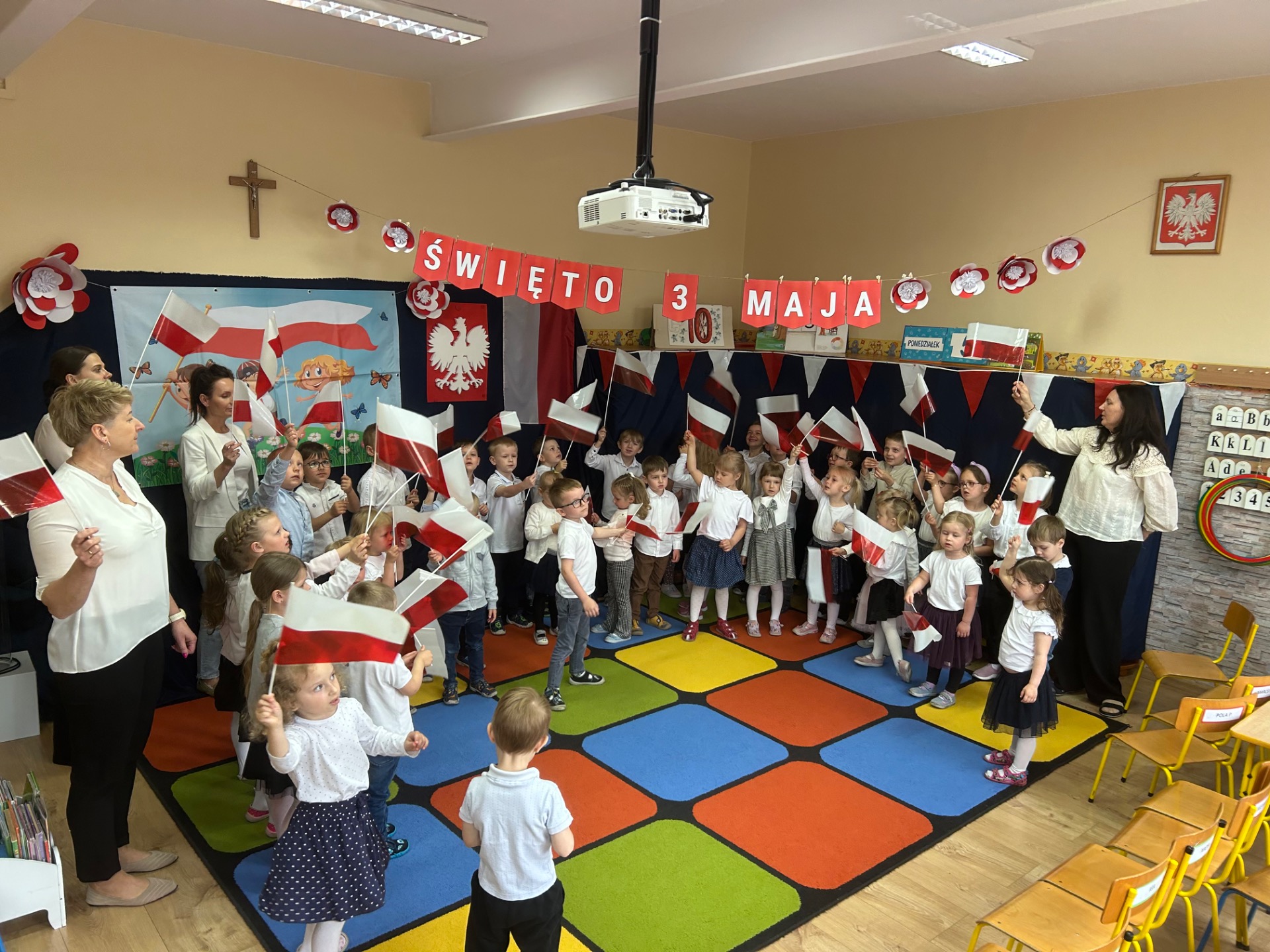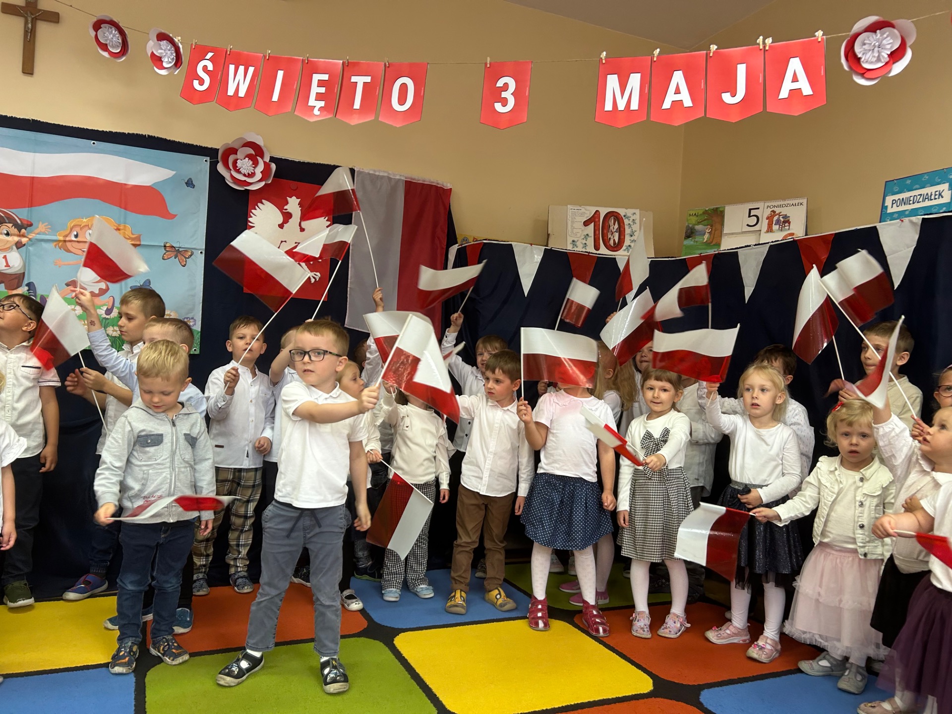 W poniedziałek, 5 maja, w naszym przedszkolu odbyła się akademia z okazji Święta Konstytucji 3 Maja. Dzieci, ubrane w stroje galowe, z wielkim zaangażowaniem odśpiewały hymn państwowy, a następnie zaprezentowały piosenki związane z Polską oraz recytowały wiersze o tematyce patriotycznej. Sala została udekorowana w barwy narodowe, co dodatkowo podkreśliło podniosły charakter uroczystości. Była to doskonała okazja do rozmowy o wartościach patriotycznych i symbolach narodowych.
