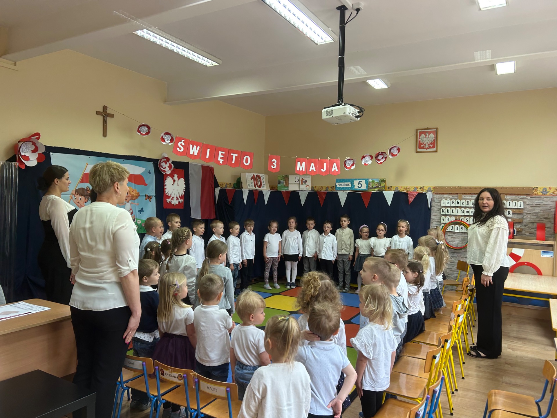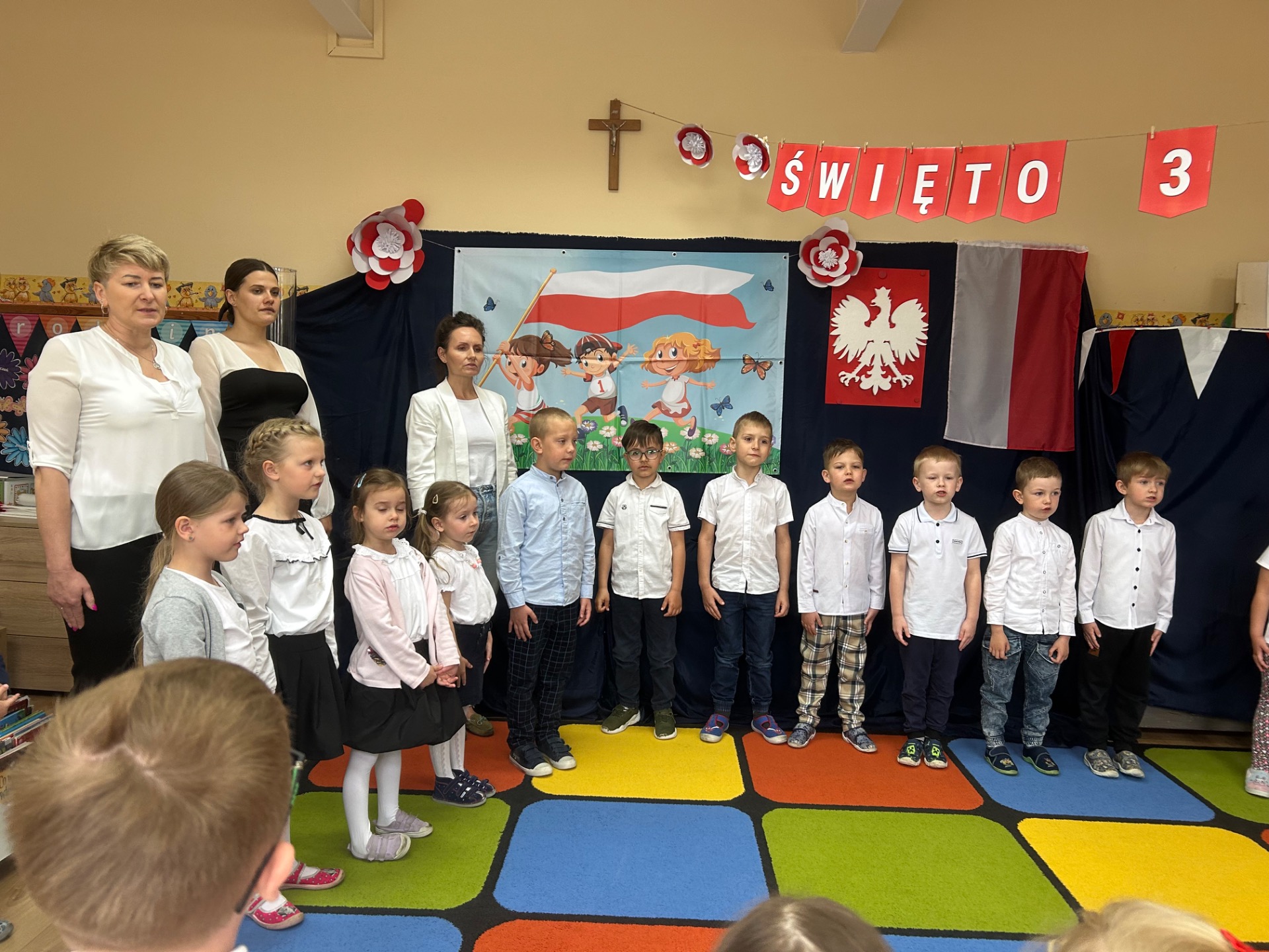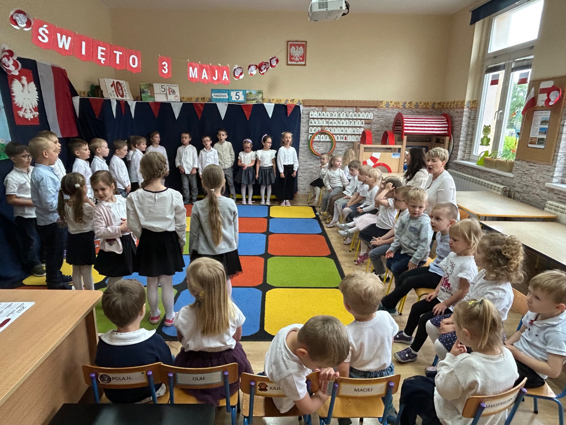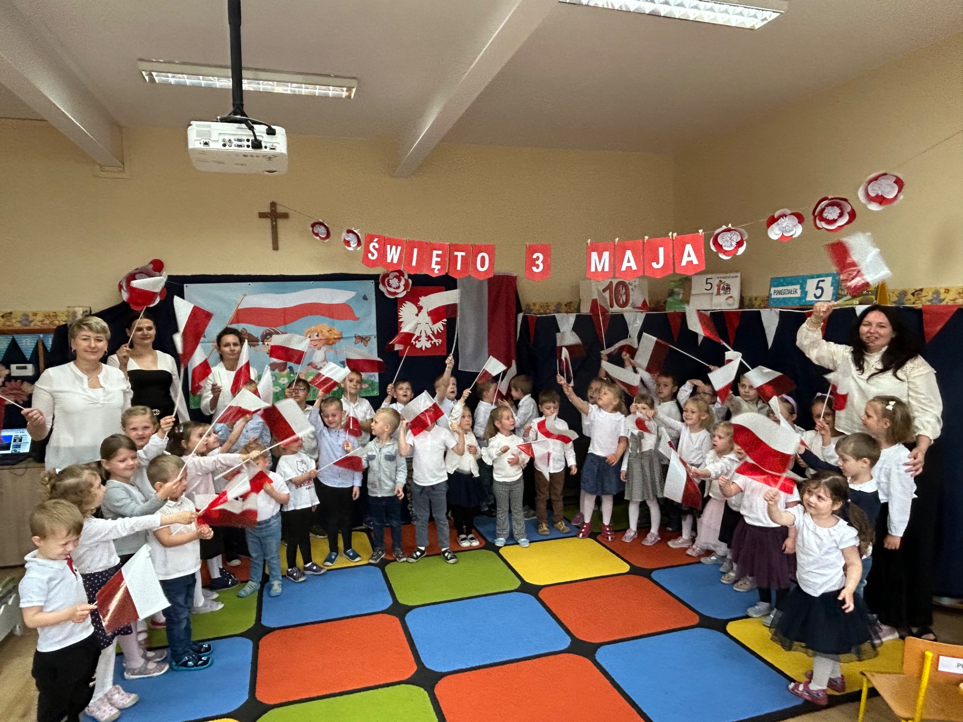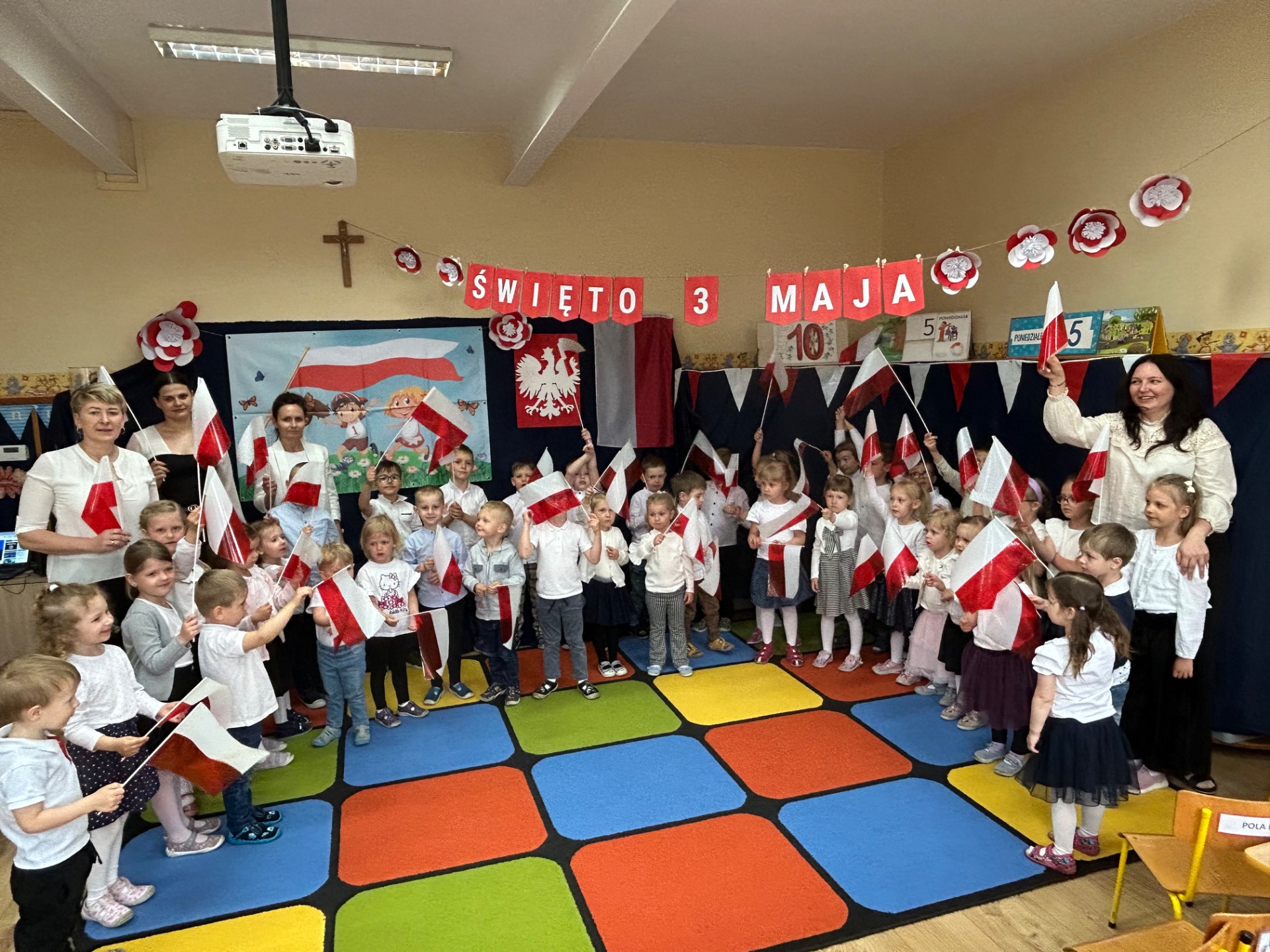 W poniedziałek, 5 maja, w naszym przedszkolu odbyła się akademia z okazji Święta Konstytucji 3 Maja. Dzieci, ubrane w stroje galowe, z wielkim zaangażowaniem odśpiewały hymn państwowy, a następnie zaprezentowały piosenki związane z Polską oraz recytowały wiersze o tematyce patriotycznej. Sala została udekorowana w barwy narodowe, co dodatkowo podkreśliło podniosły charakter uroczystości. Była to doskonała okazja do rozmowy o wartościach patriotycznych i symbolach narodowych.