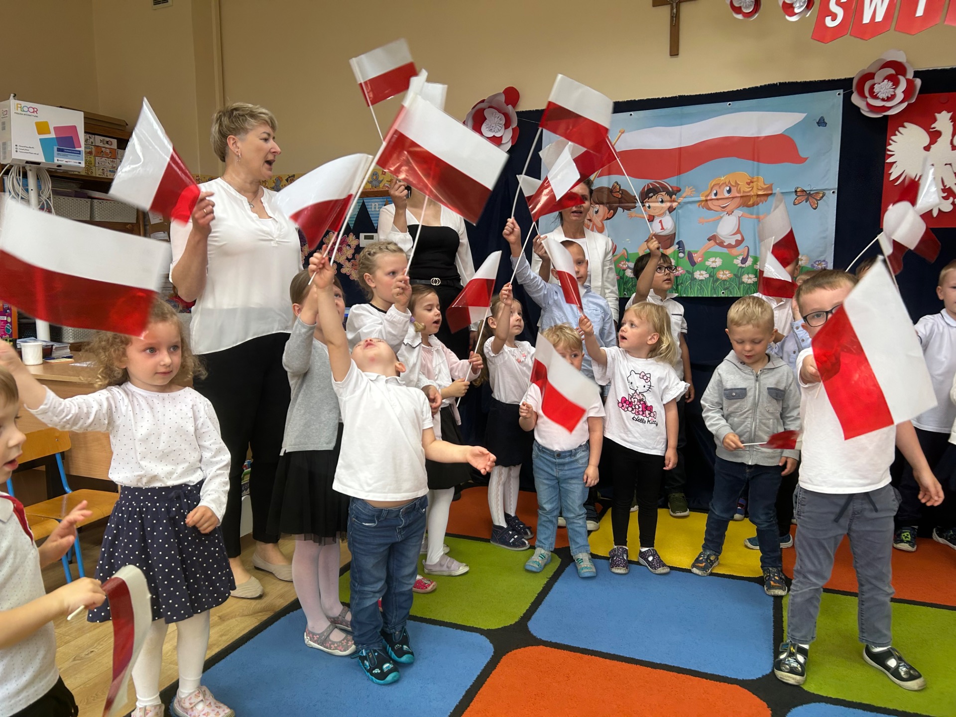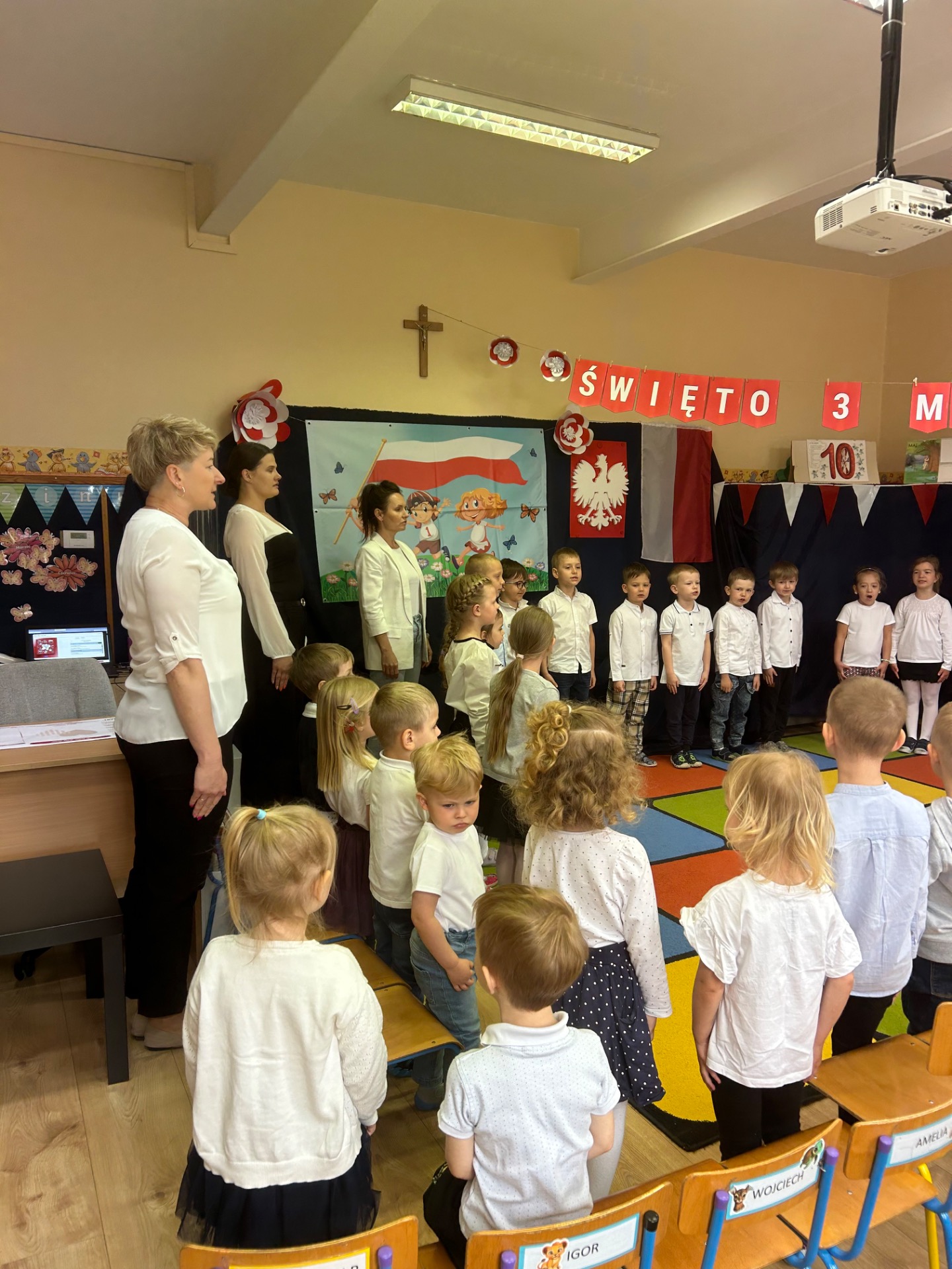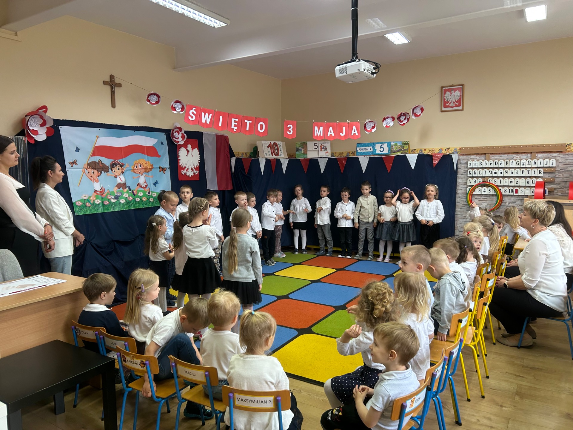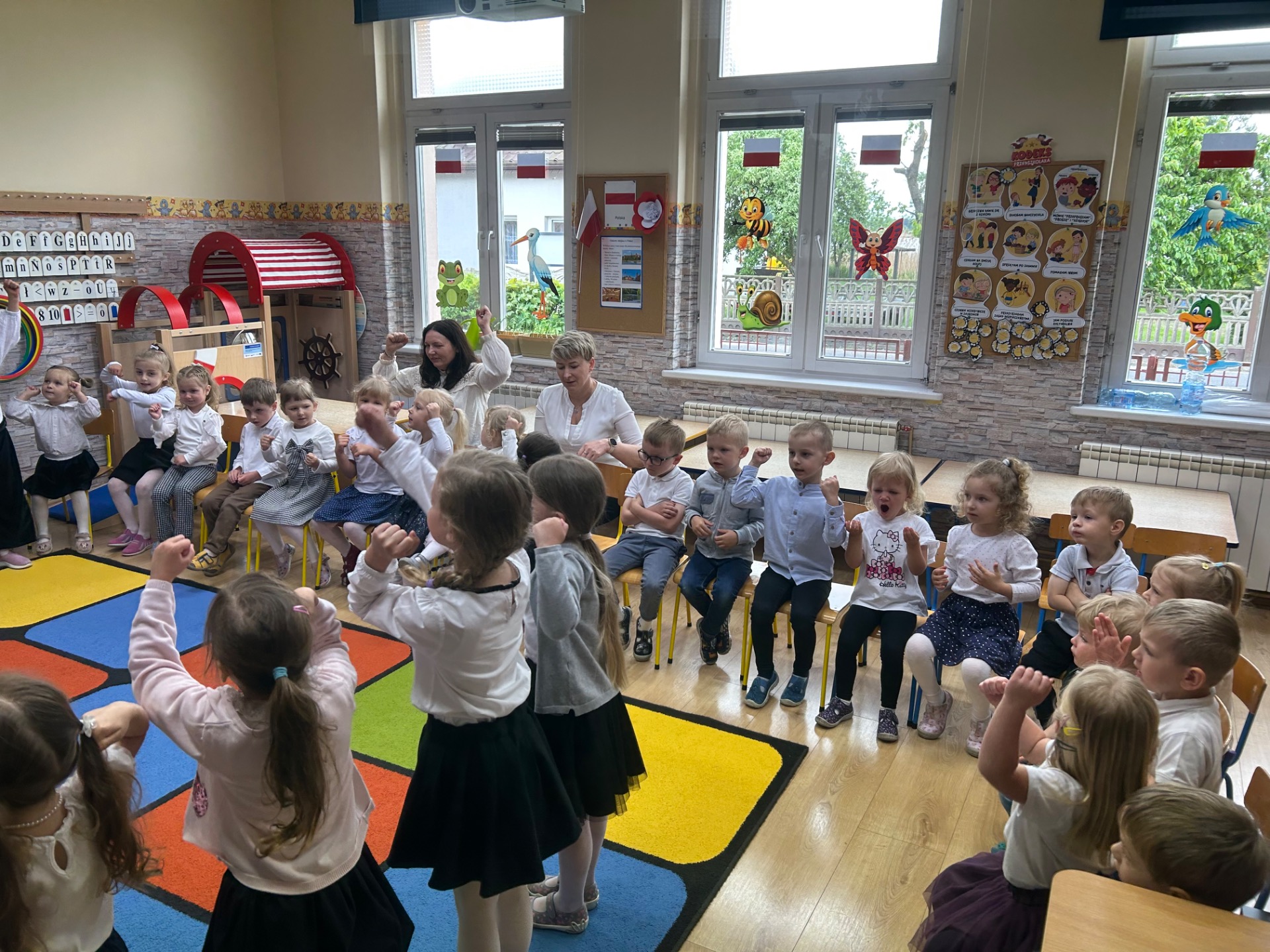 W poniedziałek, 5 maja, w naszym przedszkolu odbyła się akademia z okazji Święta Konstytucji 3 Maja. Dzieci, ubrane w stroje galowe, z wielkim zaangażowaniem odśpiewały hymn państwowy, a następnie zaprezentowały piosenki związane z Polską oraz recytowały wiersze o tematyce patriotycznej. Sala została udekorowana w barwy narodowe, co dodatkowo podkreśliło podniosły charakter uroczystości. Była to doskonała okazja do rozmowy o wartościach patriotycznych i symbolach narodowych.
