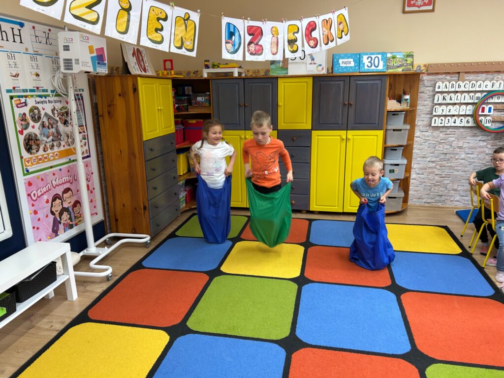 Dzień Dziecka w naszym przedszkolu był pełen radości i uśmiechu! Choć pogoda trochę pokrzyżowała nam plany i nie udało się zorganizować zabaw sportowych na placu przedszkolnym, to i tak świetnie się bawiliśmy!