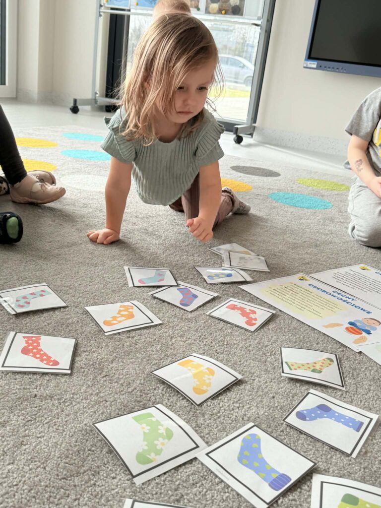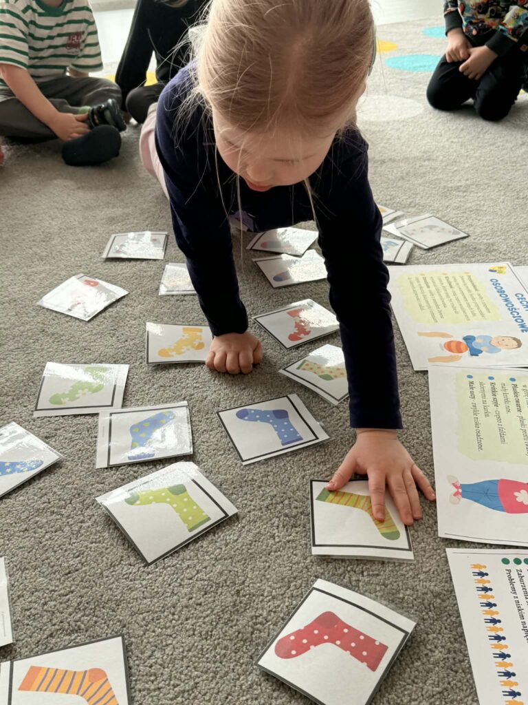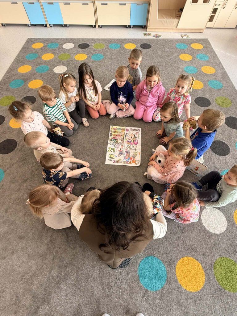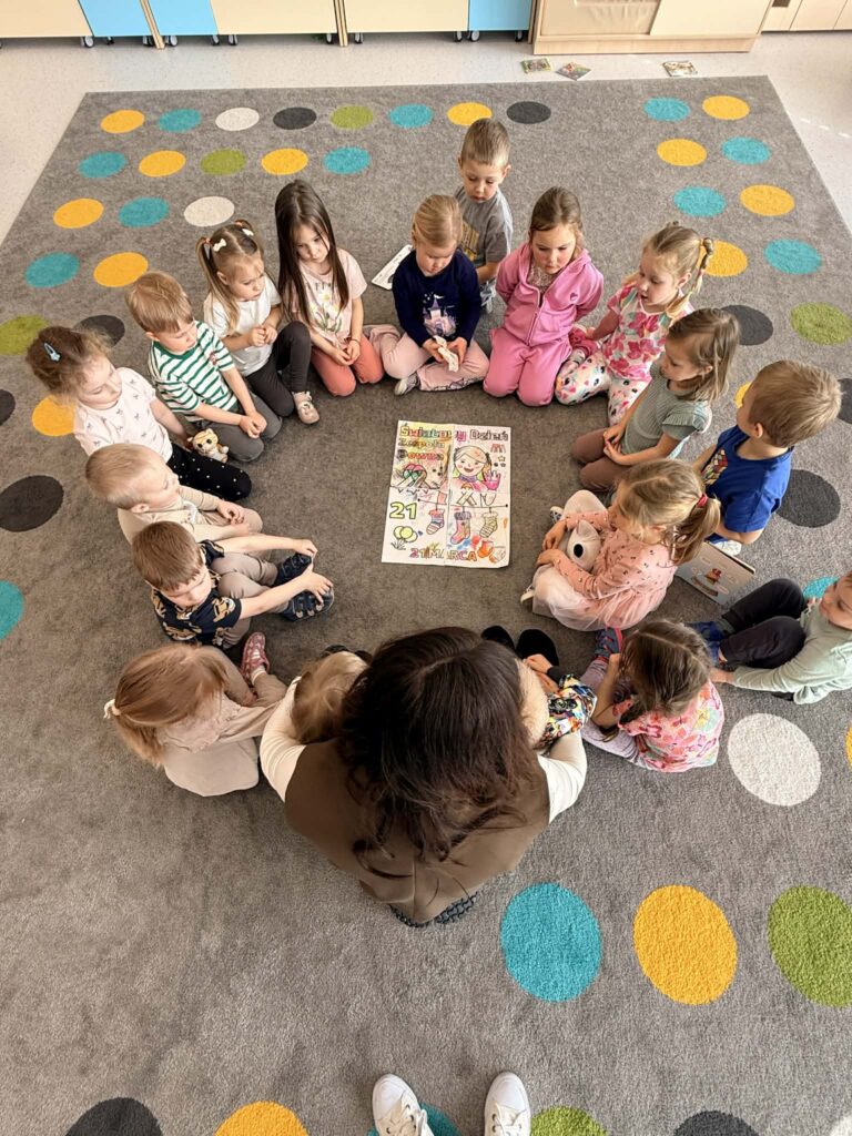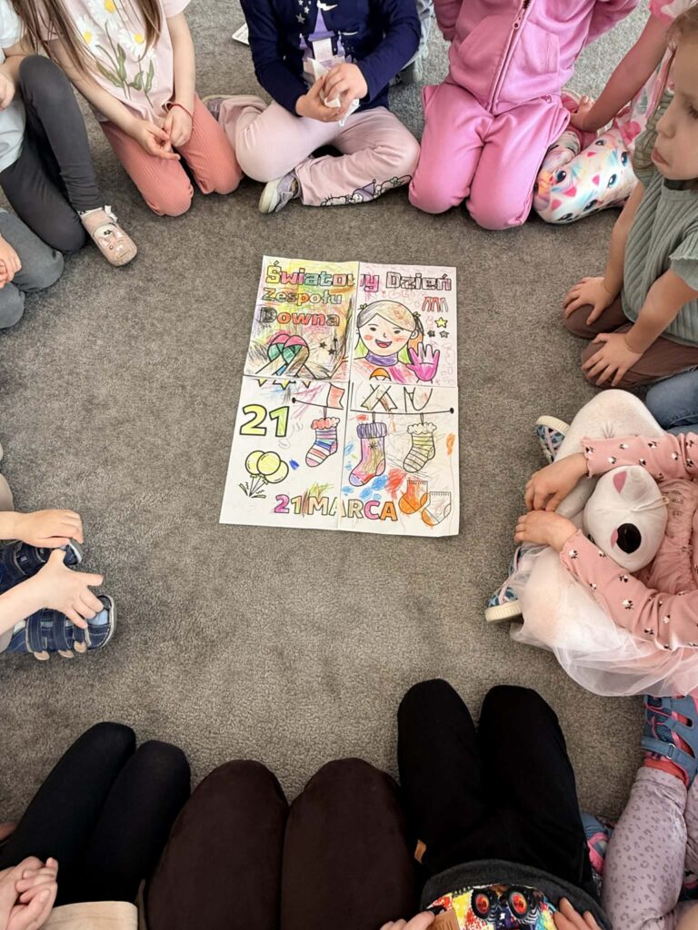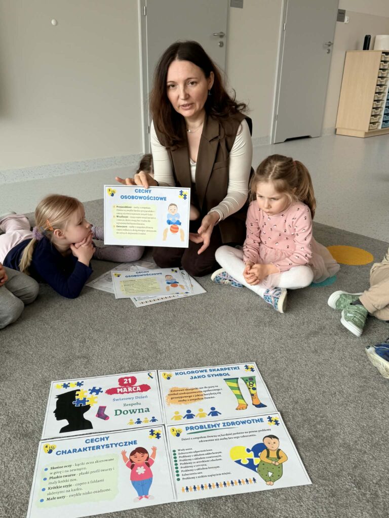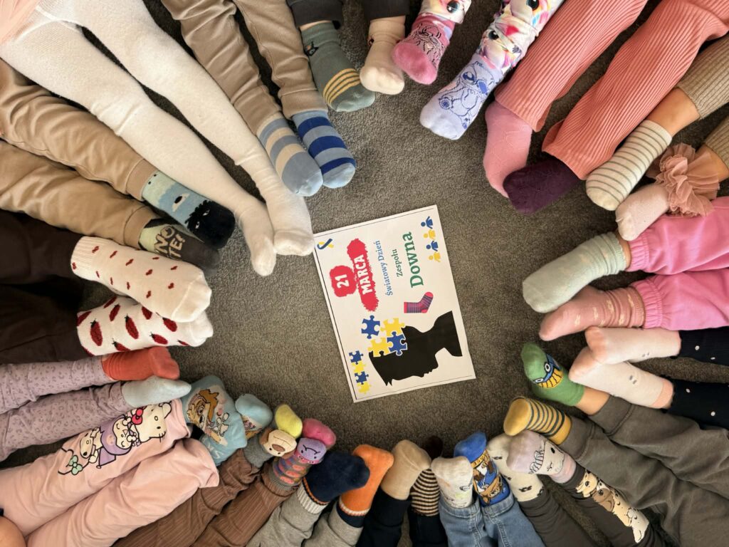 Pracując w grupach dzieci kolorowały kolorowankę XXL ucząc się współpracy i dzielenia zadaniami. Nie zabrakło również zabaw rozwijających myślenie – dzieci wyszukiwały skarpetki według podanych wskazówek oraz obejrzały bajkę o dzieciach z zespołem Downa. Celem zajęć było uwrażliwienie dzieci na różnorodność i potrzebę akceptacji innych osób, budowanie szacunku i empatii oraz kształtowanie pozytywnego stosunku do odmienności.