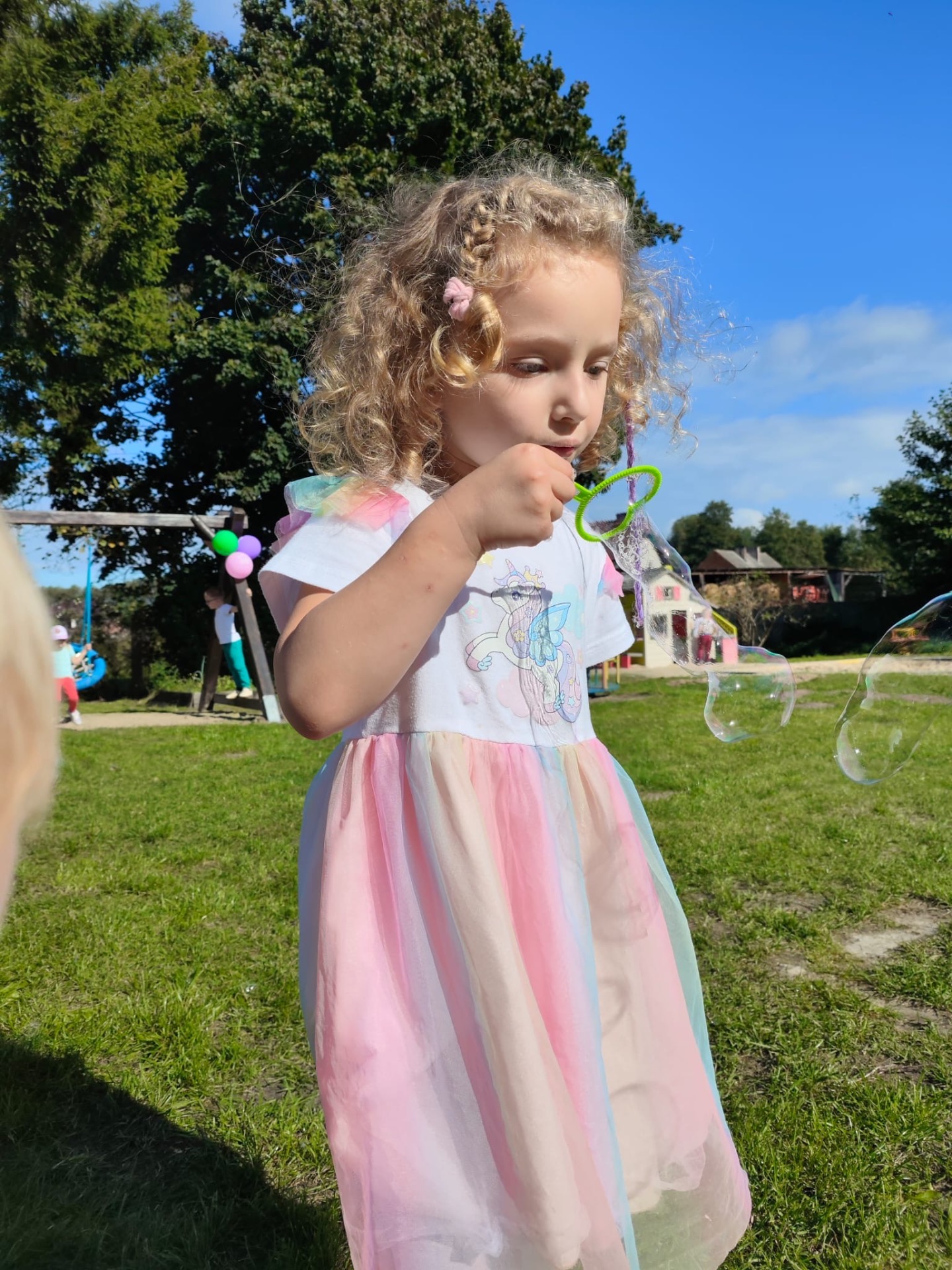 Na dzieci czekało mnóstwo atrakcji – wesołe zabawy, kolorowe balony, tańczące w słońcu bańki mydlane oraz słodkie przekąski, które dodawały energii do dalszej zabawy.