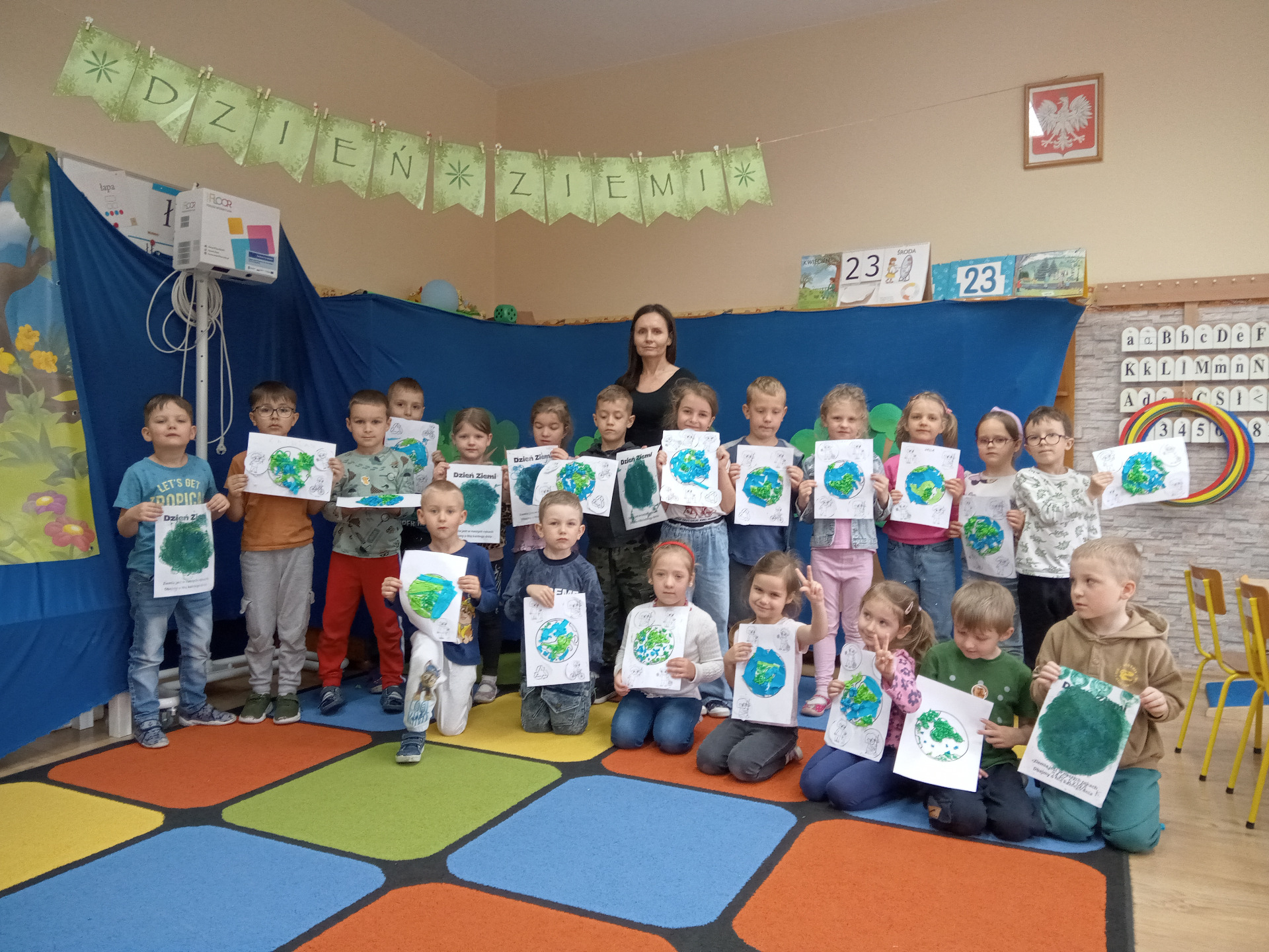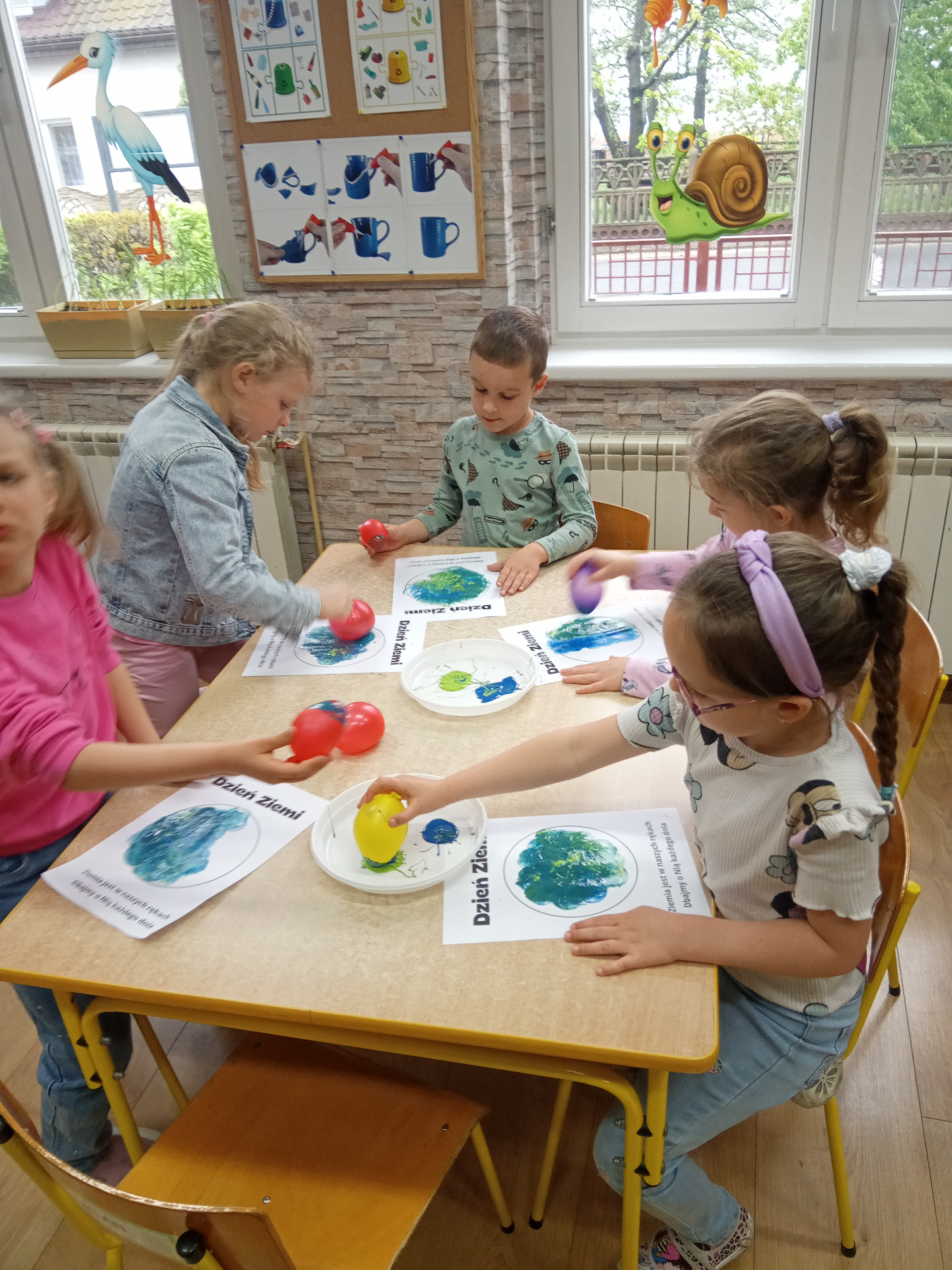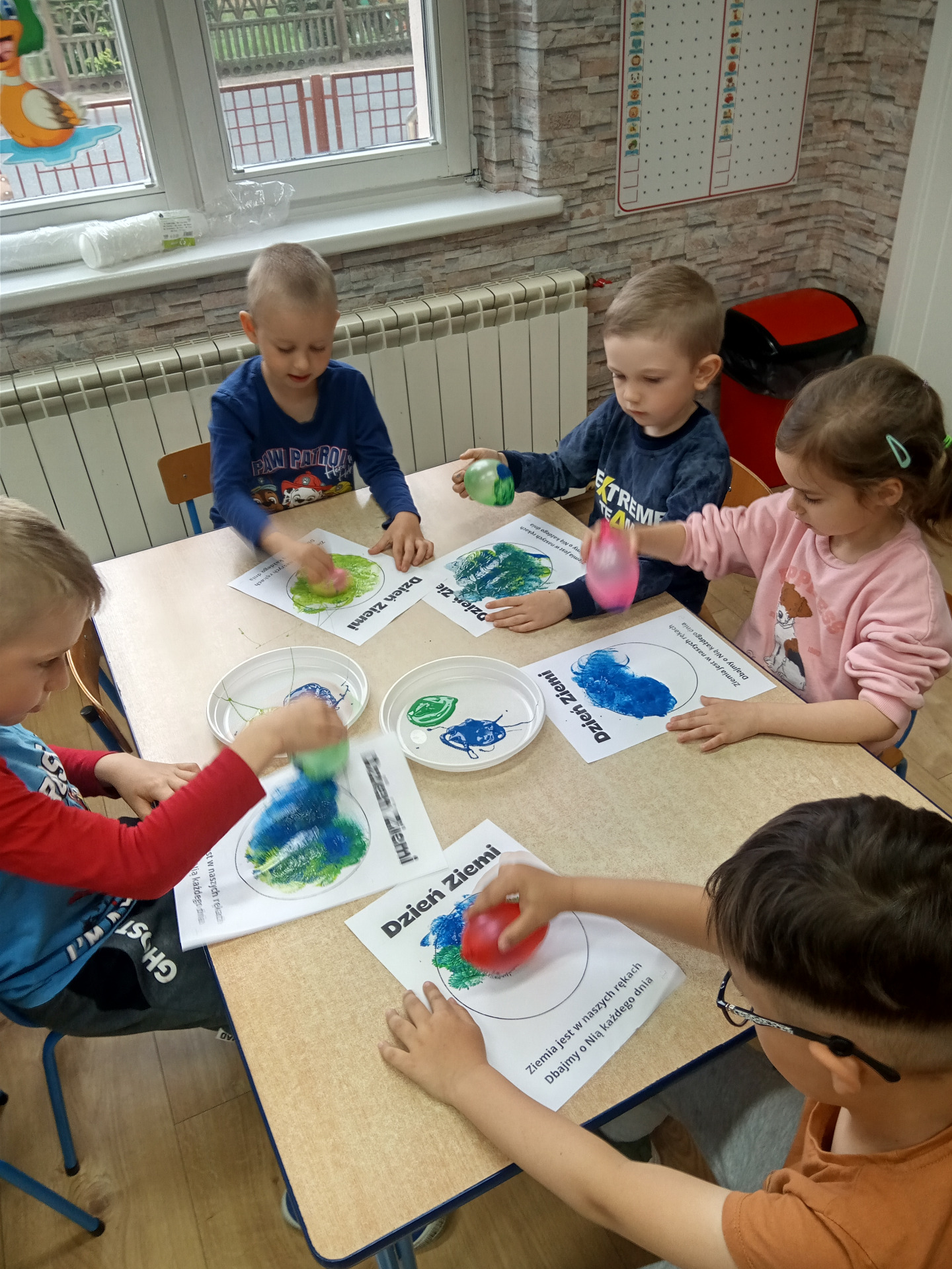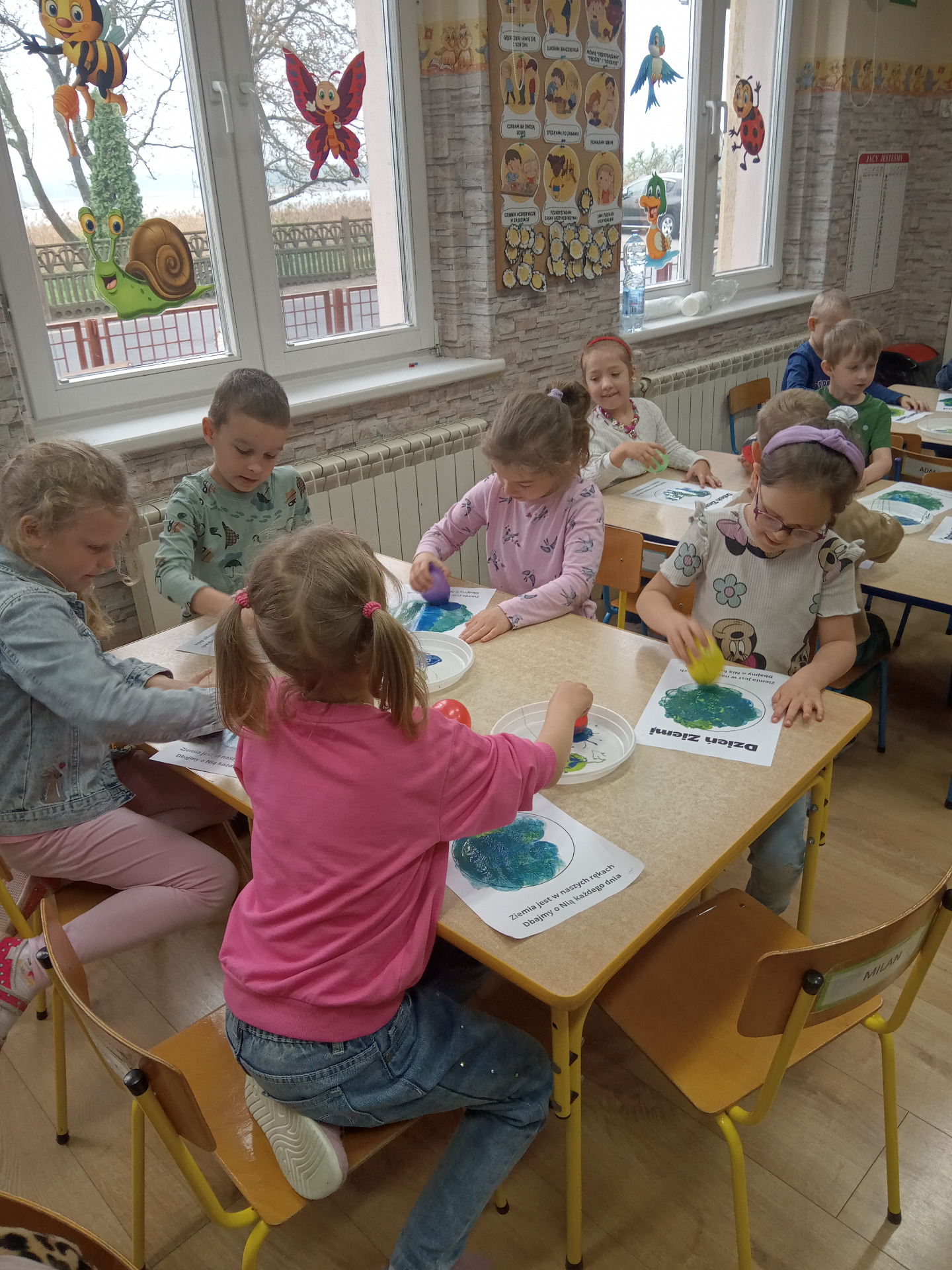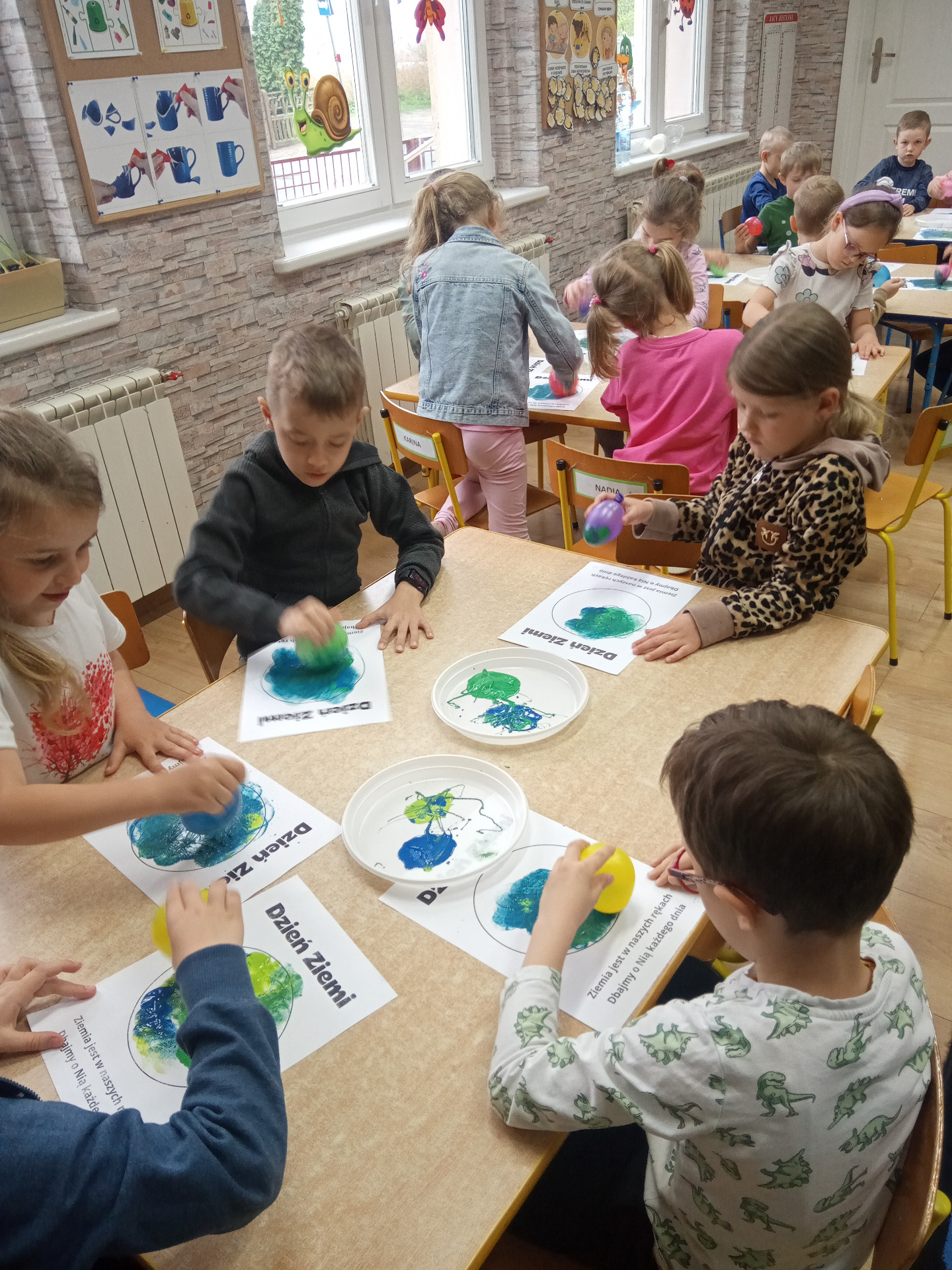 W miniony piątek grupa „Motylków” świętowała Dzień Ziemi. Dzieci wzięły udział w ciekawej pogadance na temat naszej planety – dowiedziały sie , jak dbać o Ziemię, jakie nawyki są dobre ( np. gaszenie światła, oszczedzanie wody, zbieranie śmieci), a jakie szkodzą środowisku (np. wyrzucanie smieci na ulicę, czy w parkach, marnowanie jedzenia). Przedszkolaki poznały również słowo ” recykling”, segregowały śmieci do odpowiednich pojemników. Kolejnym punktem dnia była gra ekologiczna, która utrwalała wiedzę o ochronie środowiska w formie zabawy. „Motylki” śpiewały także piosenki o Ziemi i przyrodzie, okazując troskę i miłość do naszej planety. Na zakończenie dzieci wykonałay prace plastyczne przedstawiającą Ziemię. Prace zostay wykonane dwoma technikami – malowanie balonem oraz farbami w i druga technika – wyklejanie planety bibułą karbowaną. Każda praca wykonana przez dzieci jest wyjątkowa i pokazuje, jak wiele serca dzieci wkładają w troskę o nasz wspólny dom. Przypominamy, że każda , nawet najmniejsza, ekodziałalność ma znaczenie.
