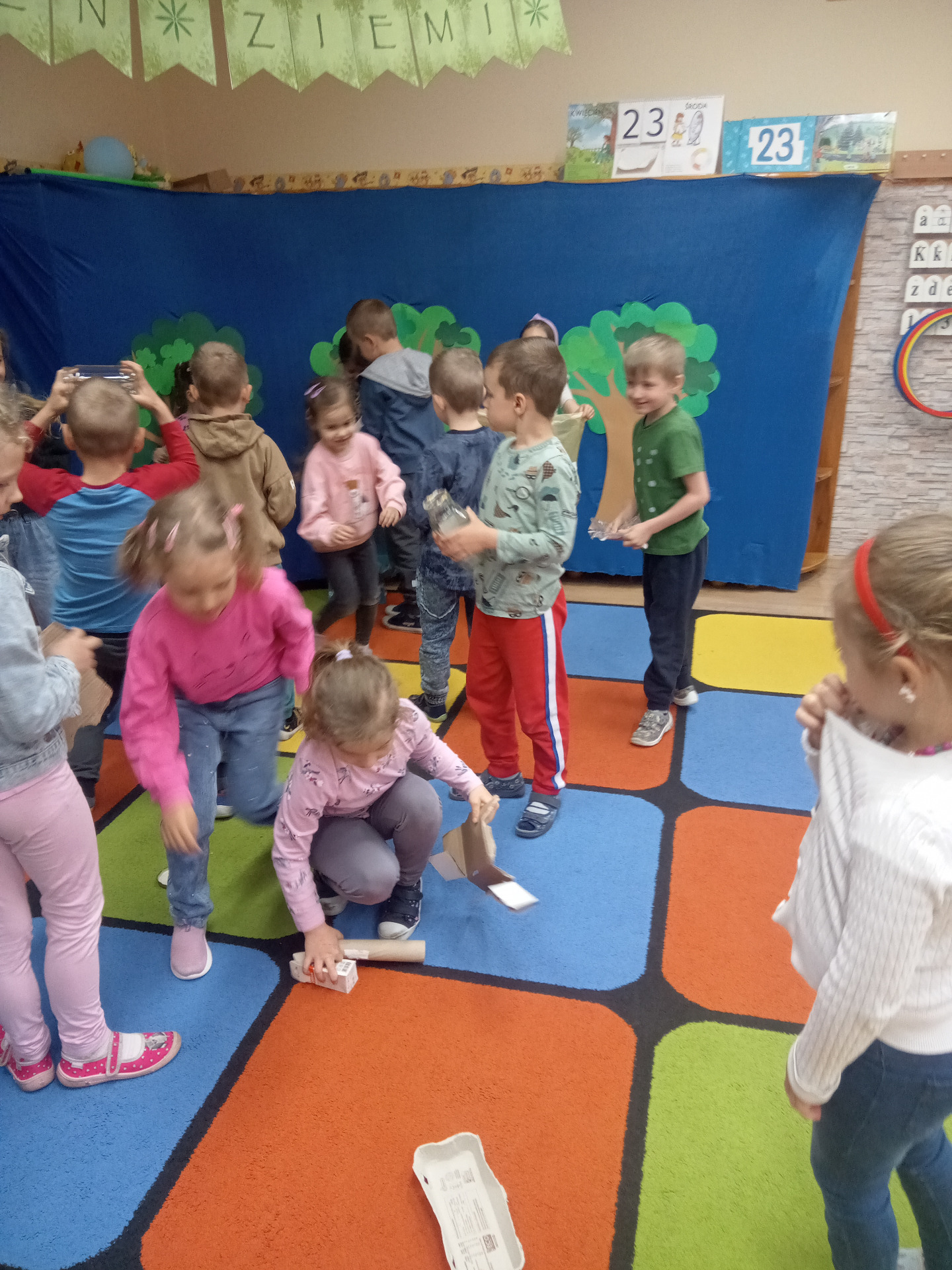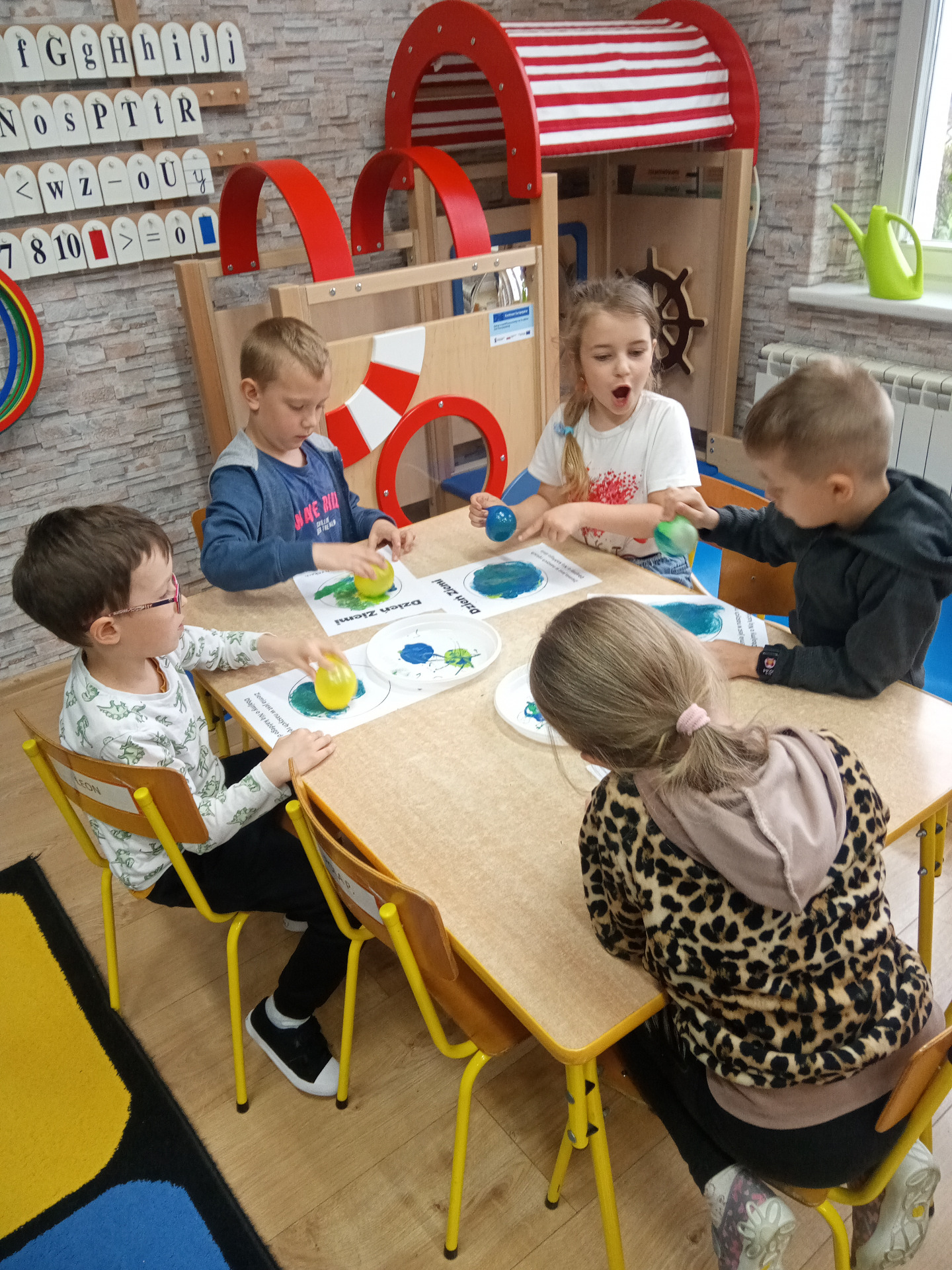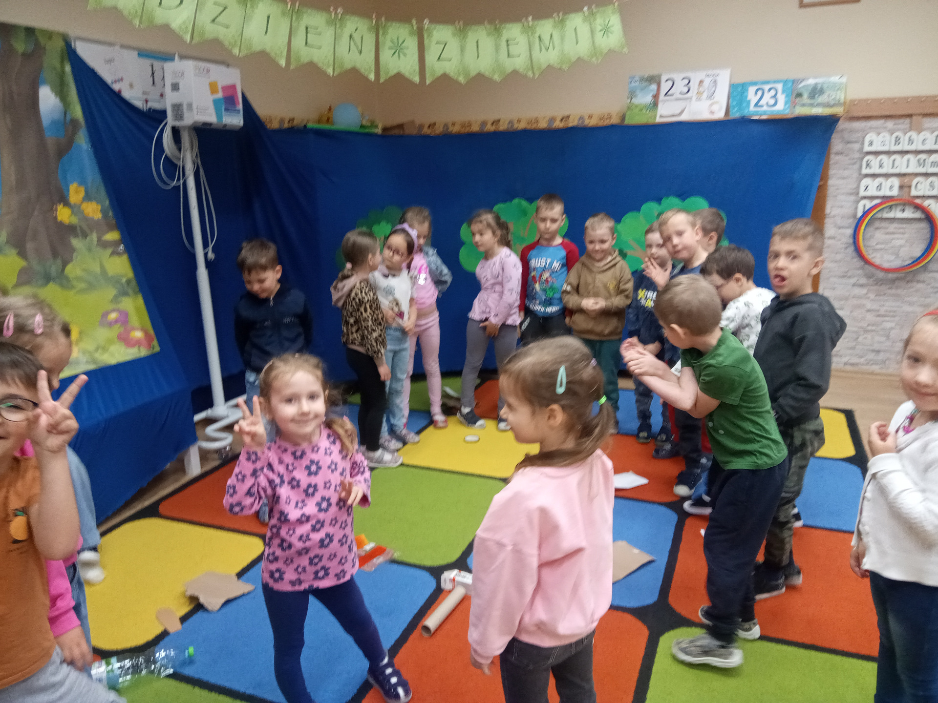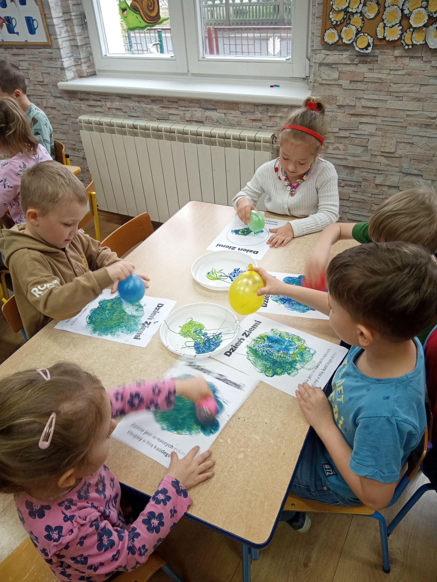 W miniony piątek grupa „Motylków” świętowała Dzień Ziemi. Dzieci wzięły udział w ciekawej pogadance na temat naszej planety – dowiedziały sie , jak dbać o Ziemię, jakie nawyki są dobre ( np. gaszenie światła, oszczedzanie wody, zbieranie śmieci), a jakie szkodzą środowisku (np. wyrzucanie smieci na ulicę, czy w parkach, marnowanie jedzenia). Przedszkolaki poznały również słowo ” recykling”, segregowały śmieci do odpowiednich pojemników. Kolejnym punktem dnia była gra ekologiczna, która utrwalała wiedzę o ochronie środowiska w formie zabawy. „Motylki” śpiewały także piosenki o Ziemi i przyrodzie, okazując troskę i miłość do naszej planety. Na zakończenie dzieci wykonałay prace plastyczne przedstawiającą Ziemię. Prace zostay wykonane dwoma technikami – malowanie balonem oraz farbami w i druga technika – wyklejanie planety bibułą karbowaną. Każda praca wykonana przez dzieci jest wyjątkowa i pokazuje, jak wiele serca dzieci wkładają w troskę o nasz wspólny dom. Przypominamy, że każda , nawet najmniejsza, ekodziałalność ma znaczenie.