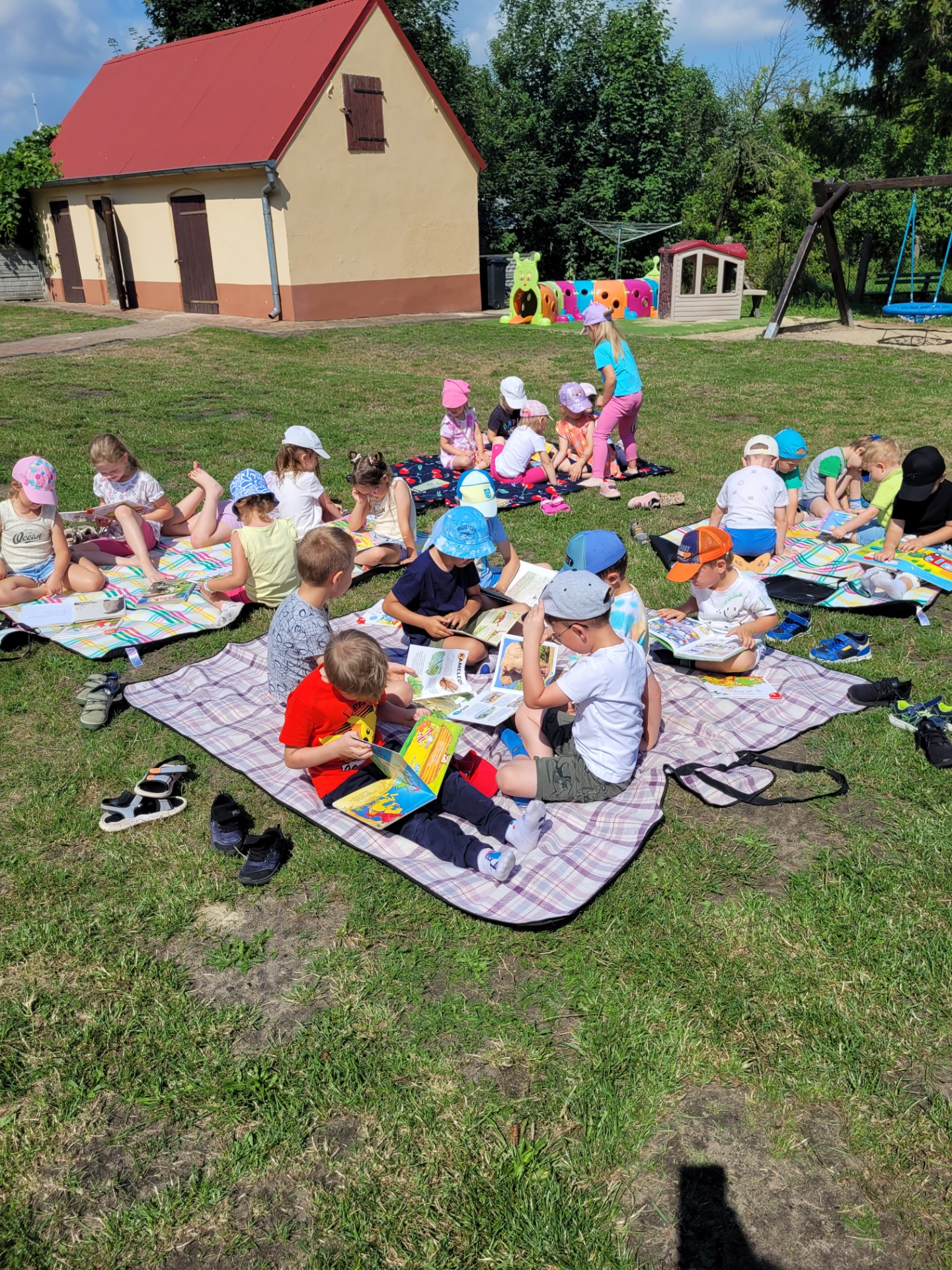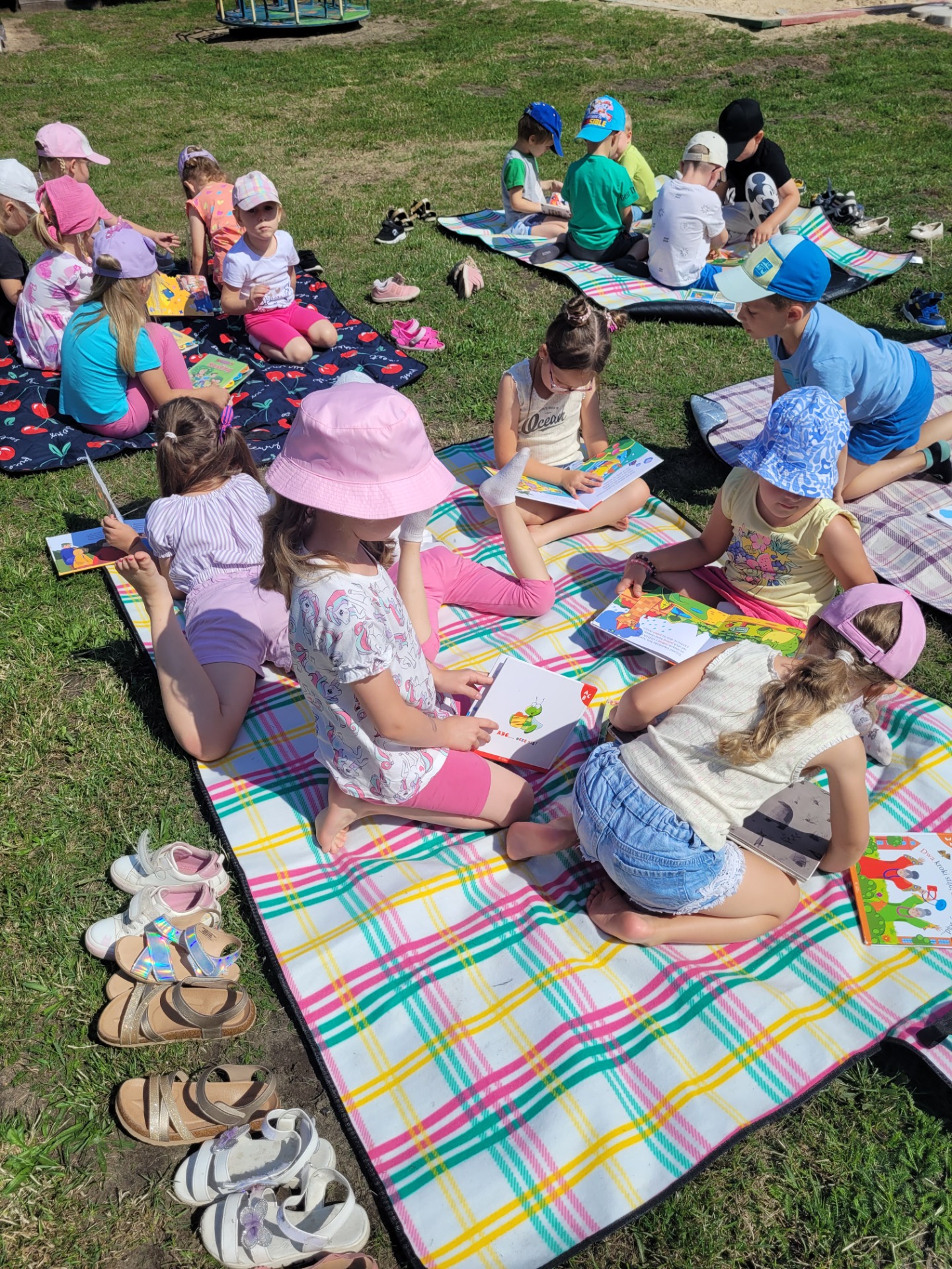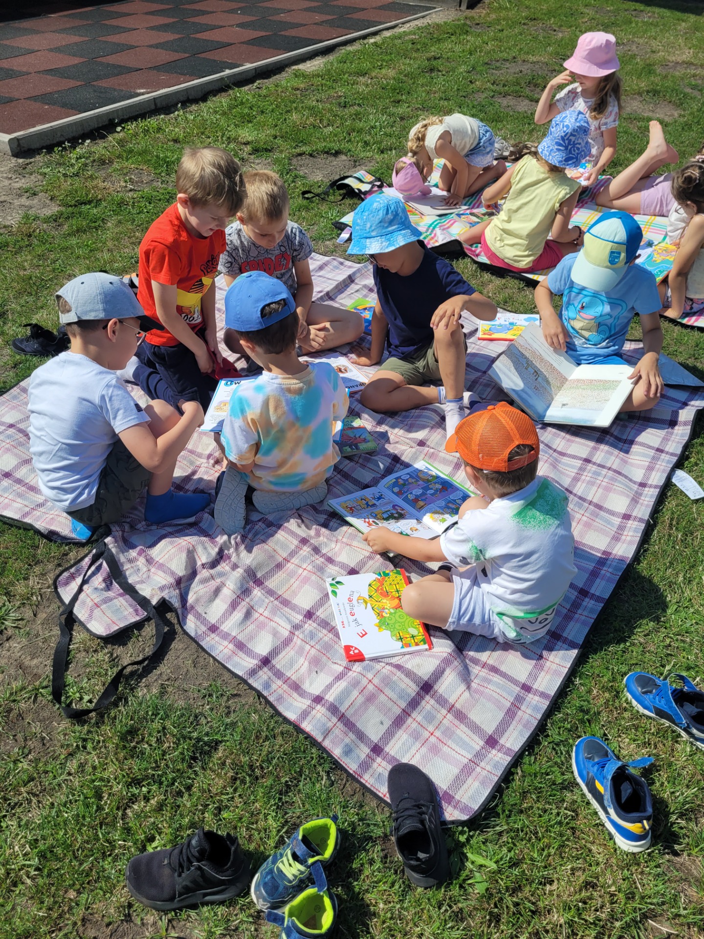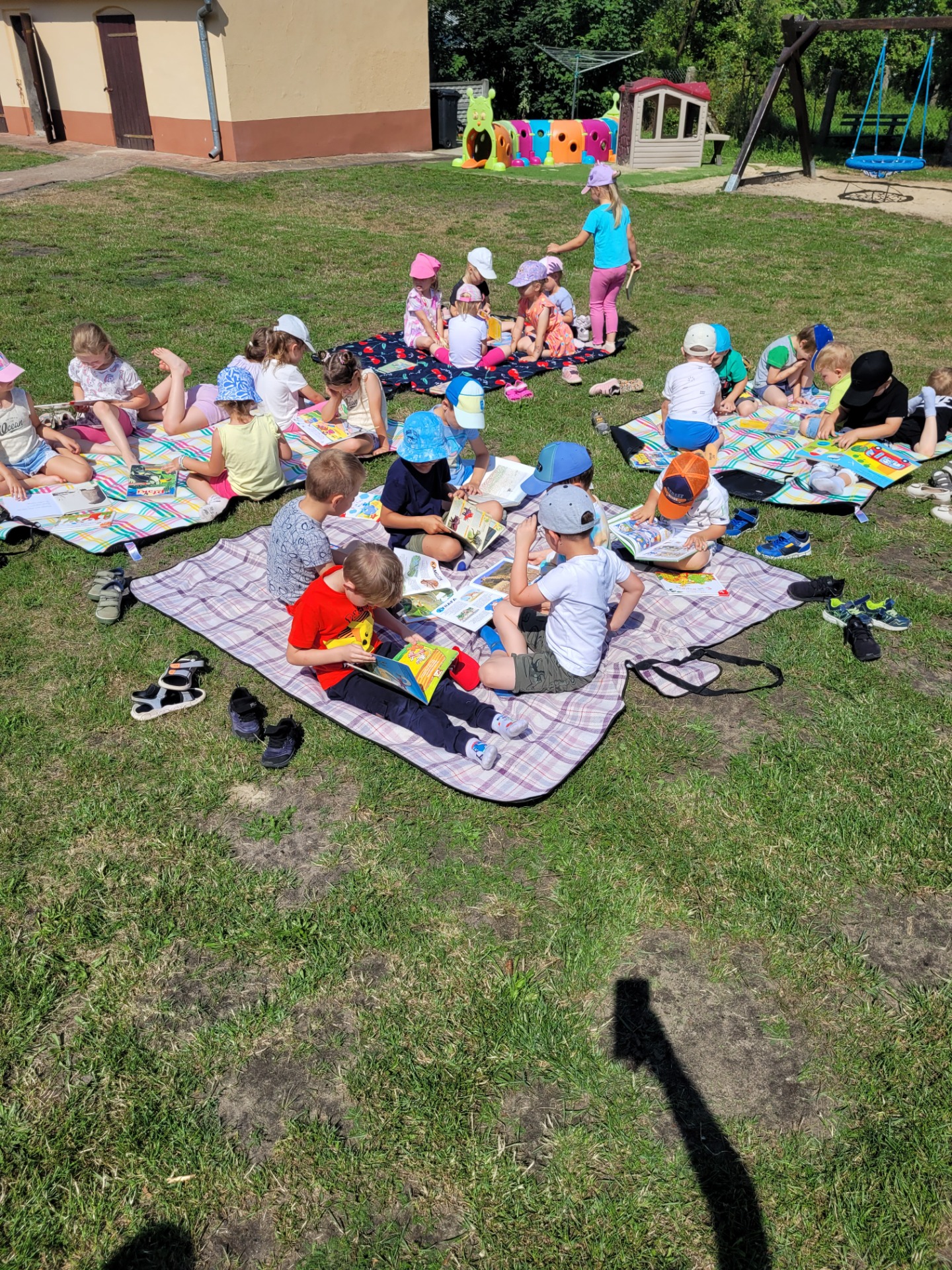 Nasze przedszkolaki spisały się doskonale. Korzystając z pięknej pogody, zabraliśmy koce, książki i wyruszyliśmy do ogrodu przedszkolnego. Dzieciom bardzo podobał się ten rodzaj aktywności na świeżym powietrzu.