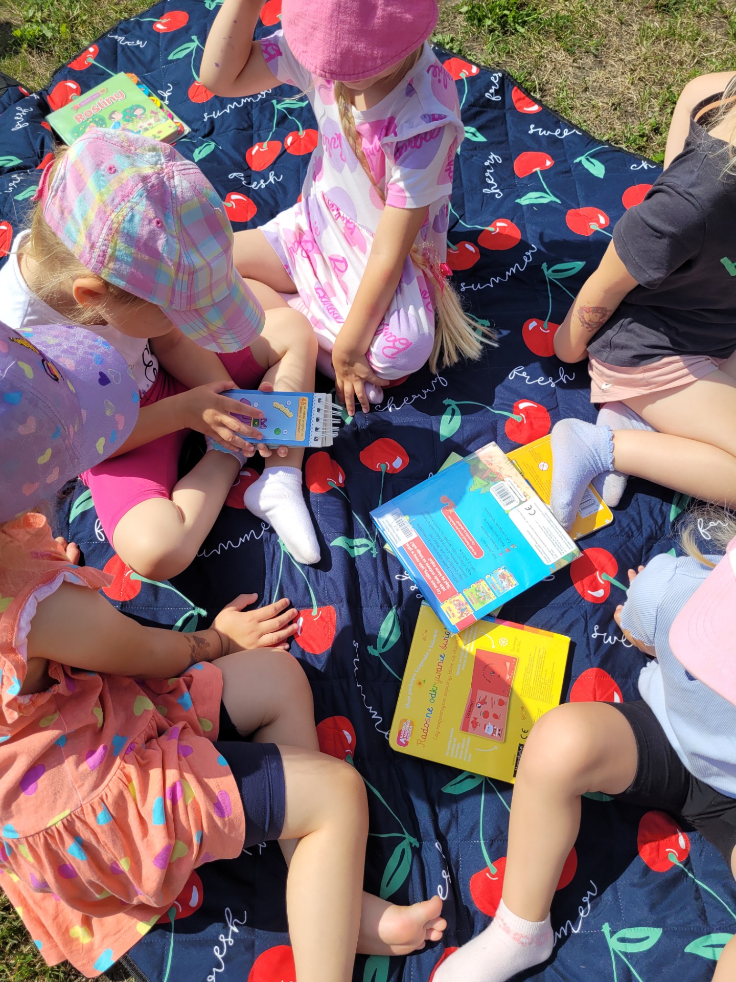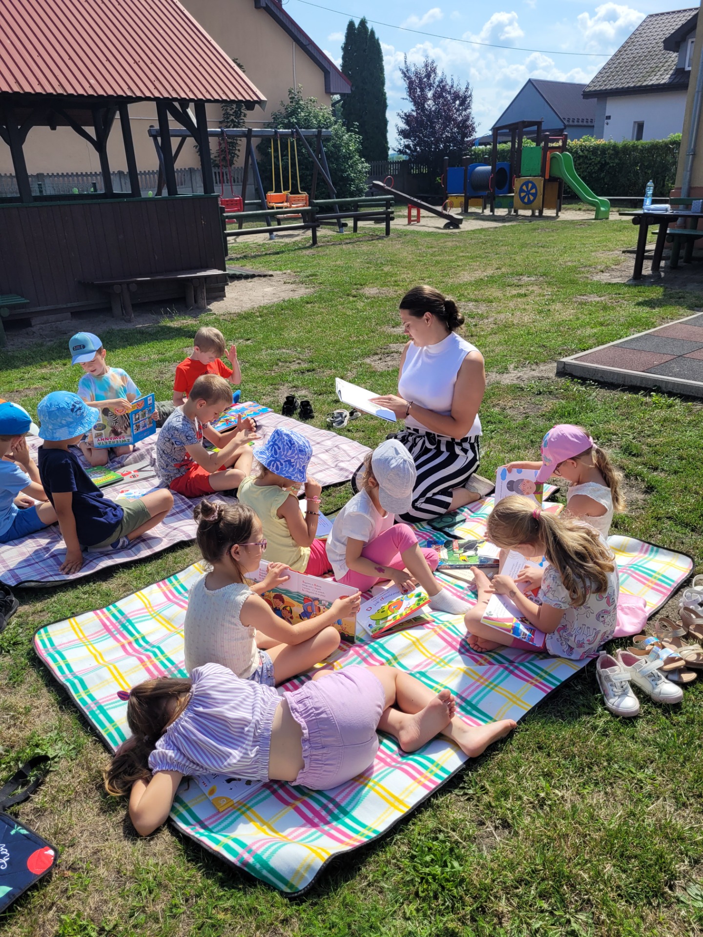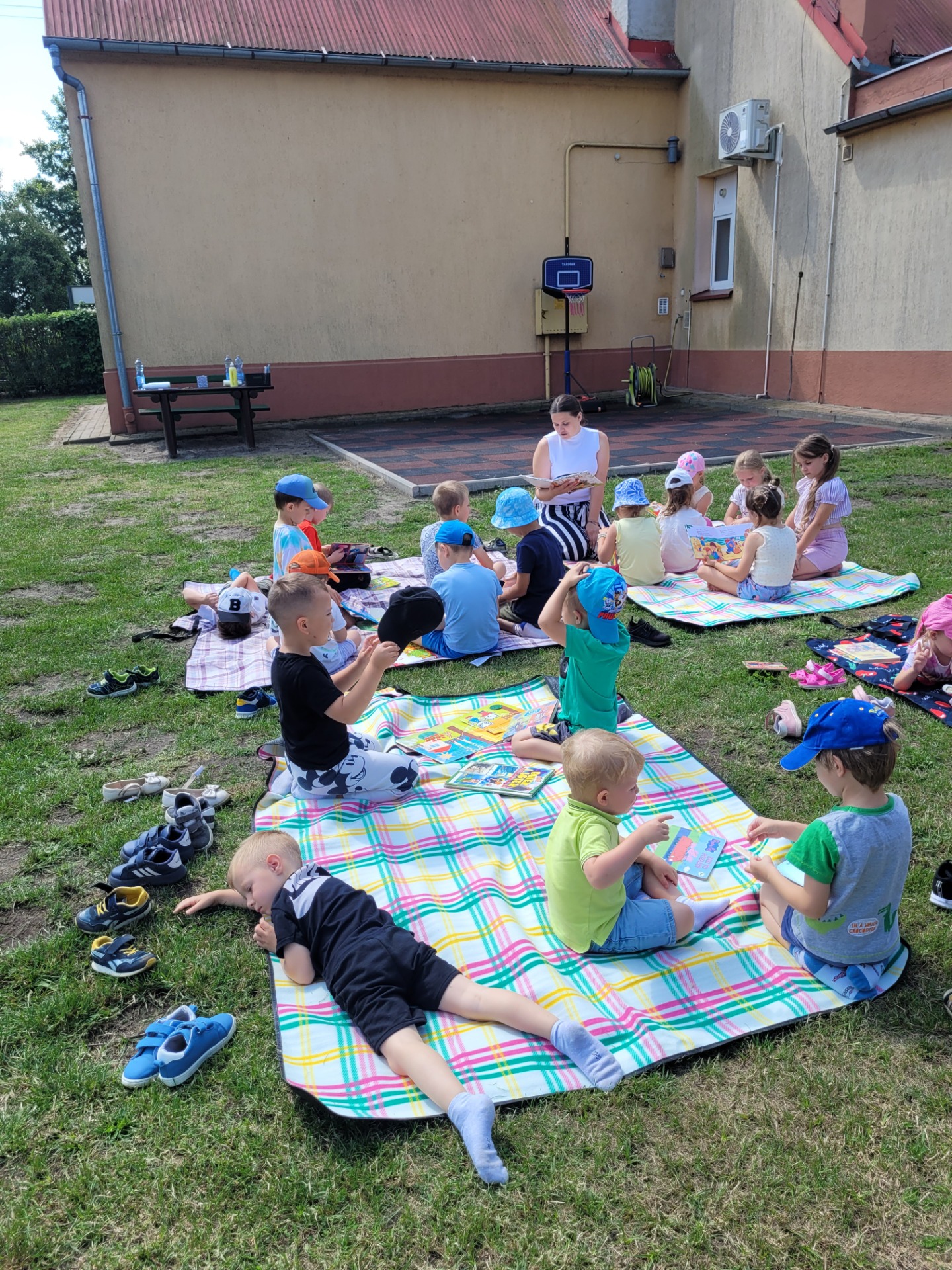 Nasze przedszkolaki spisały się doskonale. Korzystając z pięknej pogody, zabraliśmy koce, książki i wyruszyliśmy do ogrodu przedszkolnego. Dzieciom bardzo podobał się ten rodzaj aktywności na świeżym powietrzu.