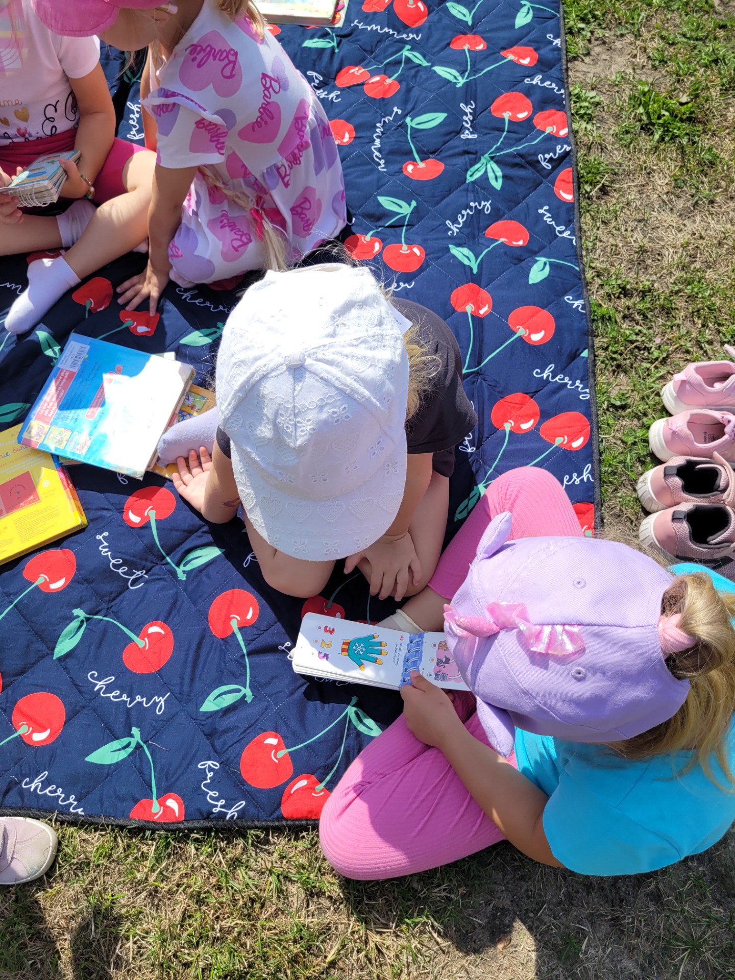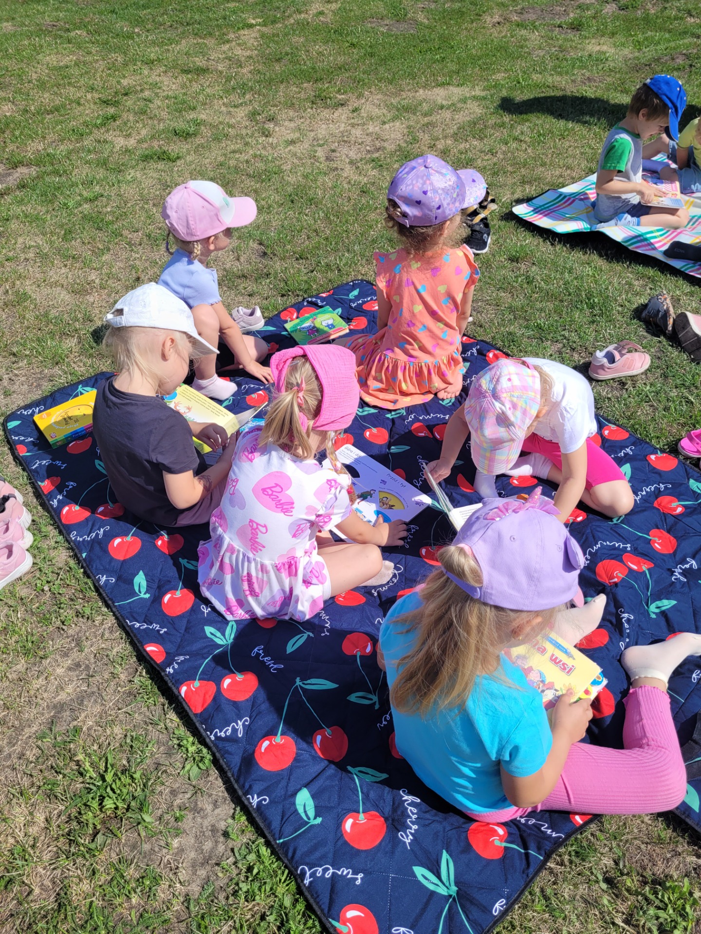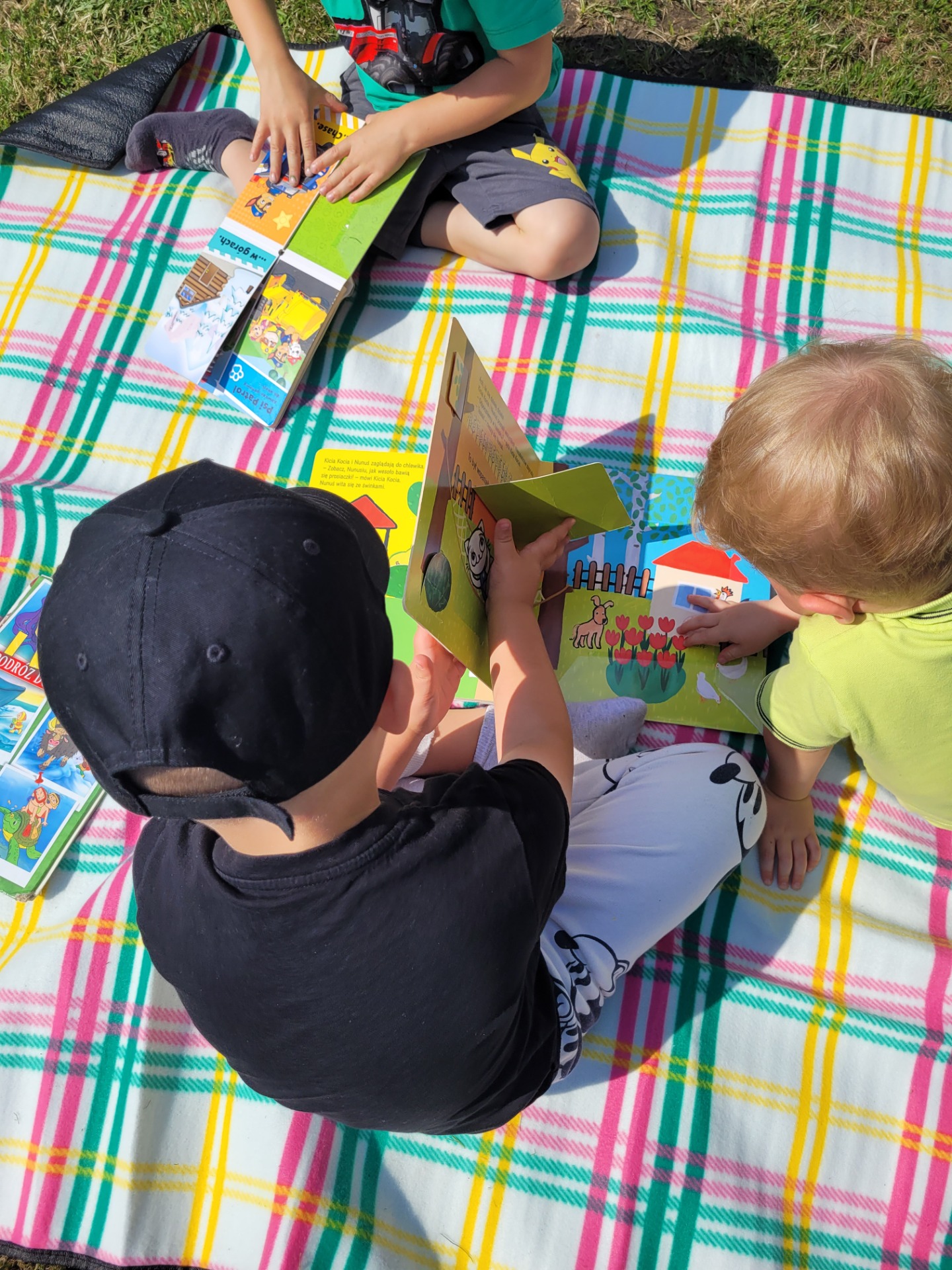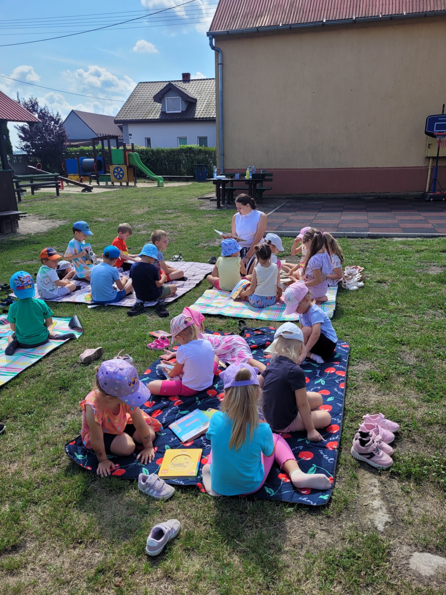 Nasze przedszkolaki spisały się doskonale. Korzystając z pięknej pogody, zabraliśmy koce, książki i wyruszyliśmy do ogrodu przedszkolnego. Dzieciom bardzo podobał się ten rodzaj aktywności na świeżym powietrzu.