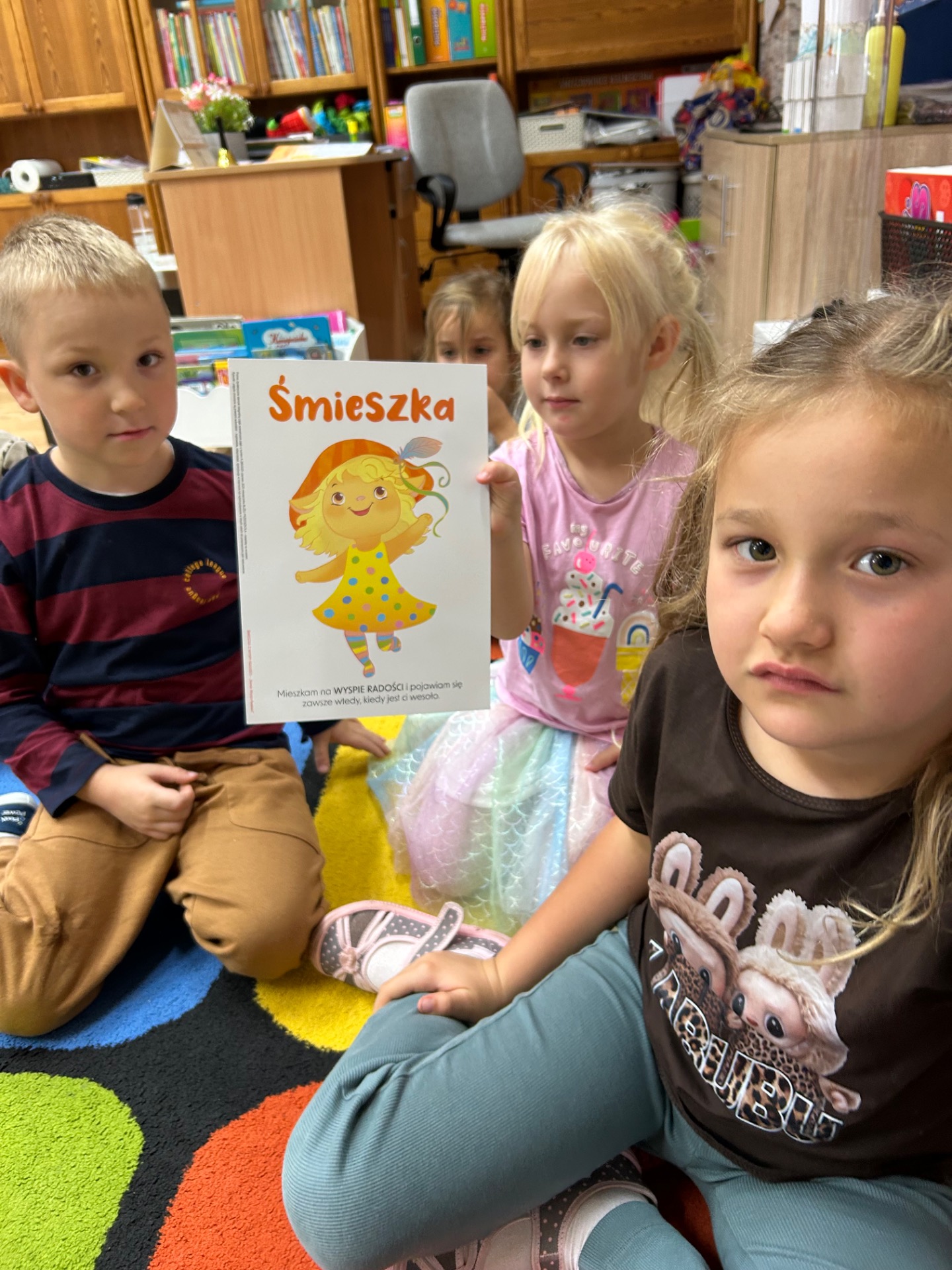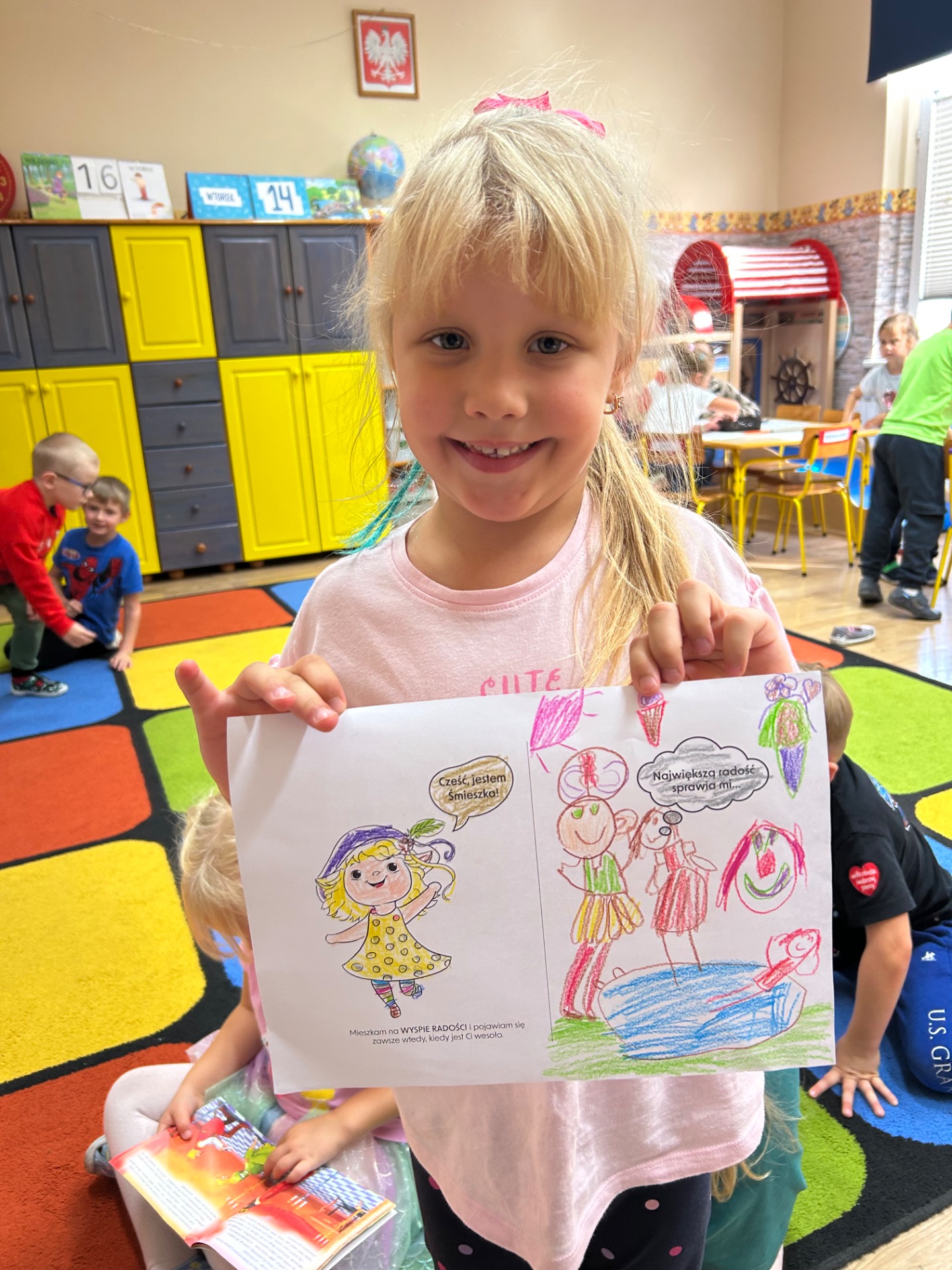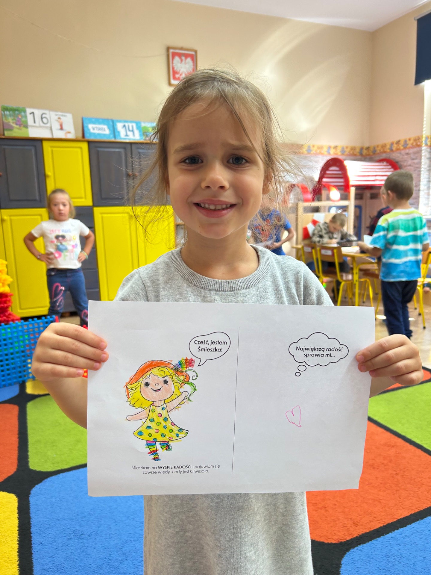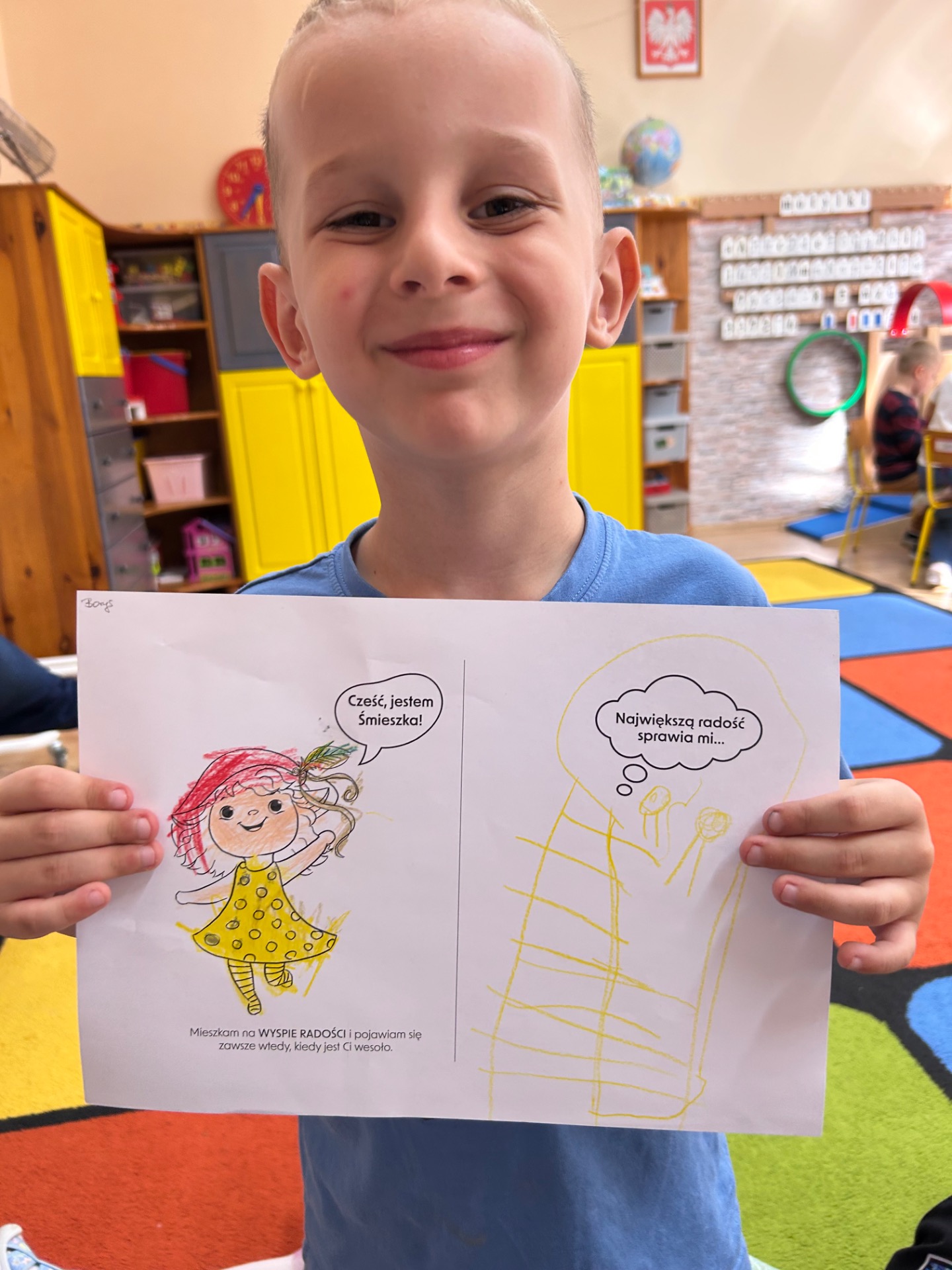 Pierwszą bohaterką, którą poznaliśmy, była Śmieszka z Wyspy Radości. Dzieci z ogromnym zaangażowaniem odkrywały, czym jest radość, jak można ją wyrażać i dzielić się nią z innymi. Rozmawialiśmy o chwilach, które sprawiają, że się uśmiechamy, bawiliśmy się w wesołe zabawy ruchowe, a także uczyliśmy się, jak zauważać dobre rzeczy wokół nas.