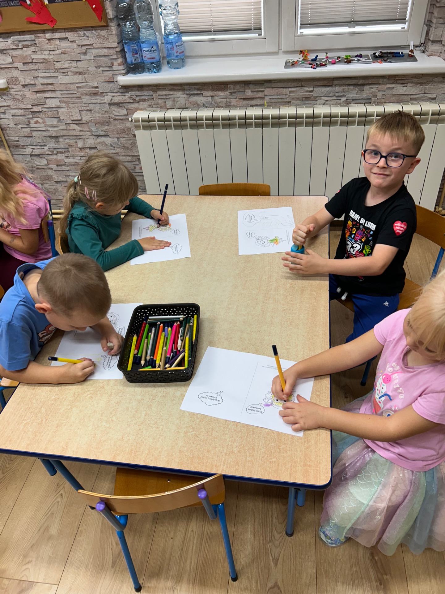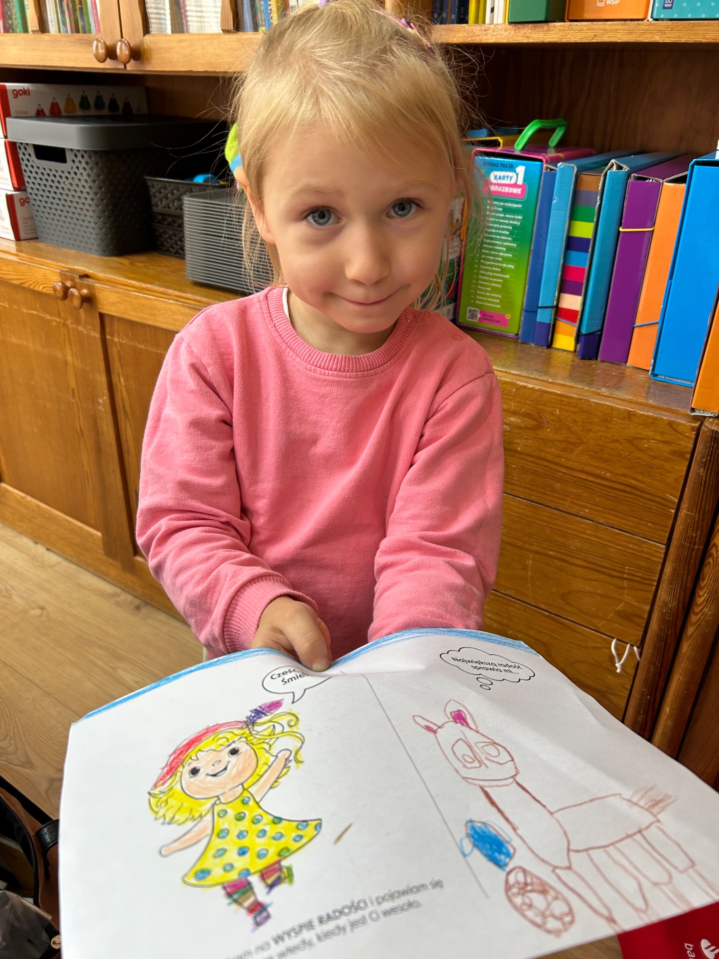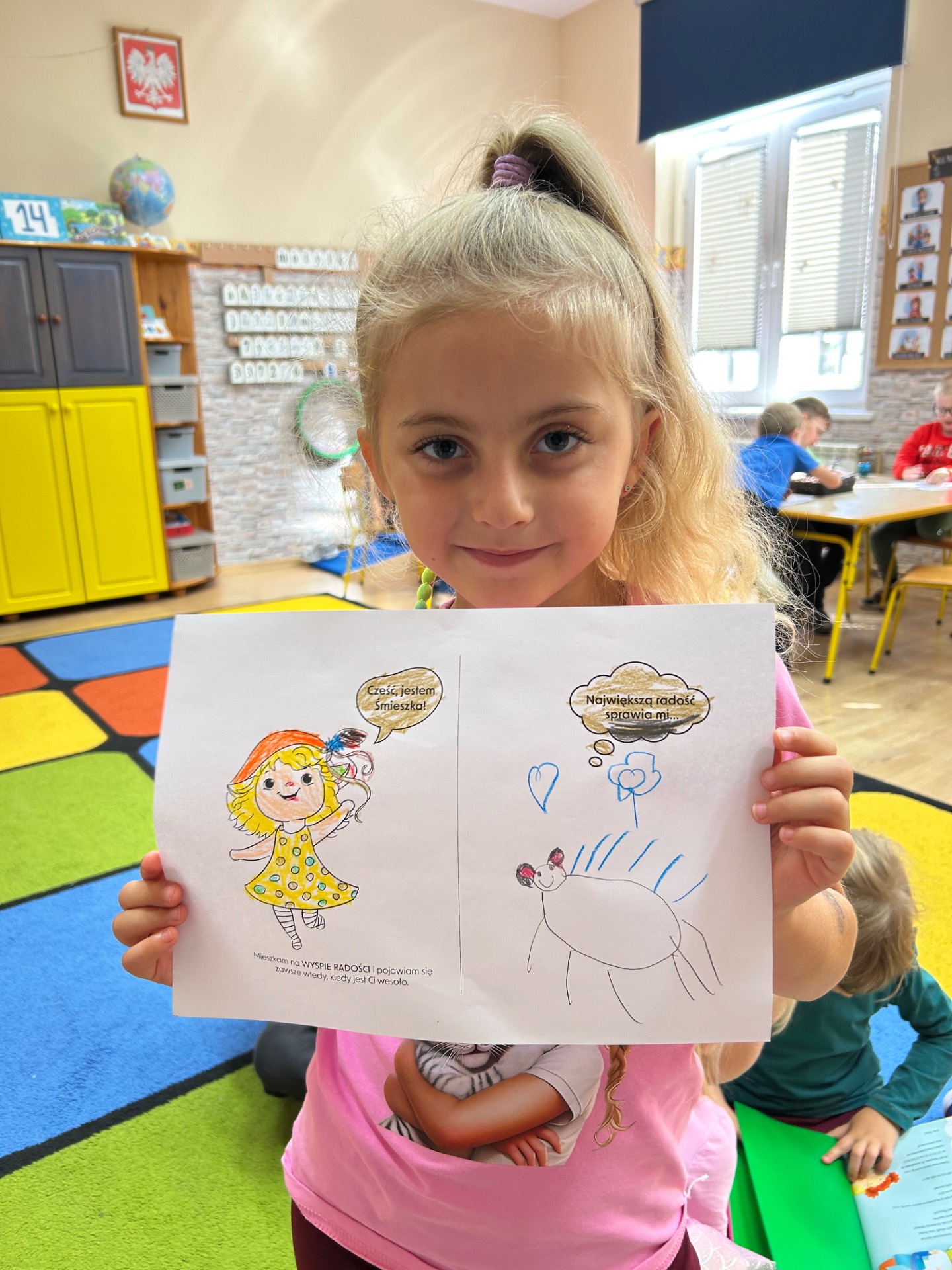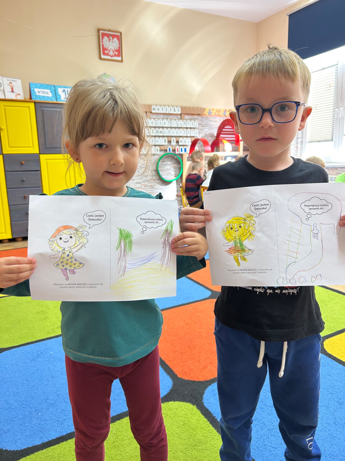 Pierwszą bohaterką, którą poznaliśmy, była Śmieszka z Wyspy Radości. Dzieci z ogromnym zaangażowaniem odkrywały, czym jest radość, jak można ją wyrażać i dzielić się nią z innymi. Rozmawialiśmy o chwilach, które sprawiają, że się uśmiechamy, bawiliśmy się w wesołe zabawy ruchowe, a także uczyliśmy się, jak zauważać dobre rzeczy wokół nas.