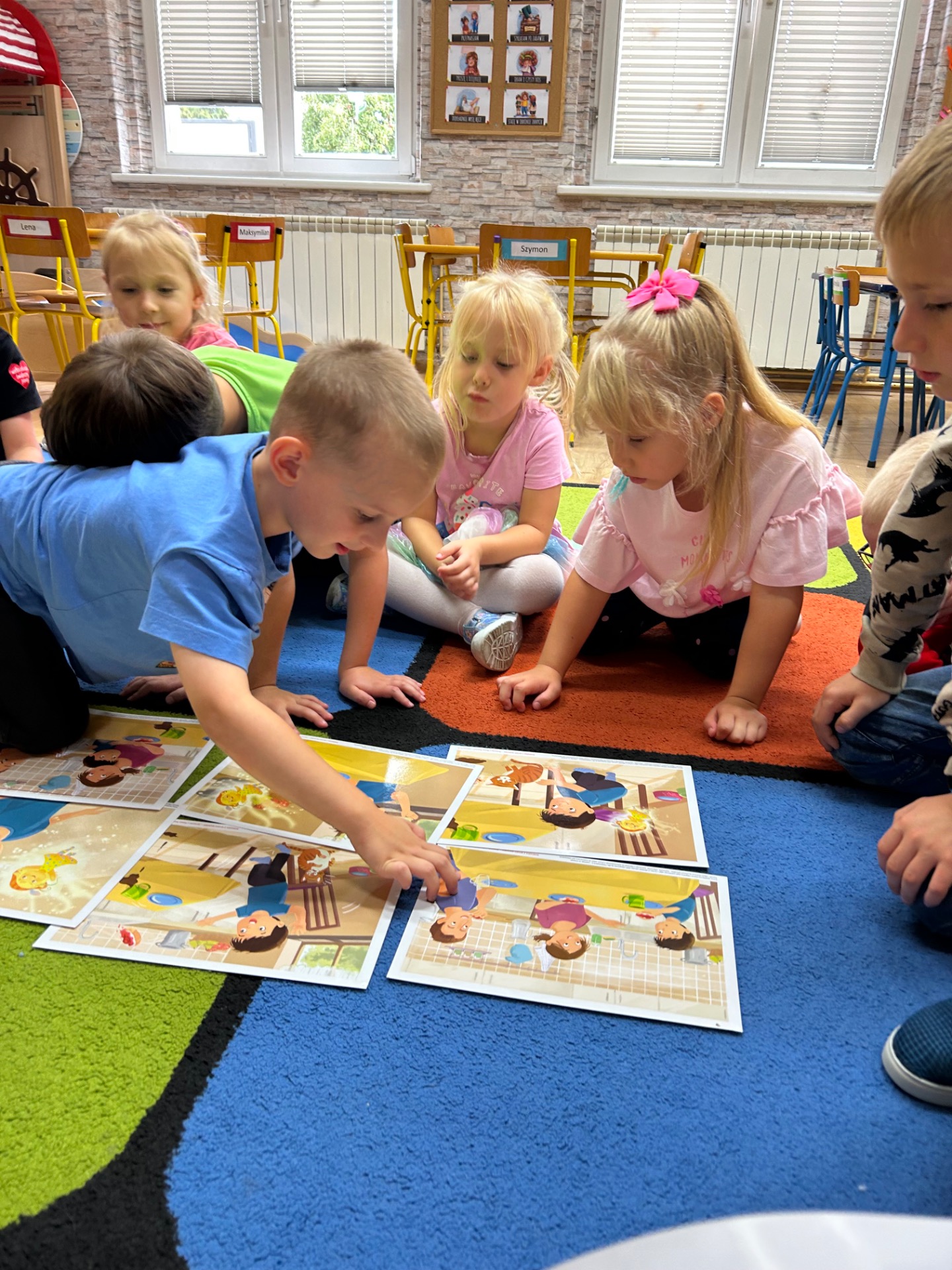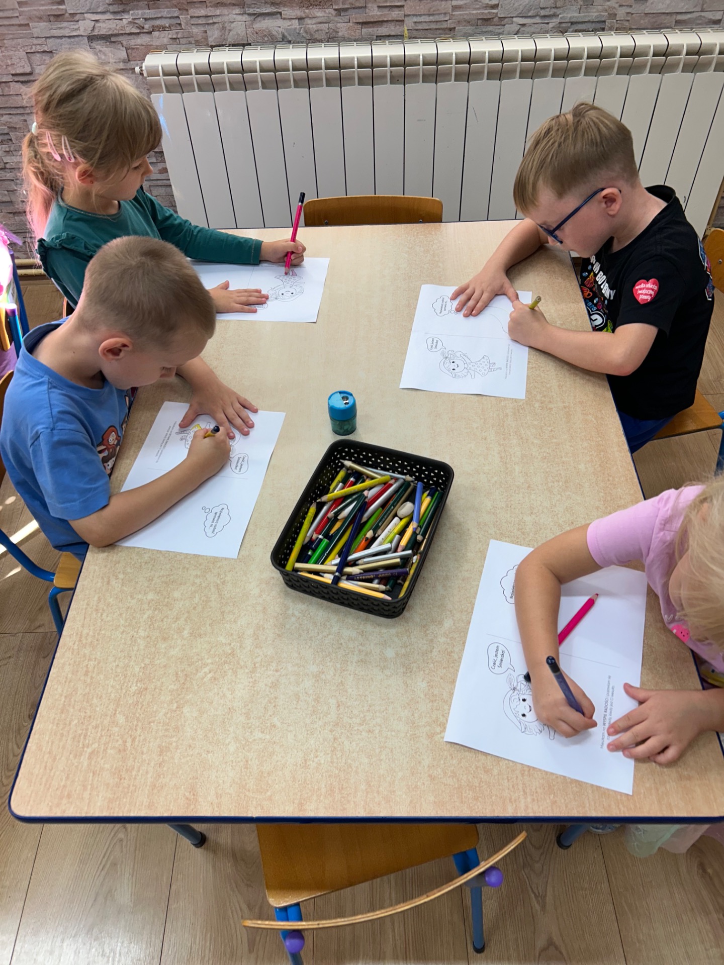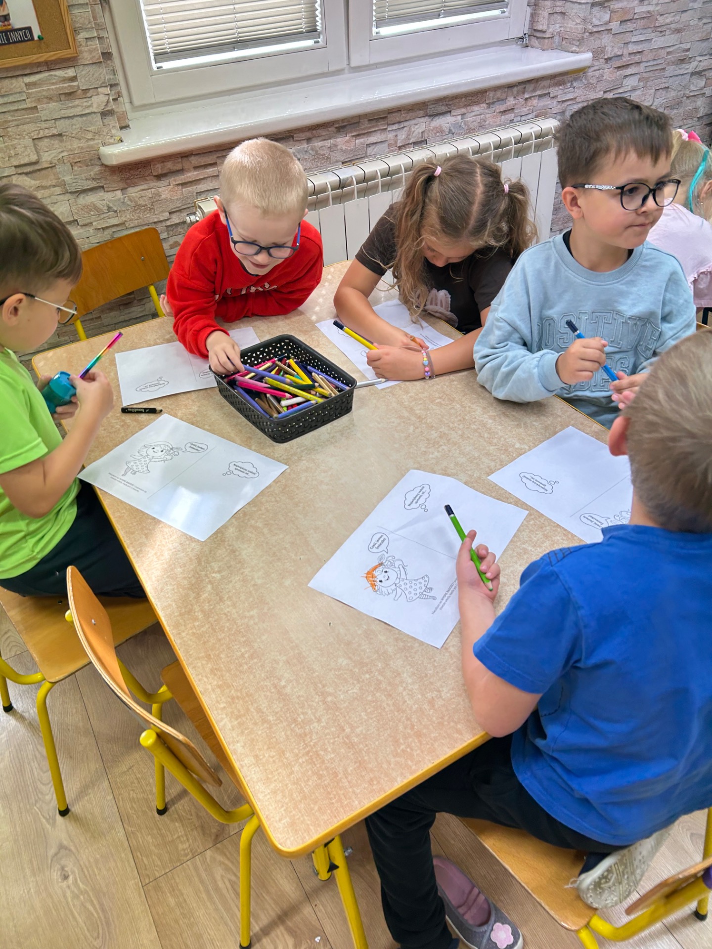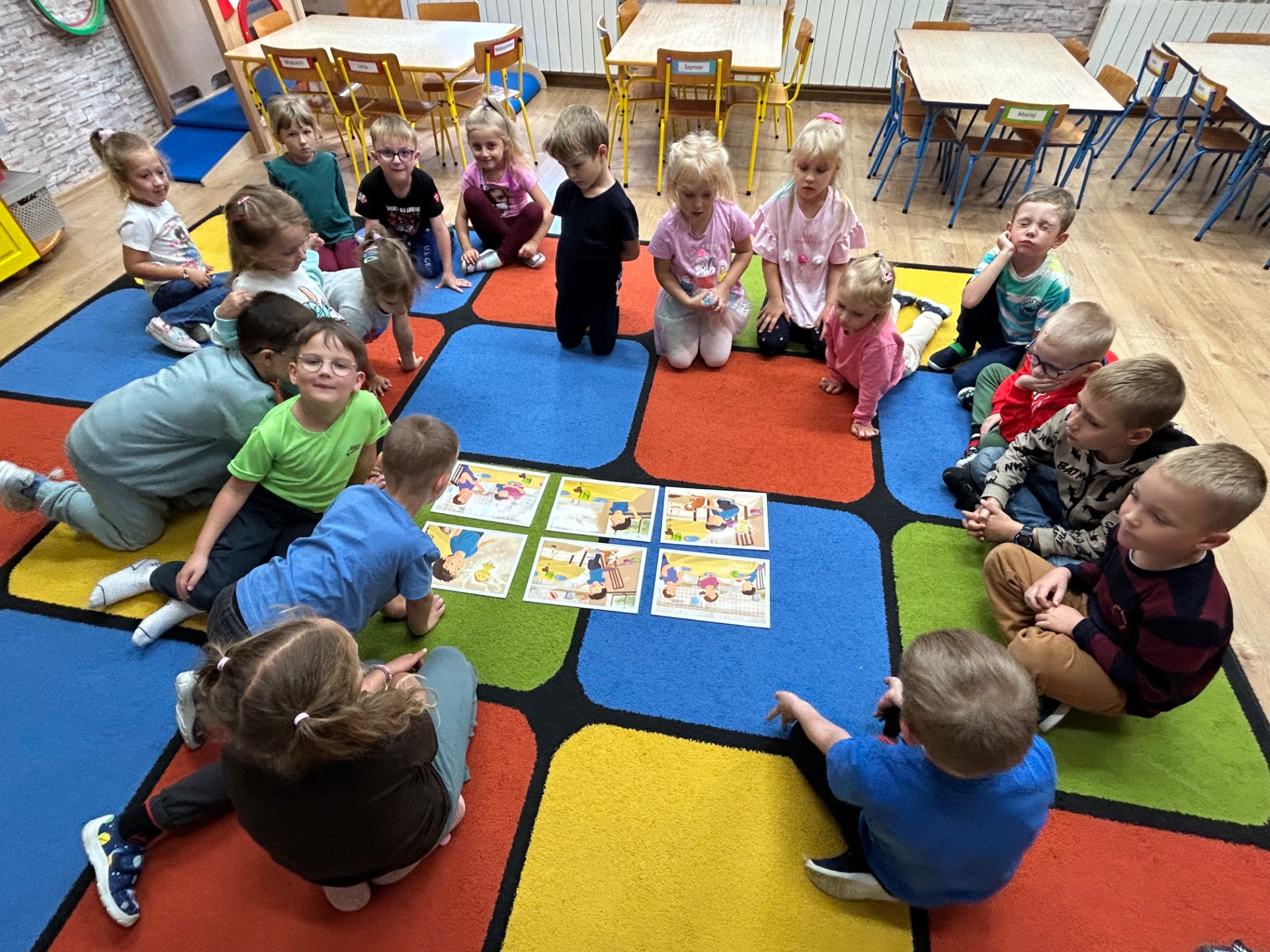 Pierwszą bohaterką, którą poznaliśmy, była Śmieszka z Wyspy Radości. Dzieci z ogromnym zaangażowaniem odkrywały, czym jest radość, jak można ją wyrażać i dzielić się nią z innymi. Rozmawialiśmy o chwilach, które sprawiają, że się uśmiechamy, bawiliśmy się w wesołe zabawy ruchowe, a także uczyliśmy się, jak zauważać dobre rzeczy wokół nas.