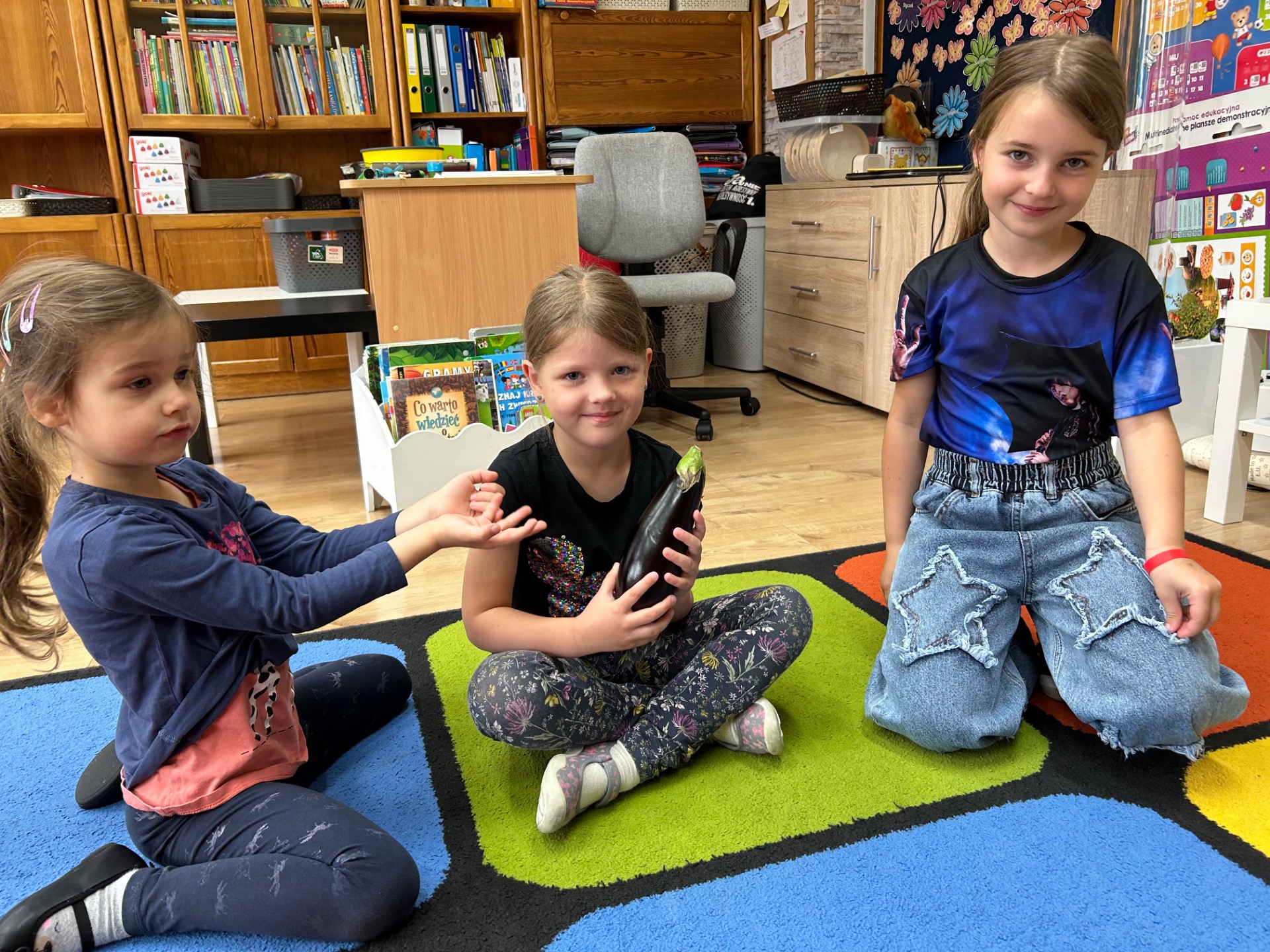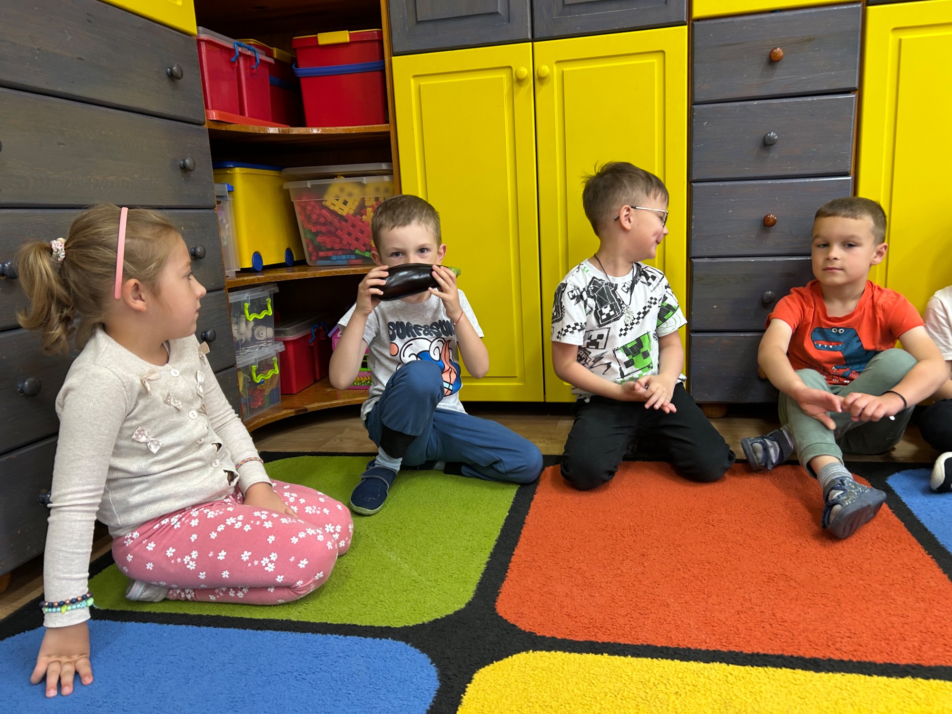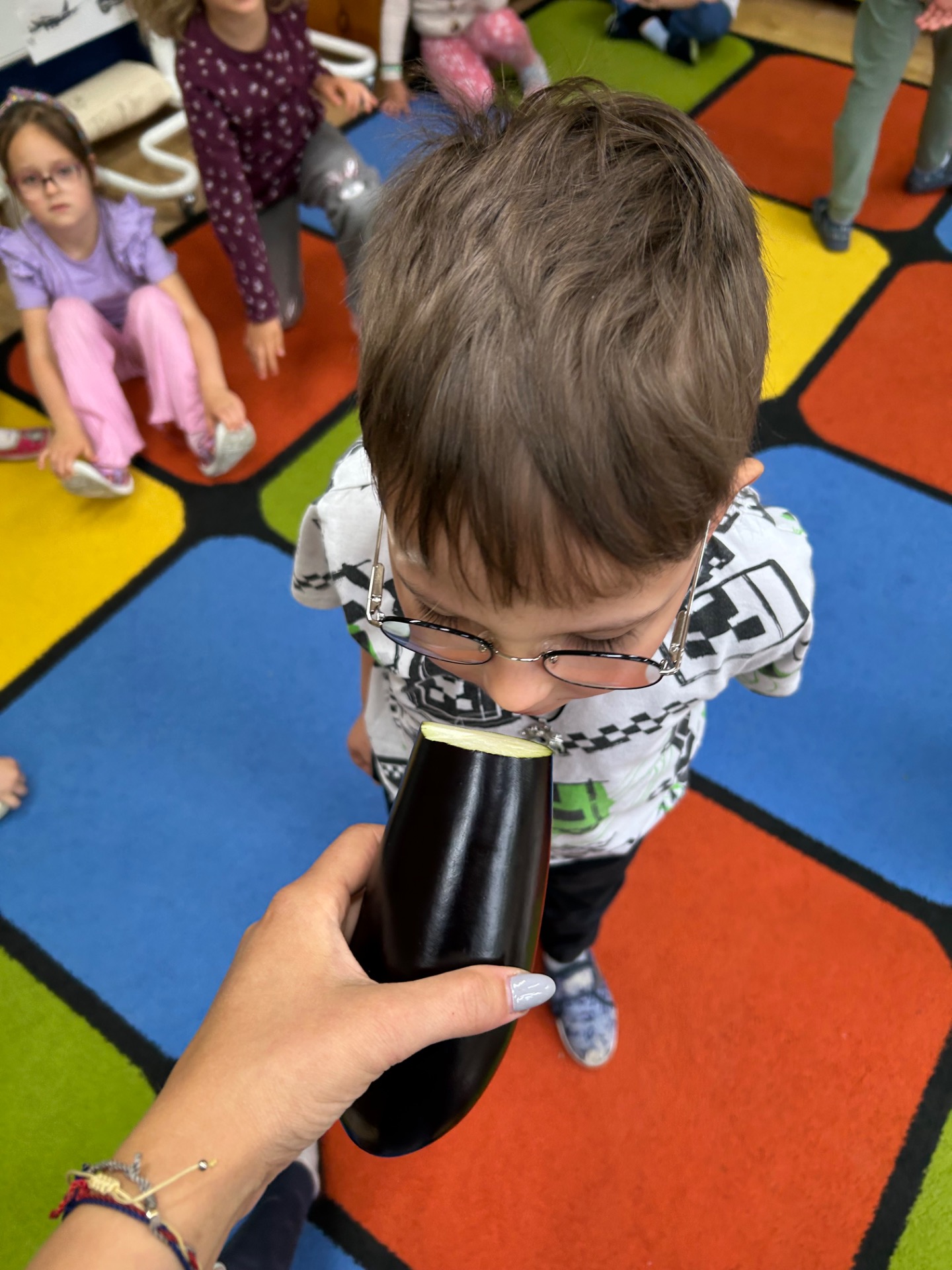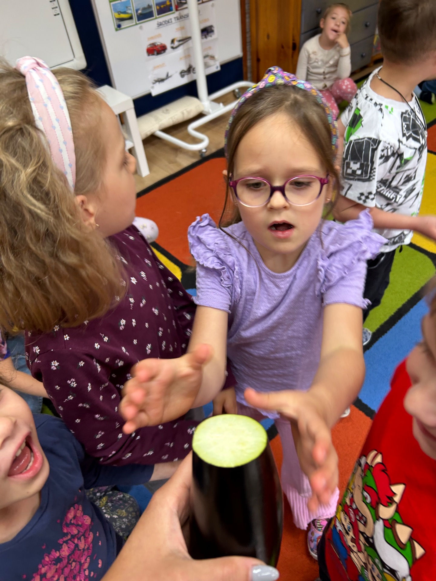 Dzieci z zainteresowaniem poznawały jego wygląd, strukturę i właściwości. Dowiedziały się, skąd pochodzi bakłażan, do czego można go wykorzystać w kuchni, a nawet miały okazję go dotknąć, powąchać i… spróbować!