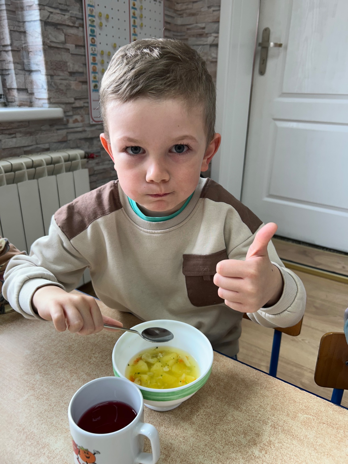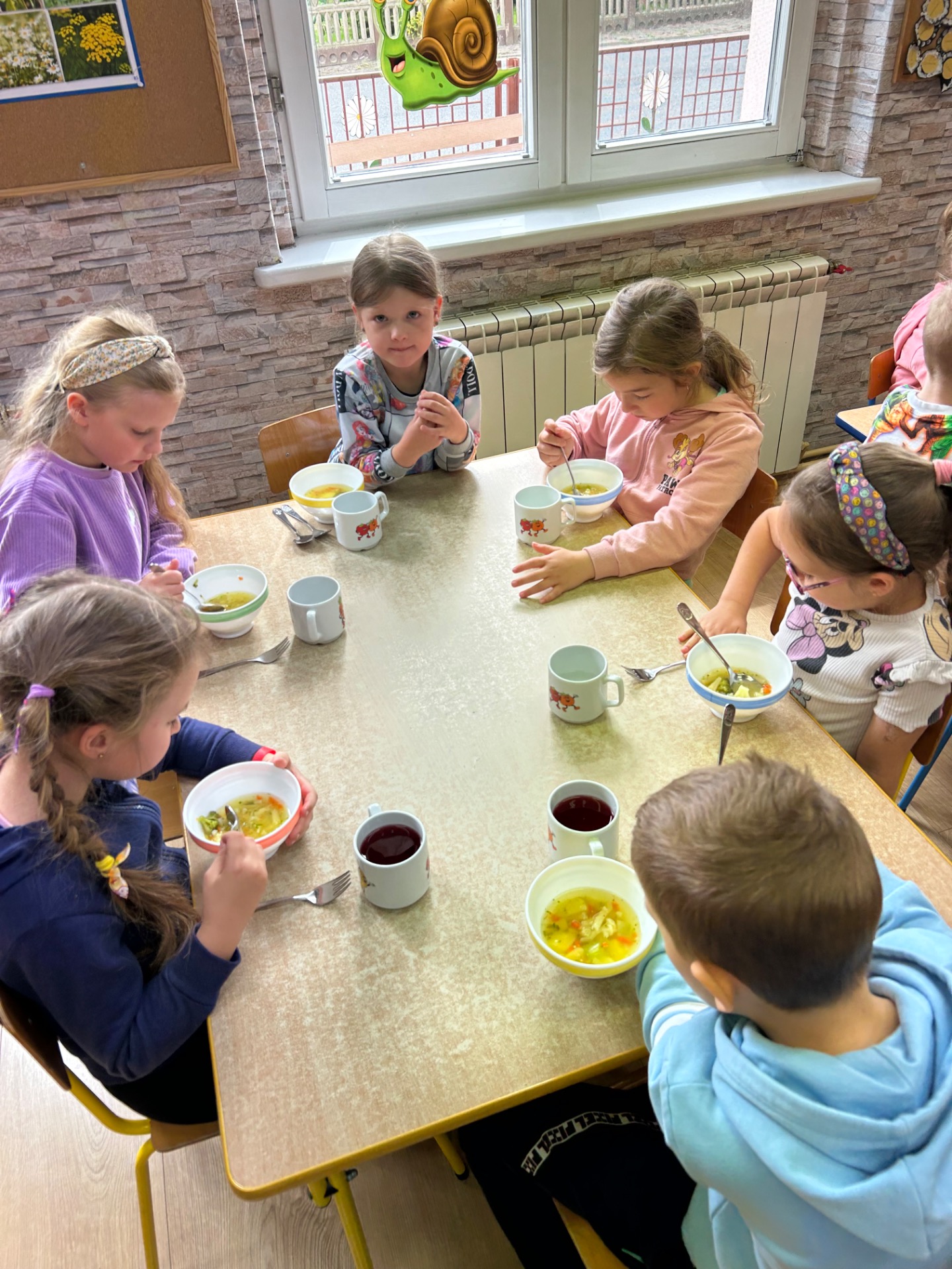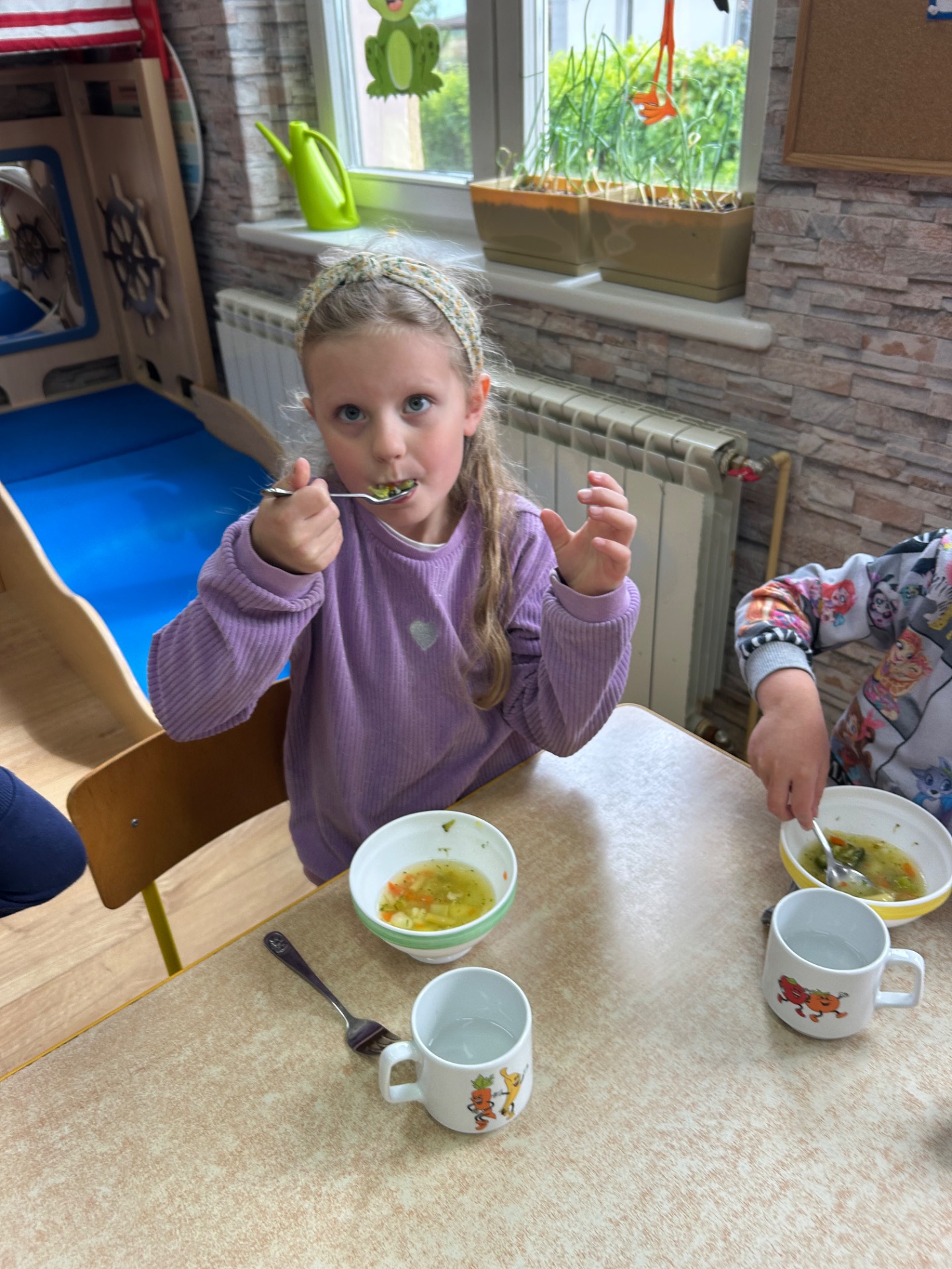Na zakończenie naszego spotkania czekała na nas pyszna niespodzianka – wspólnie spróbowaliśmy zupy z fasolką! Dzieci z wielkim apetytem kosztowały danie, a niektóre nawet poprosiły o dokładkę.