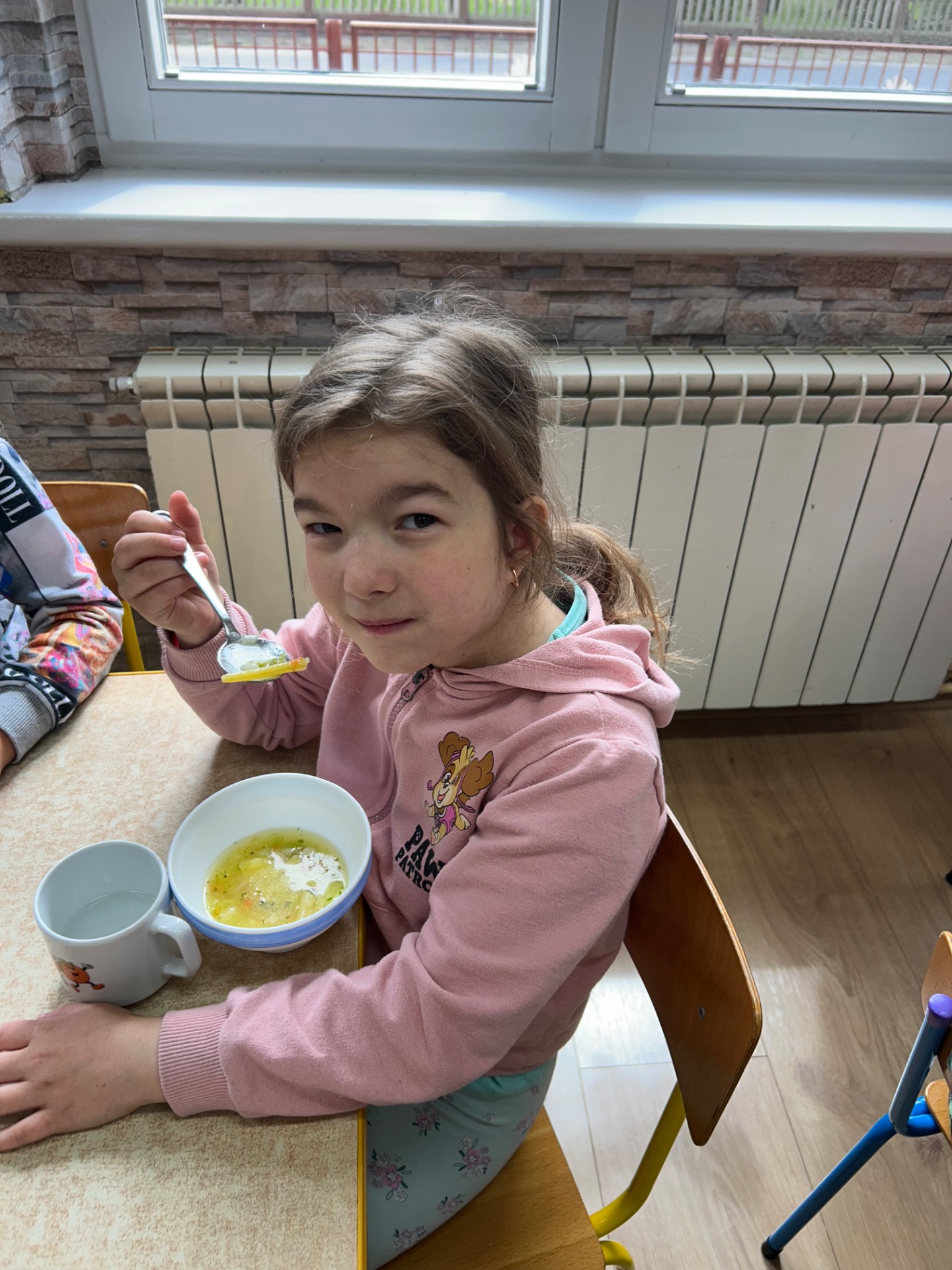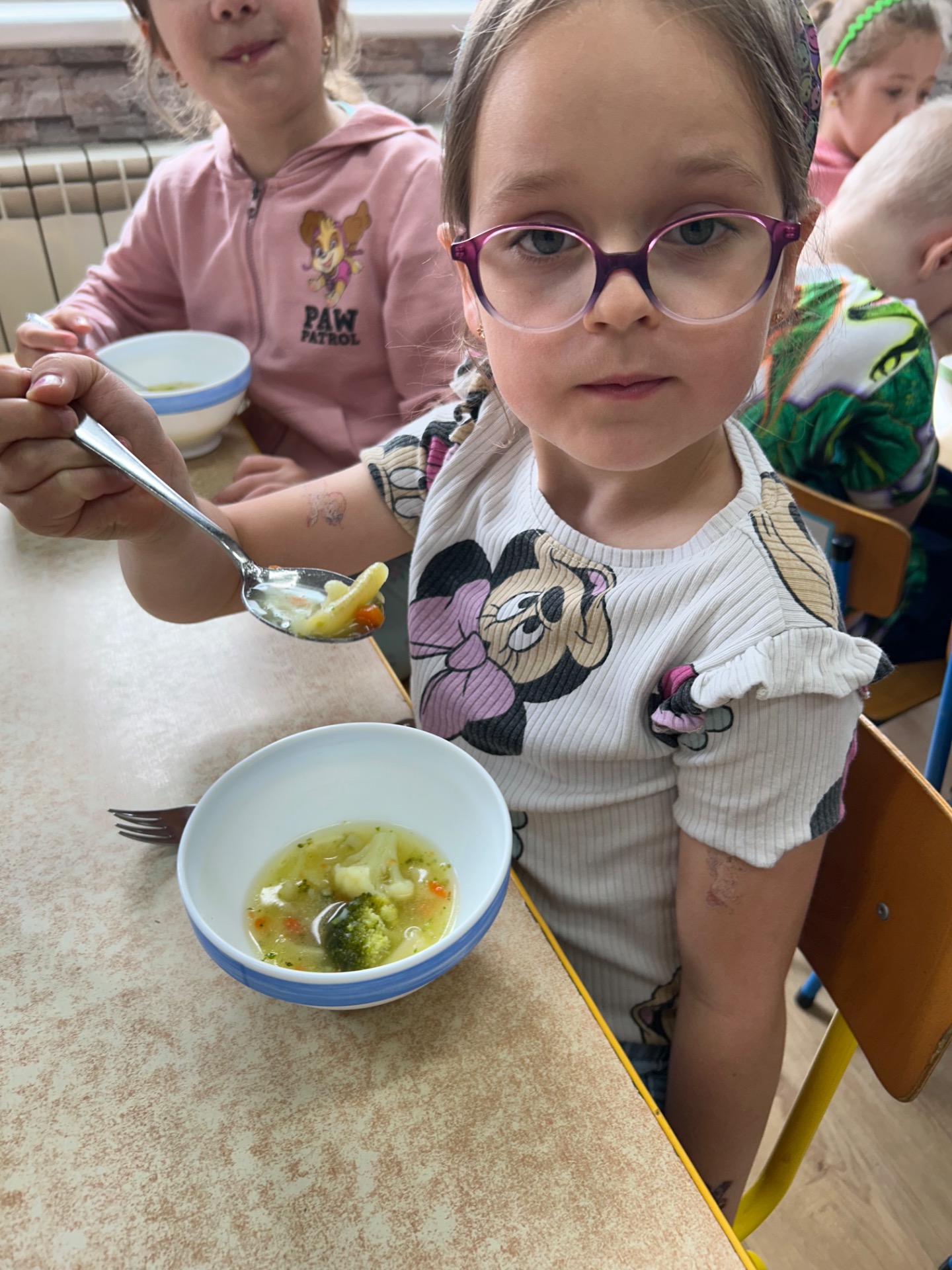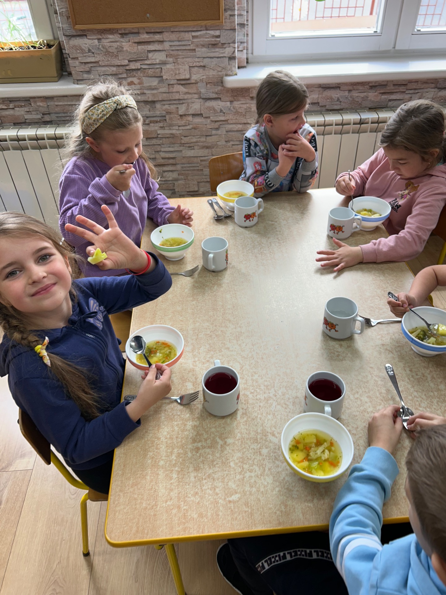 Na zakończenie naszego spotkania czekała na nas pyszna niespodzianka – wspólnie spróbowaliśmy zupy z fasolką! Dzieci z wielkim apetytem kosztowały danie, a niektóre nawet poprosiły o dokładkę.