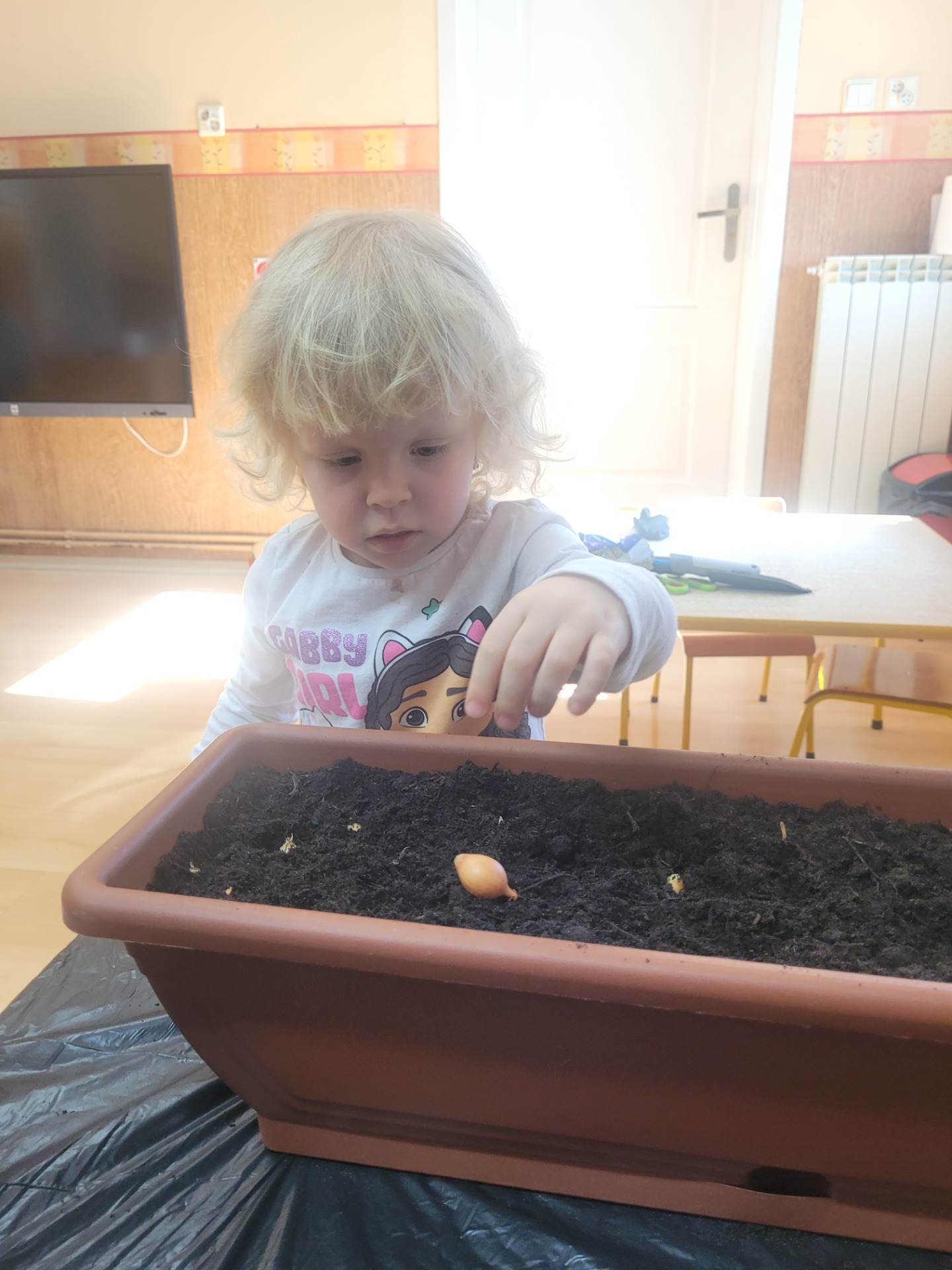 Każdy mały ogrodnik samodzielnie umieścił swoją cebulkę w ziemi. Dzieci były bardzo podekscytowane i już nie mogą się doczekać, kiedy na ich cebulkach pojawi się szczypiorek.