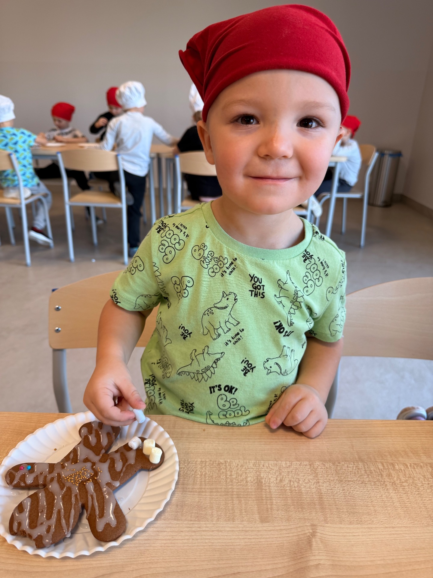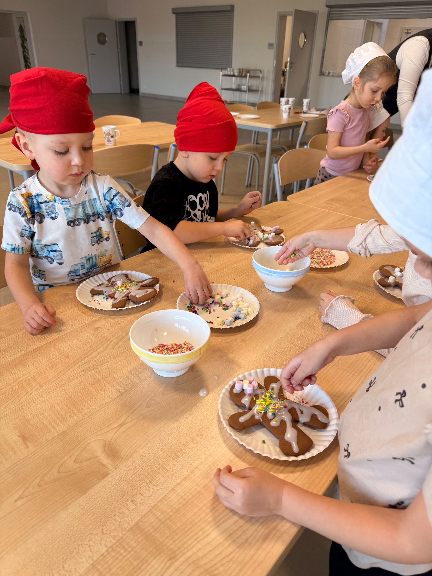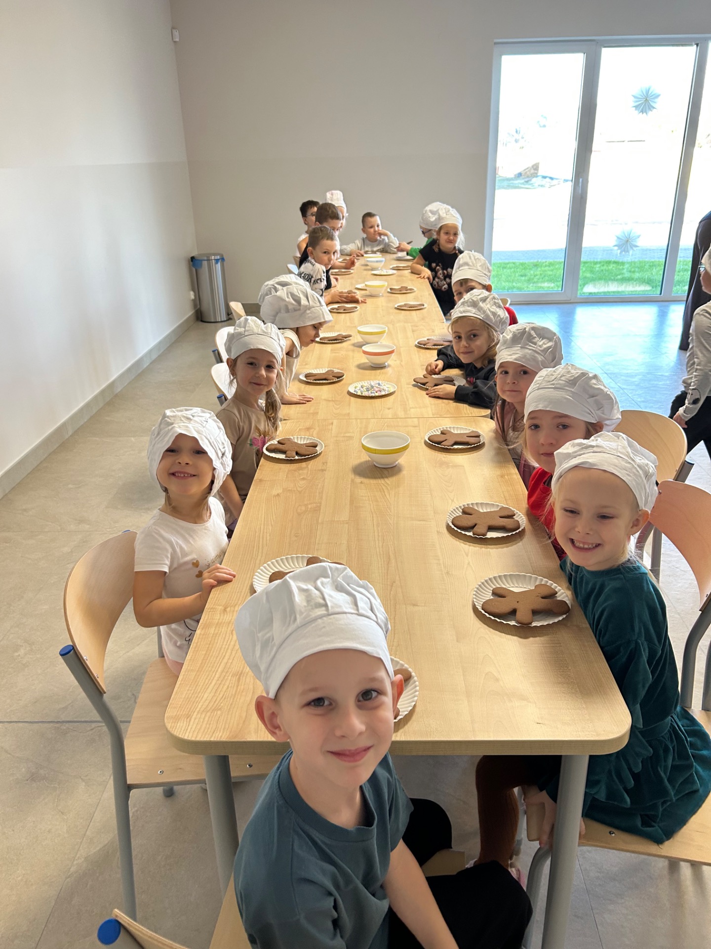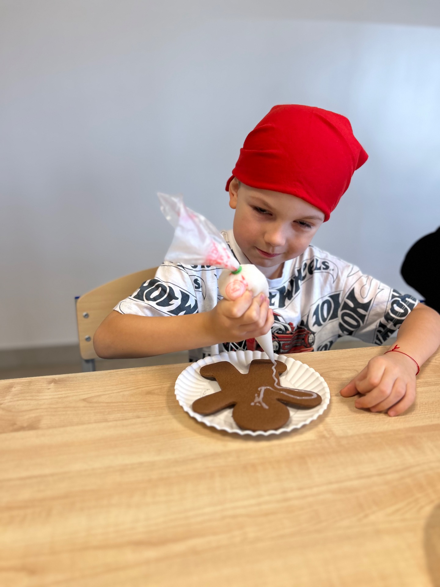 Dzieci z ogromnym zaangażowaniem ozdabiały ludzika lukrem i kolorowymi posypkami, ćwicząc przy tym sprawność manualną, kreatywność oraz współpracę. Radości i śmiechu było co niemiara, a wspólna praca przyniosła piękny – i bardzo apetyczny – efekt.