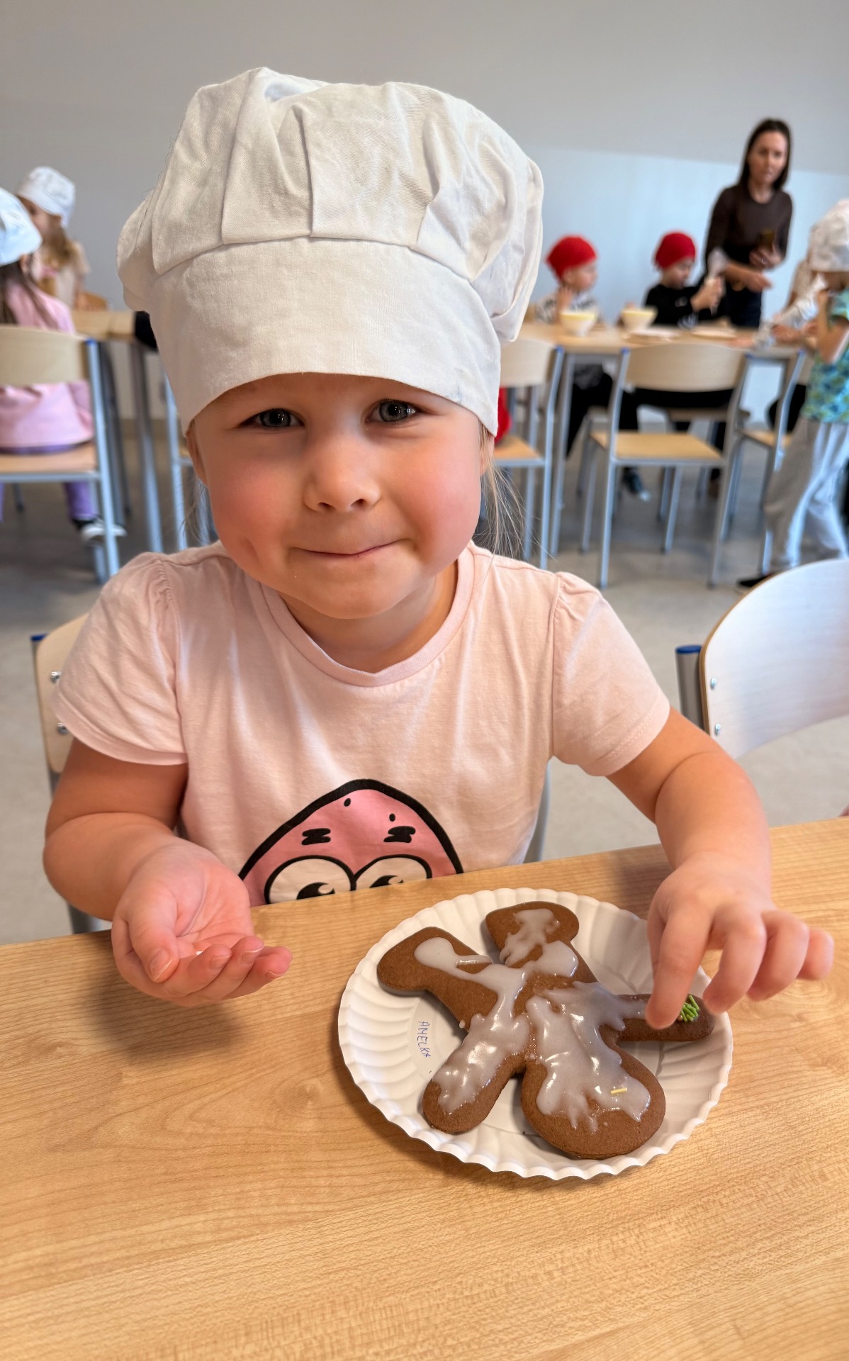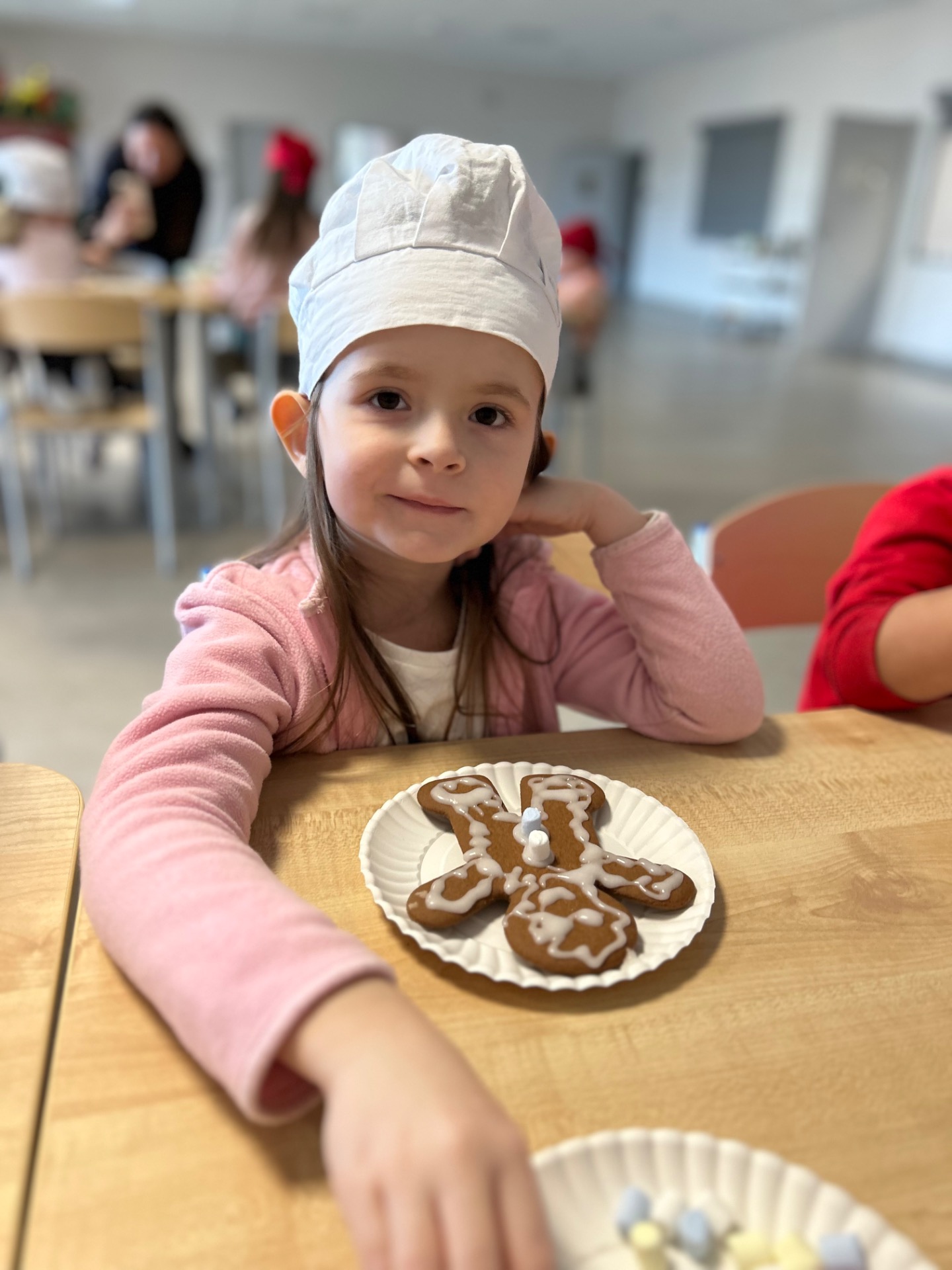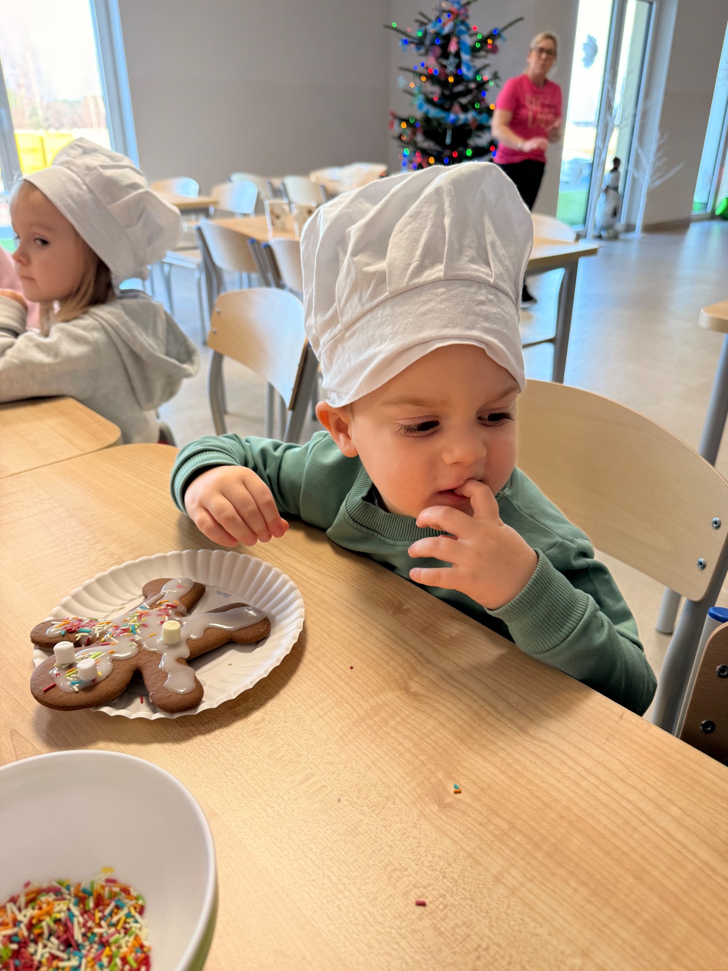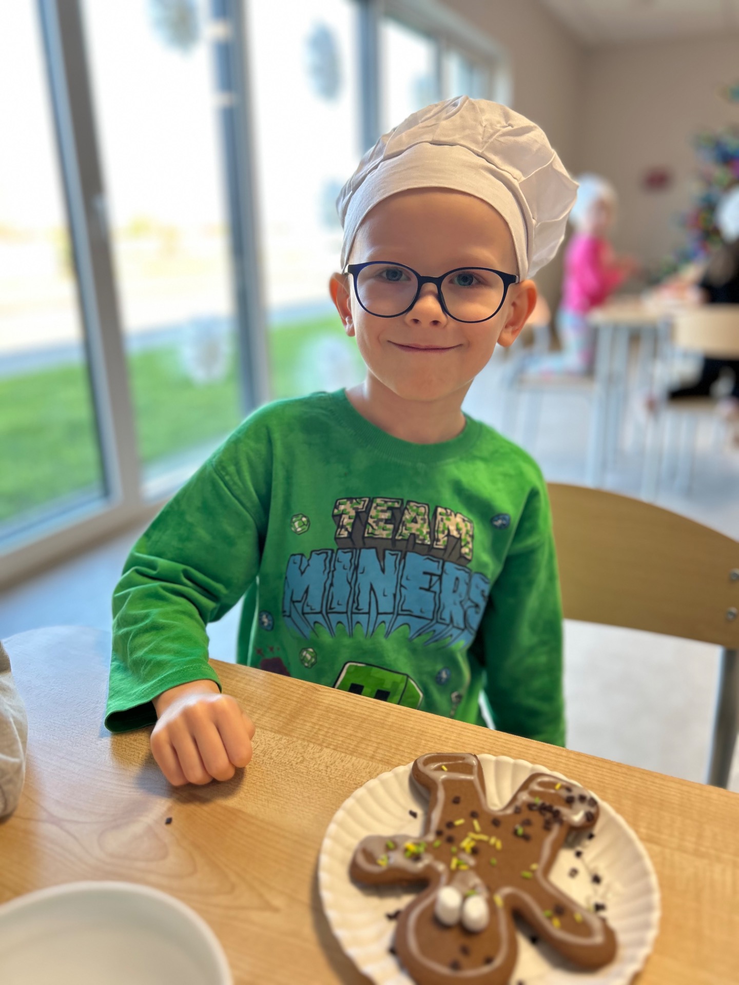 Dzieci z ogromnym zaangażowaniem ozdabiały ludzika lukrem i kolorowymi posypkami, ćwicząc przy tym sprawność manualną, kreatywność oraz współpracę. Radości i śmiechu było co niemiara, a wspólna praca przyniosła piękny – i bardzo apetyczny – efekt.