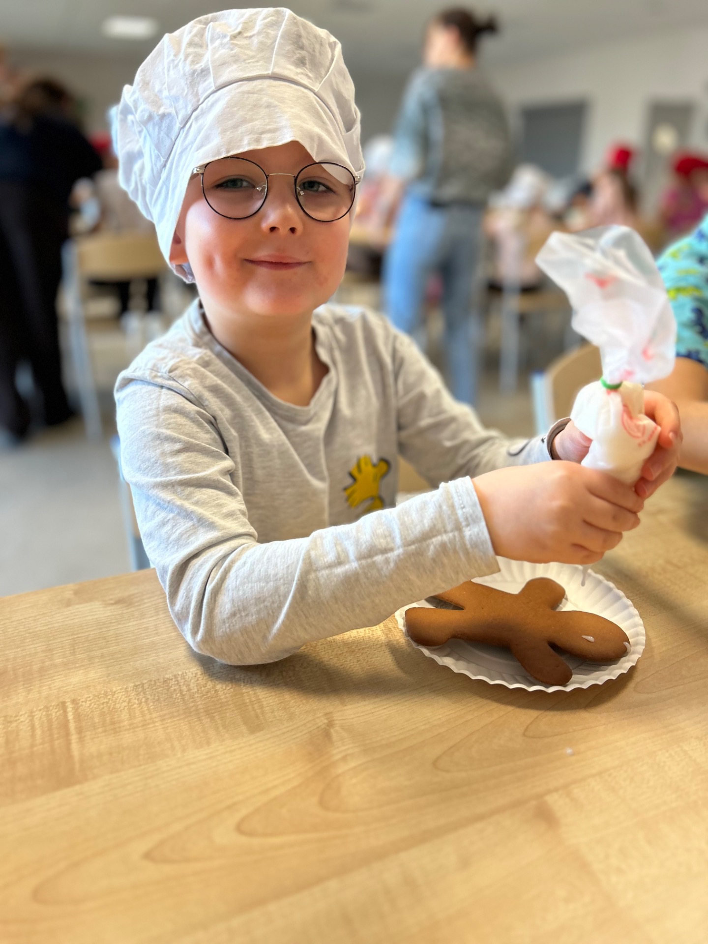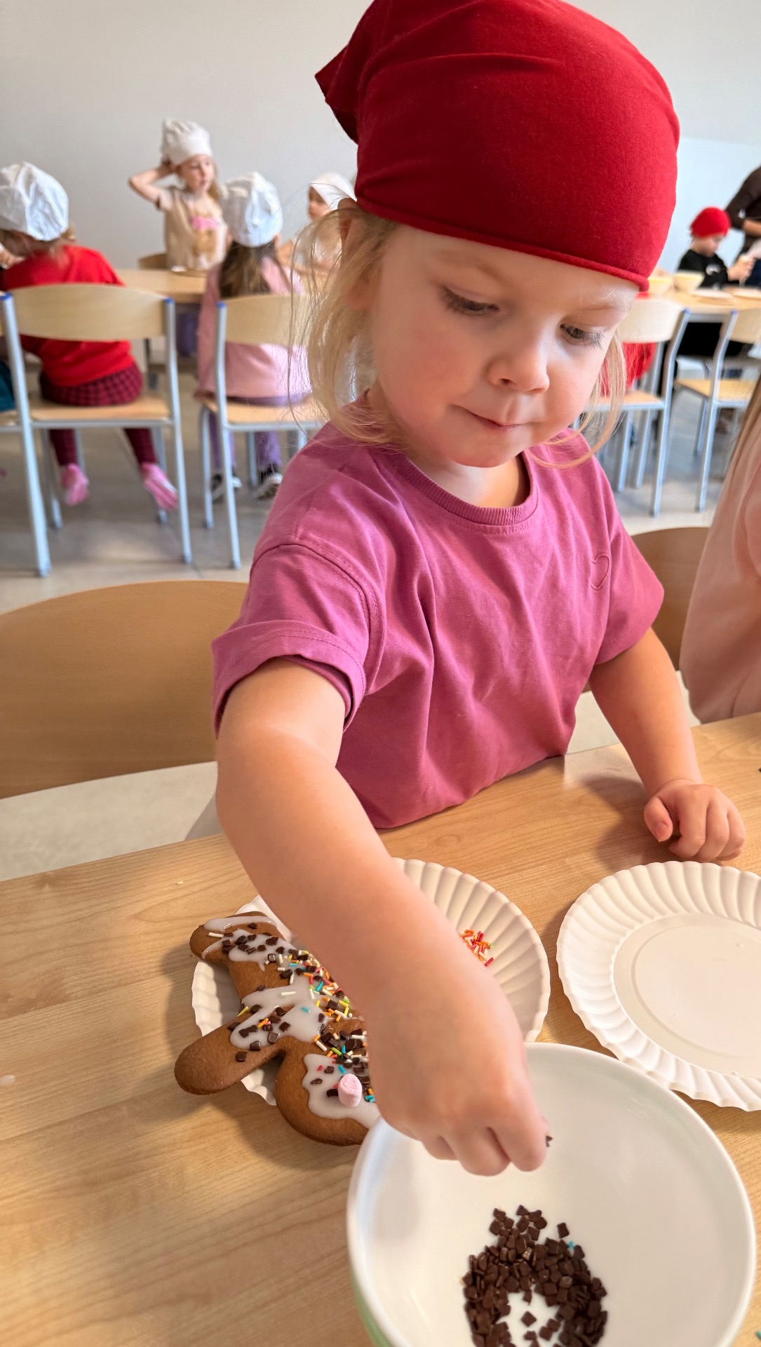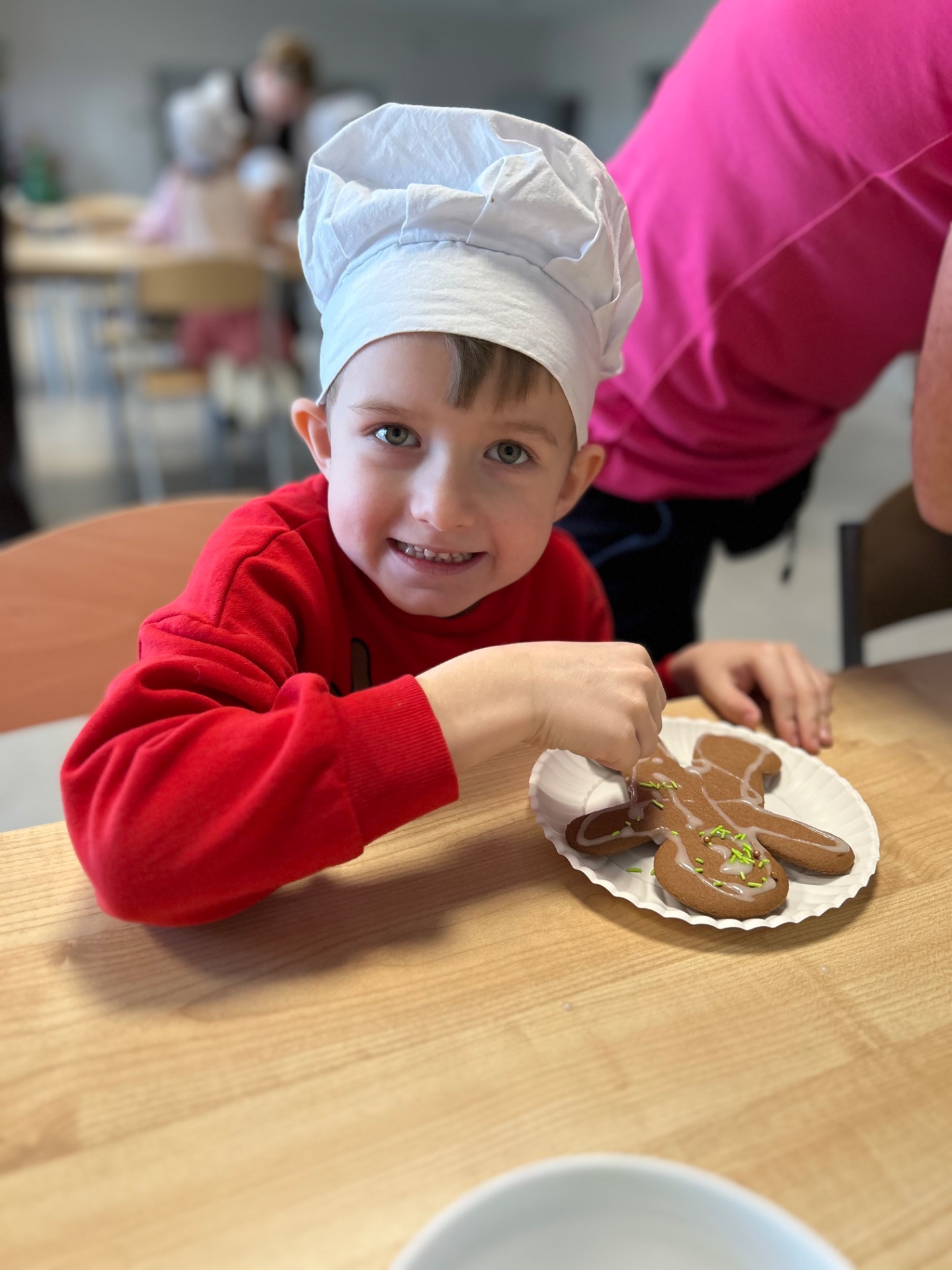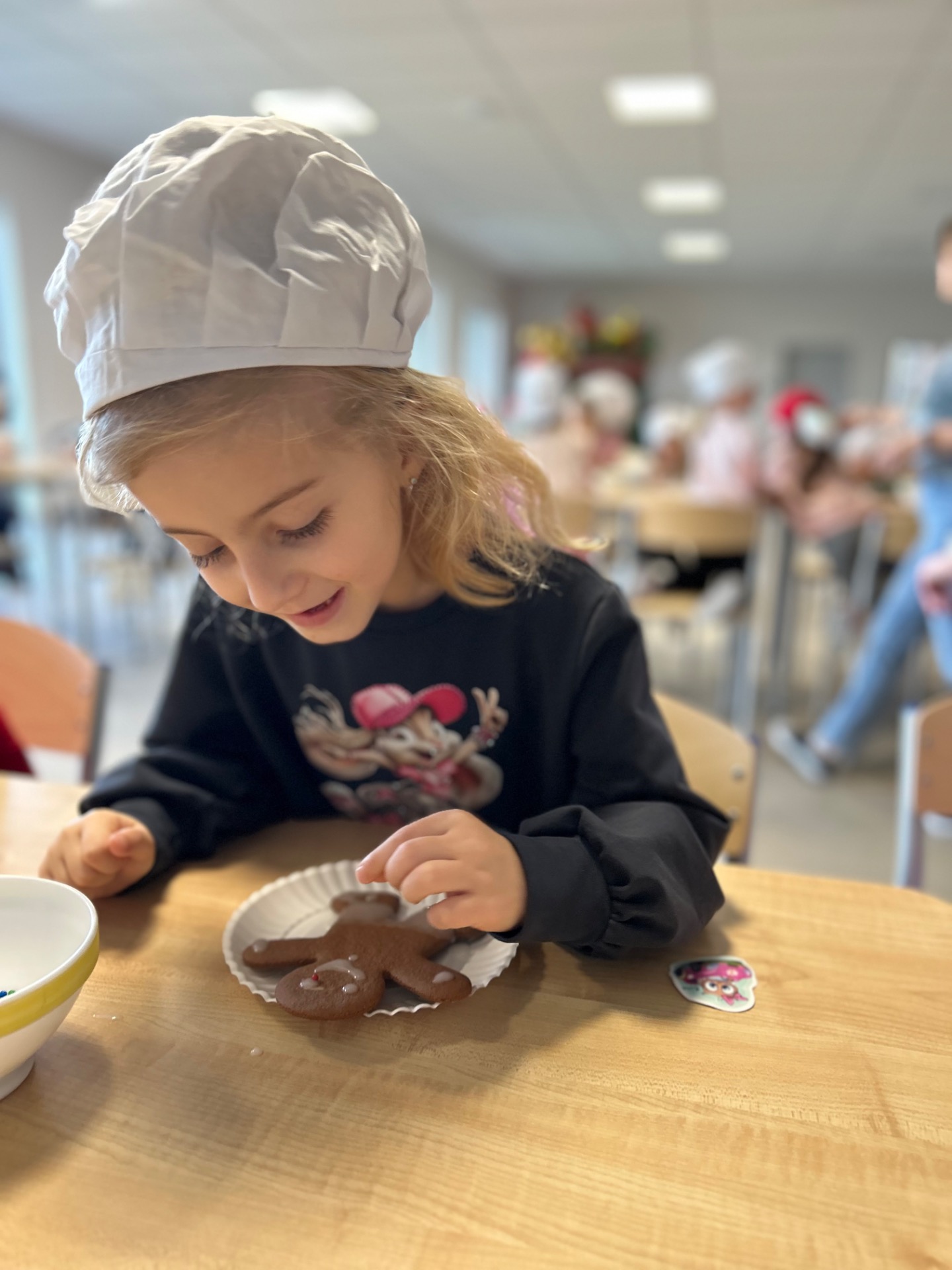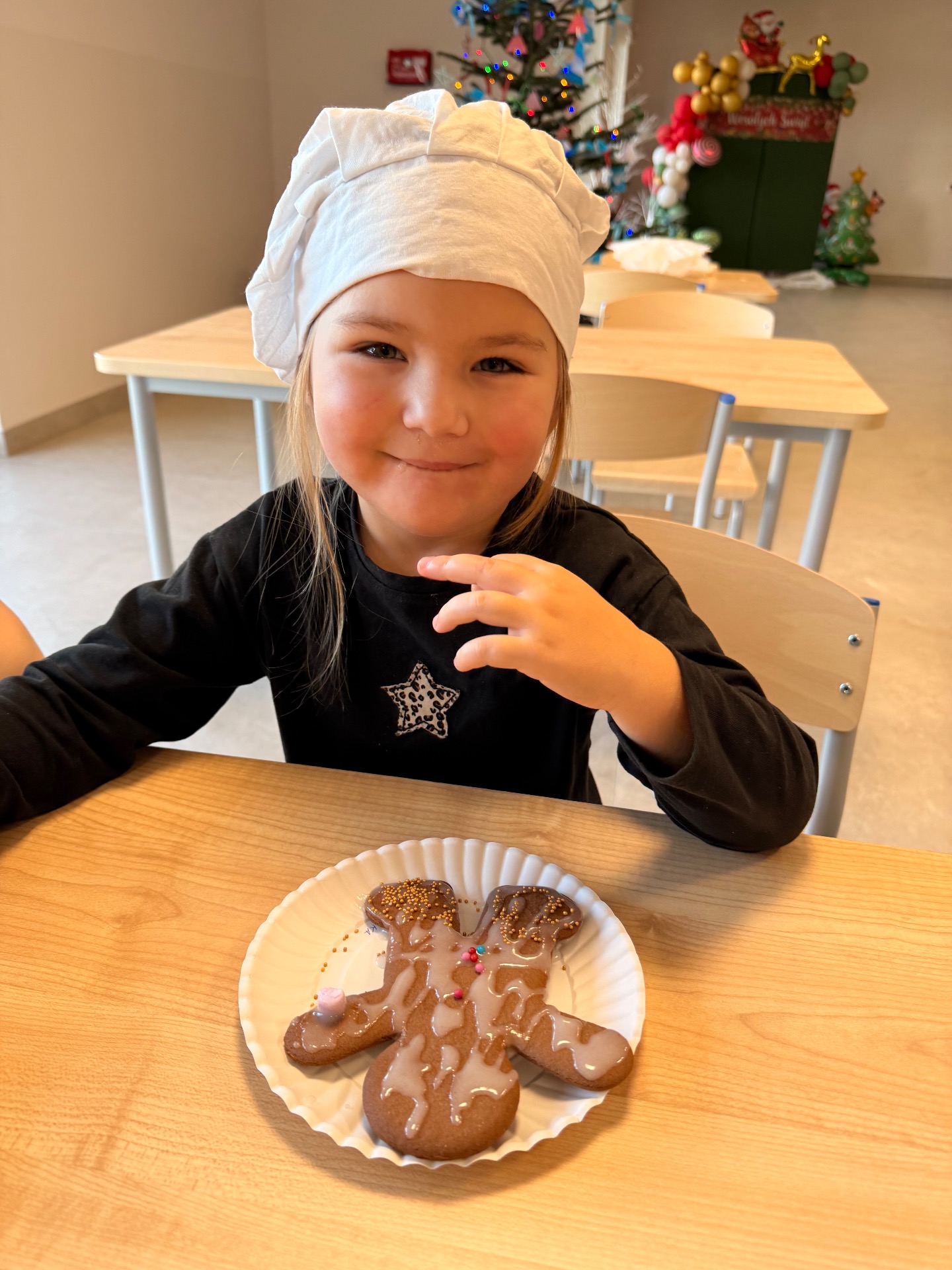 Dzieci z ogromnym zaangażowaniem ozdabiały ludzika lukrem i kolorowymi posypkami, ćwicząc przy tym sprawność manualną, kreatywność oraz współpracę. Radości i śmiechu było co niemiara, a wspólna praca przyniosła piękny – i bardzo apetyczny – efekt.