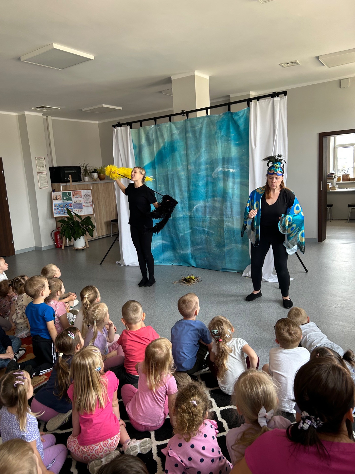 W tym tygodniu nasze przedszkolaki miały niezwykłą okazję uczestniczyć w wyjątkowym przedstawieniu teatralnym pt. „Niebo – królestwo ptaków”, które odbyło się w pobliskiej bibliotece. Spektakl został przygotowany przez utalentowane aktorki z Teatru Dwóch i przeniósł dzieci do fascynującego świata skrzydlatych mieszkańców nieba.