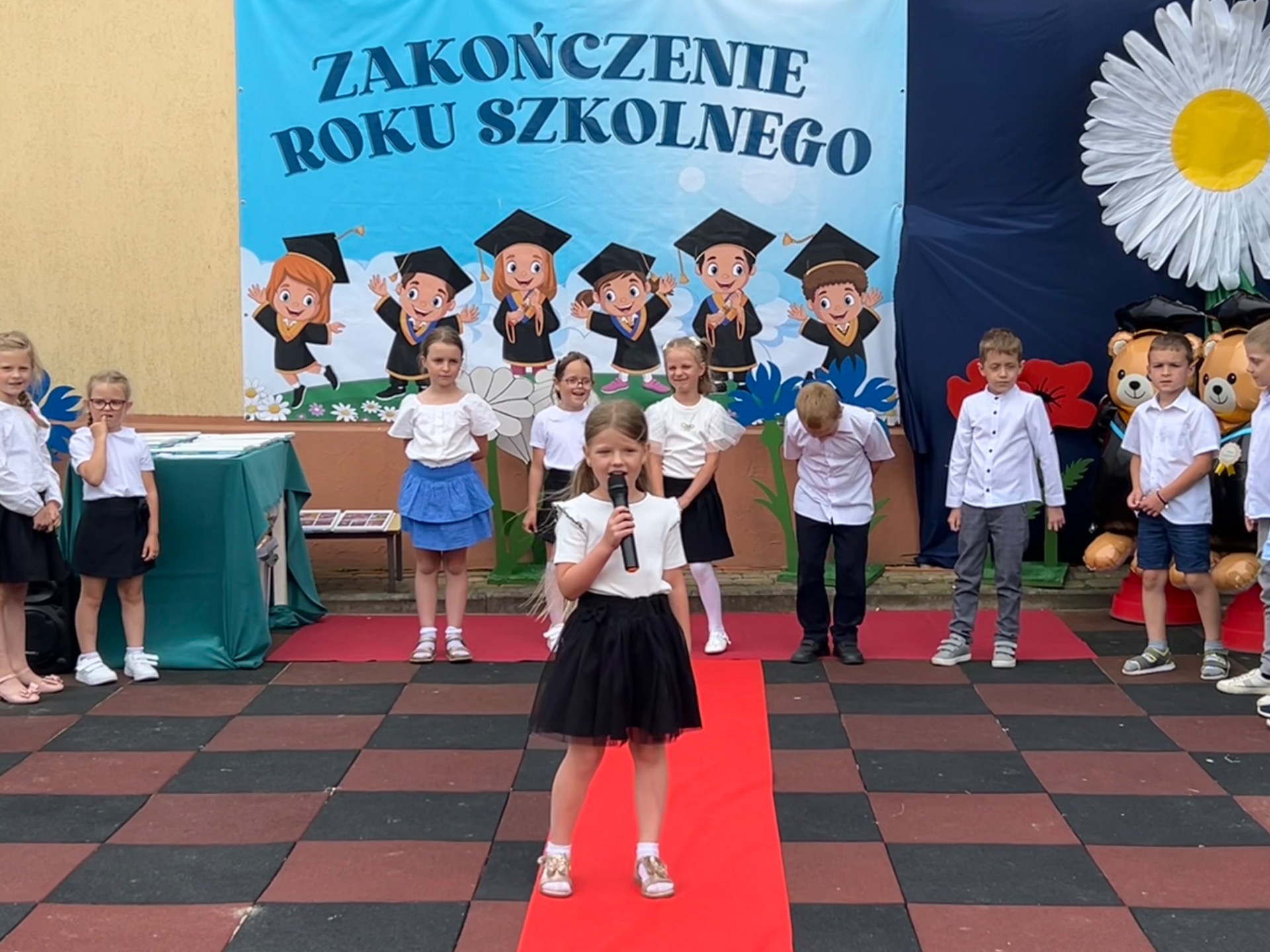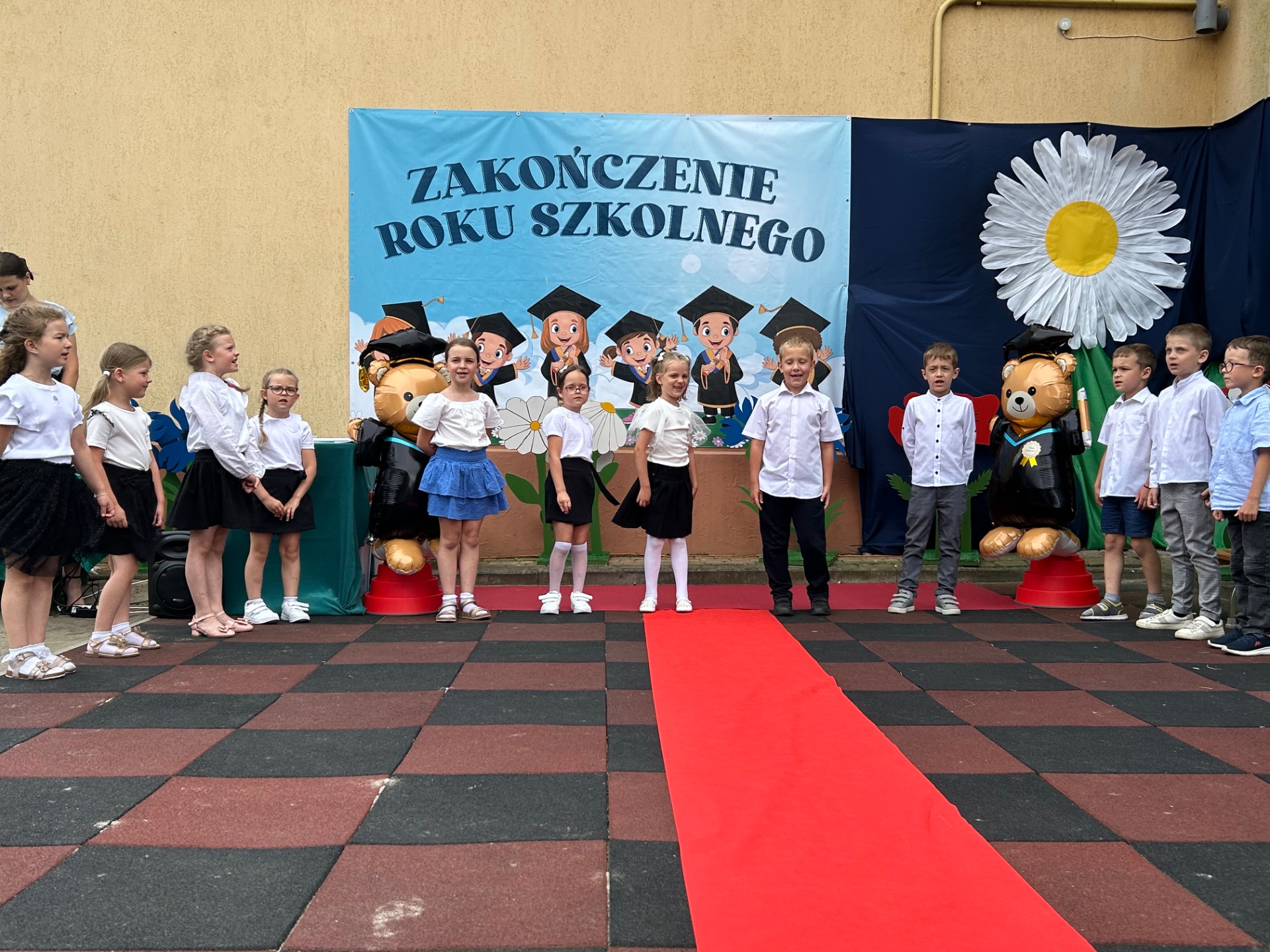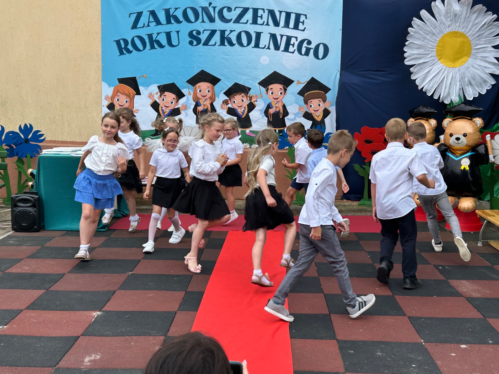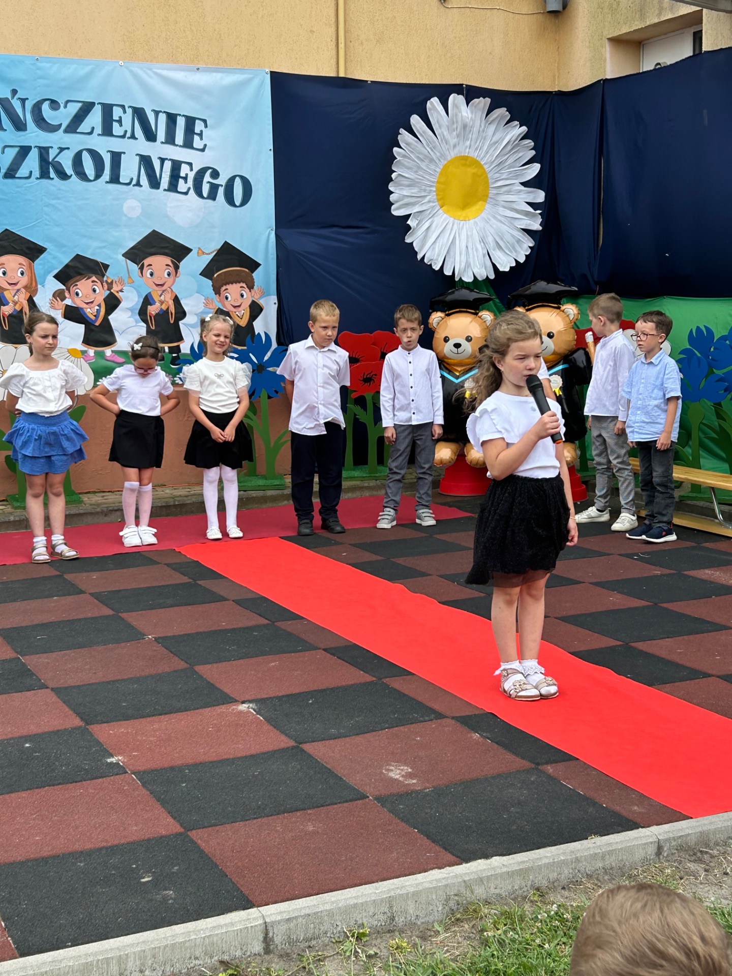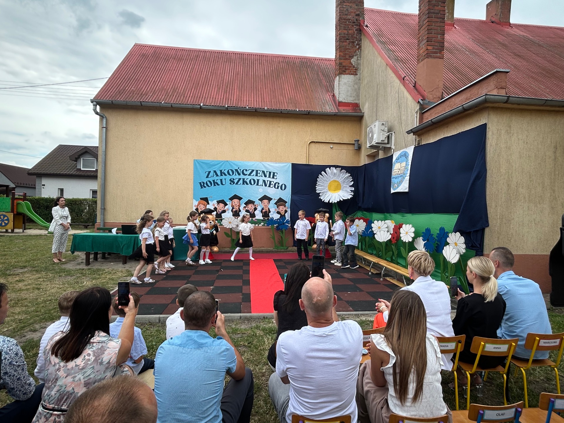 Następnie przyszedł czas na wyjątkowy moment – pożegnanie dzieci, które we wrześniu rozpoczną naukę w szkole. Była to szczególna uroczystość, pełna wzruszeń i dumy. Przedszkolaki, pod czujnym okiem swoich nauczycielek, przygotowały krótki program artystyczny. Były wiersze, piosenki i taniec – wszystko po to, aby podziękować za wspólnie spędzone lata i symbolicznie pożegnać się z przedszkolem. Na widowni zasiedli dumni rodzice, którzy z uśmiechem obserwowali występy swoich dzieci.