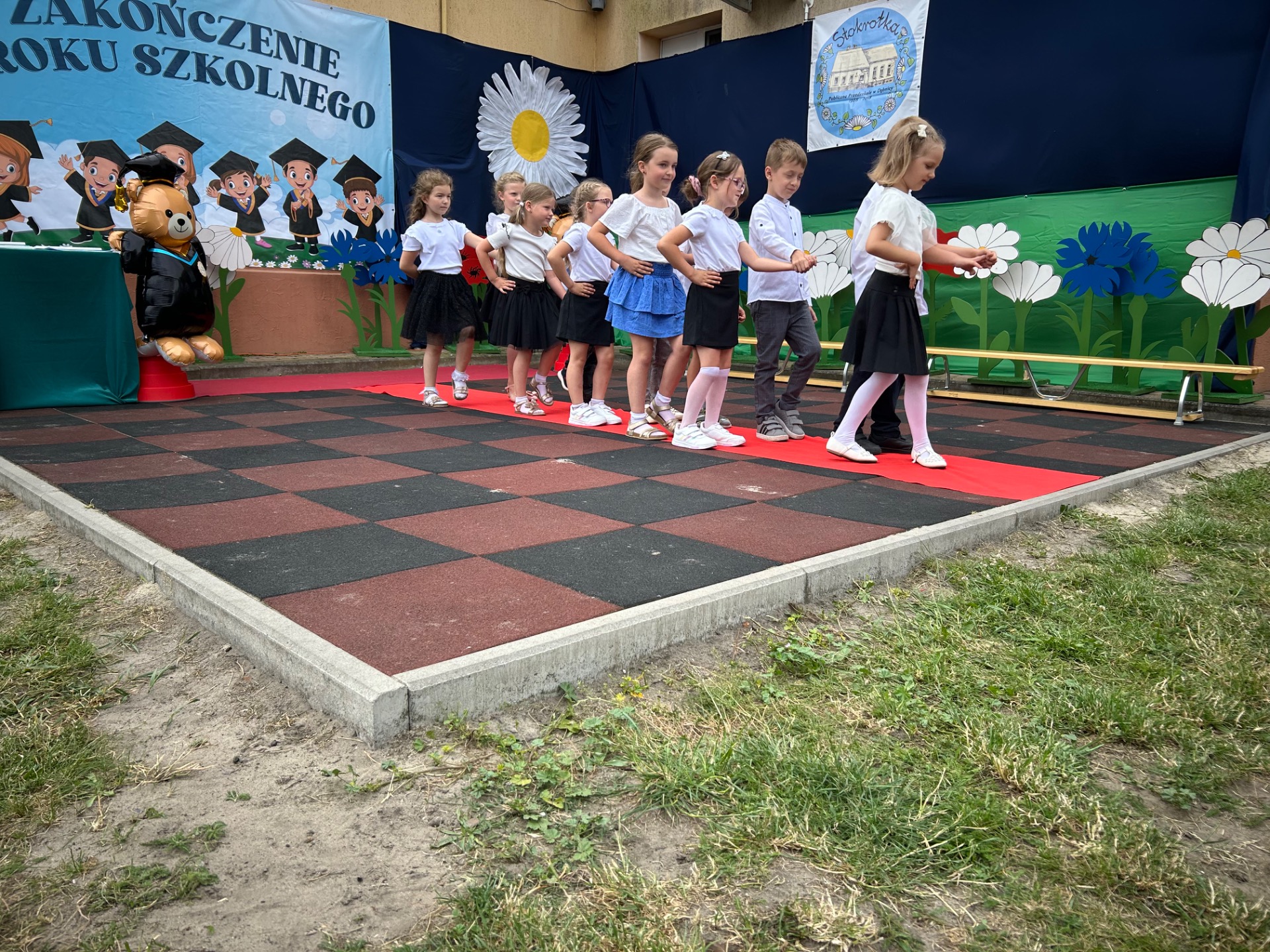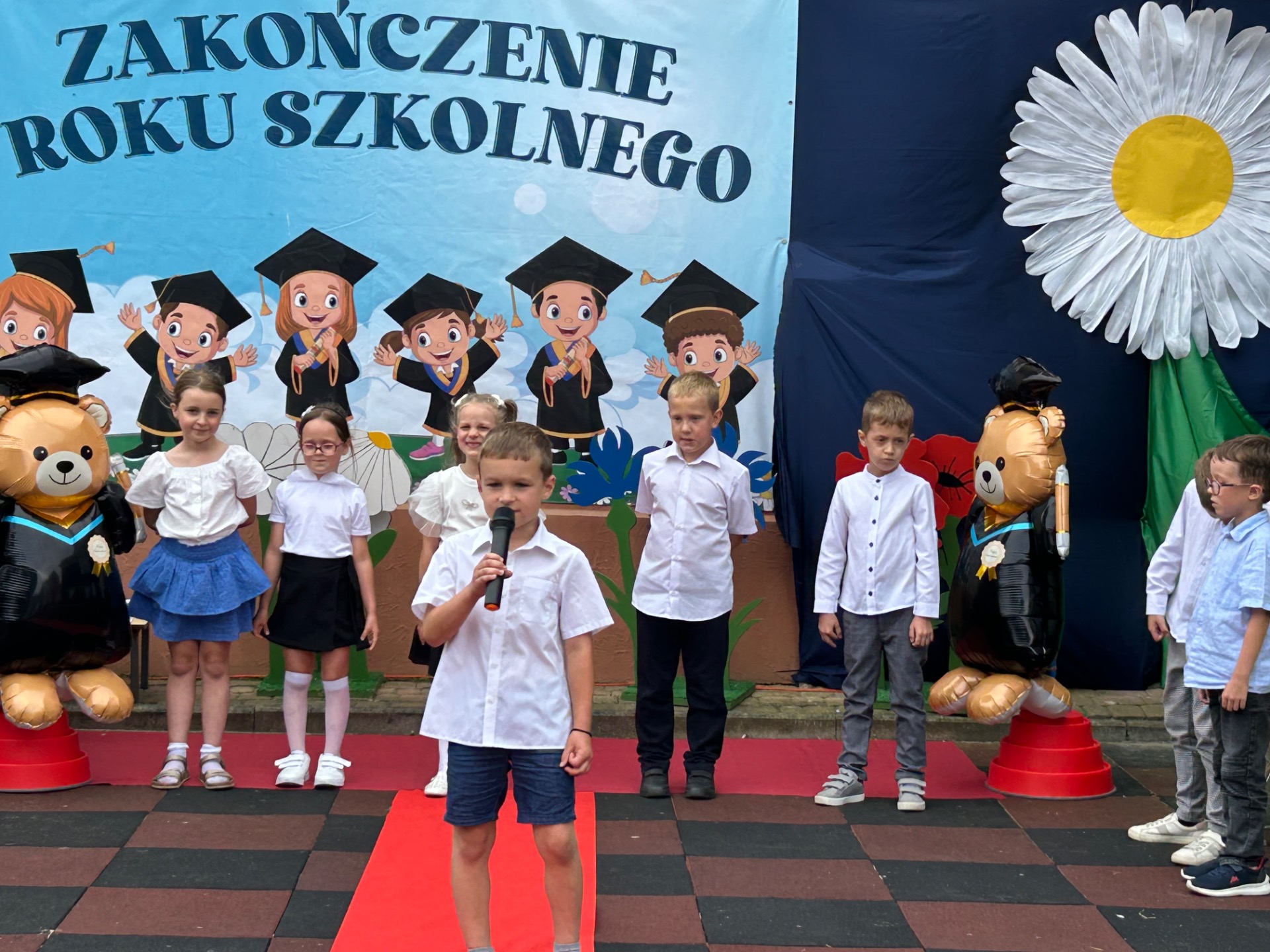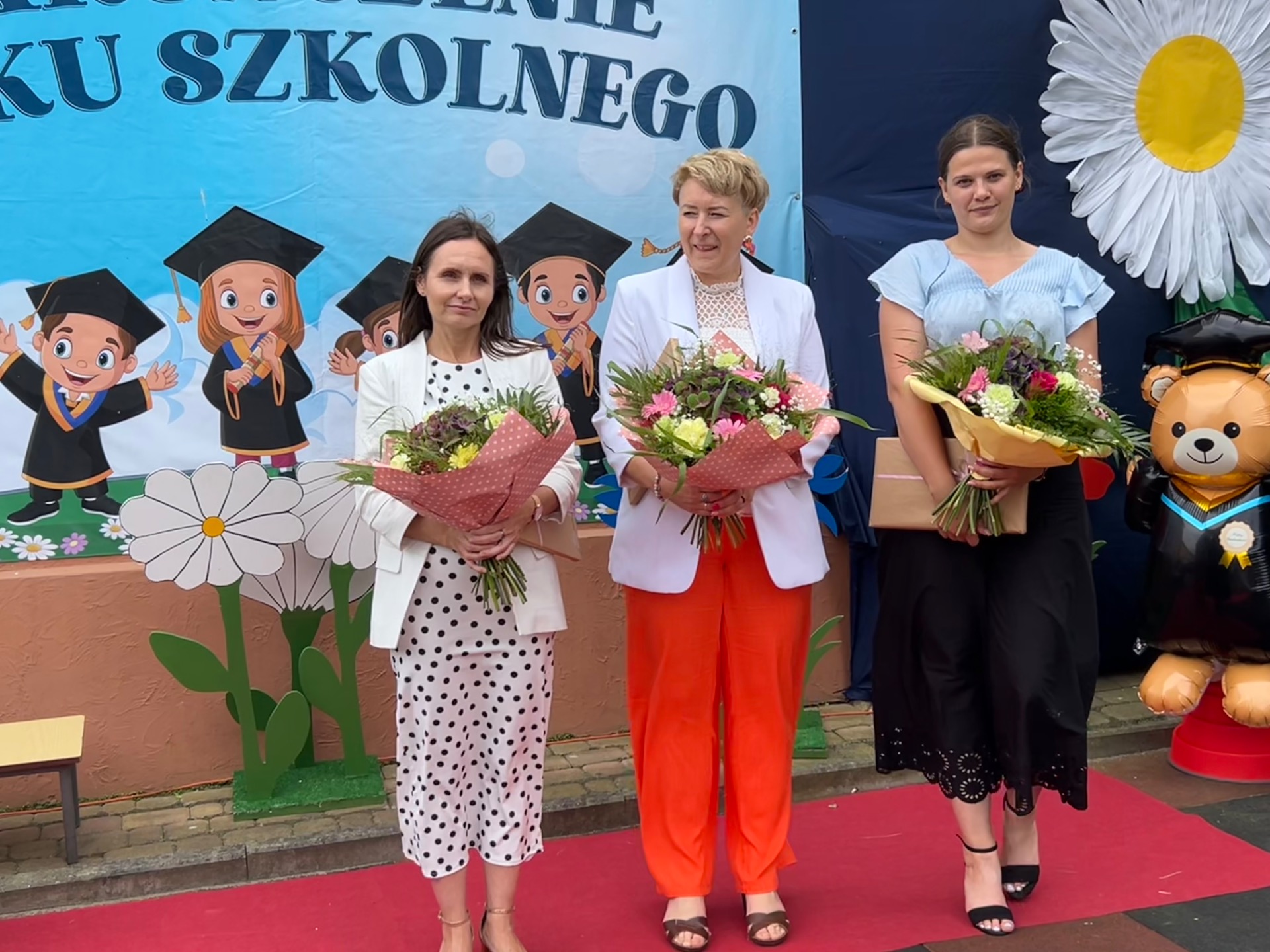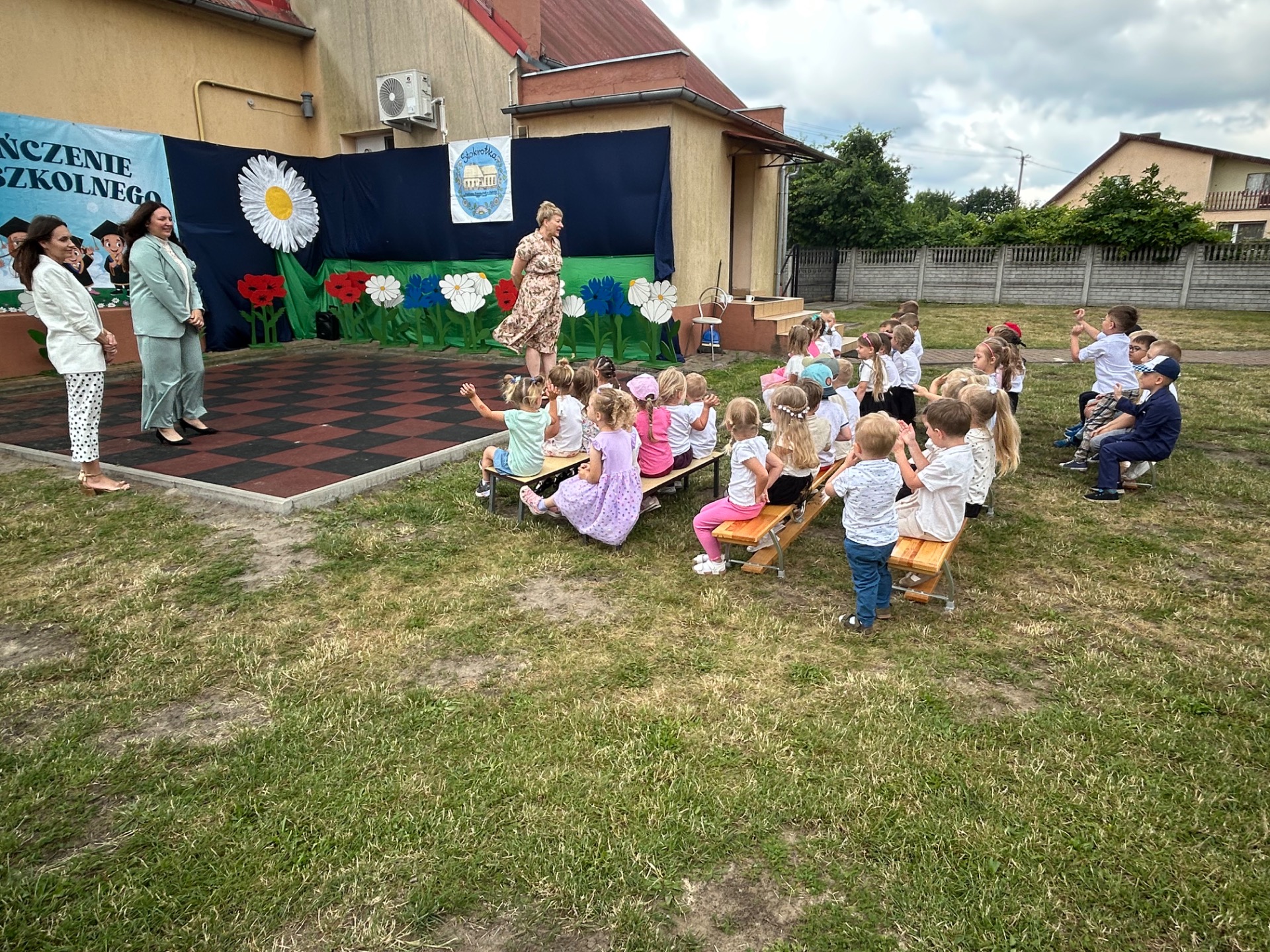 Następnie przyszedł czas na wyjątkowy moment – pożegnanie dzieci, które we wrześniu rozpoczną naukę w szkole. Była to szczególna uroczystość, pełna wzruszeń i dumy. Przedszkolaki, pod czujnym okiem swoich nauczycielek, przygotowały krótki program artystyczny. Były wiersze, piosenki i taniec – wszystko po to, aby podziękować za wspólnie spędzone lata i symbolicznie pożegnać się z przedszkolem. Na widowni zasiedli dumni rodzice, którzy z uśmiechem obserwowali występy swoich dzieci.
