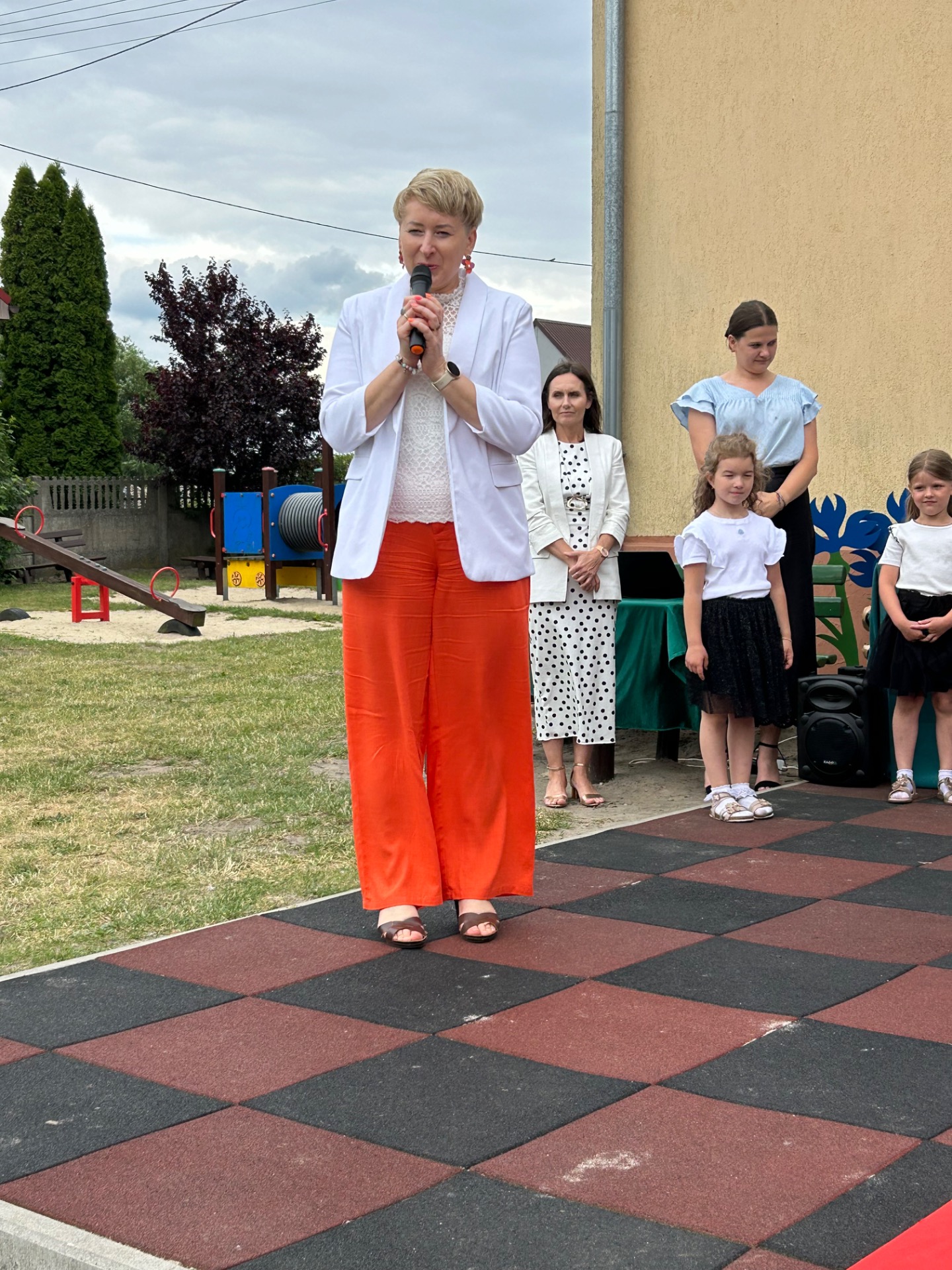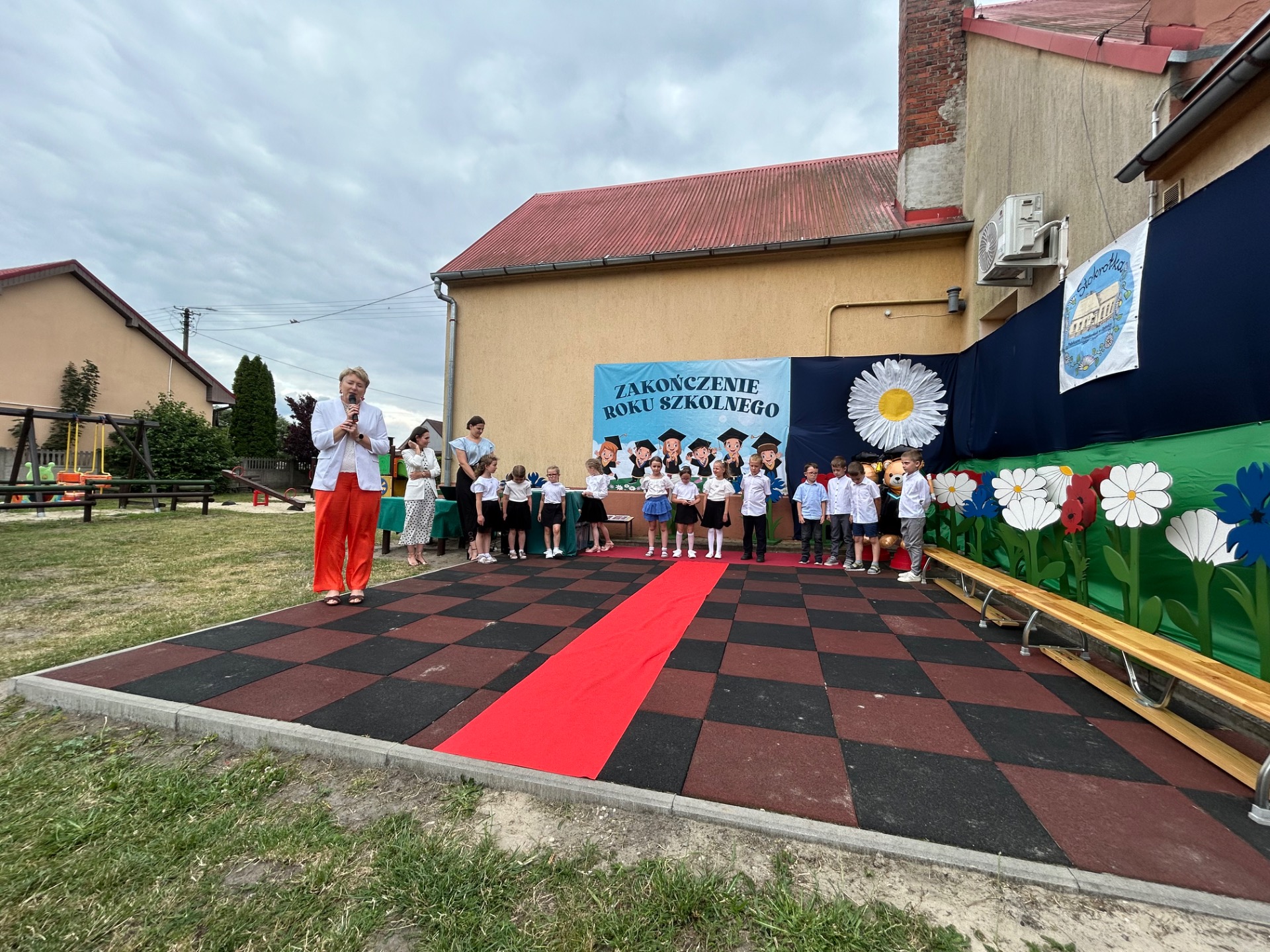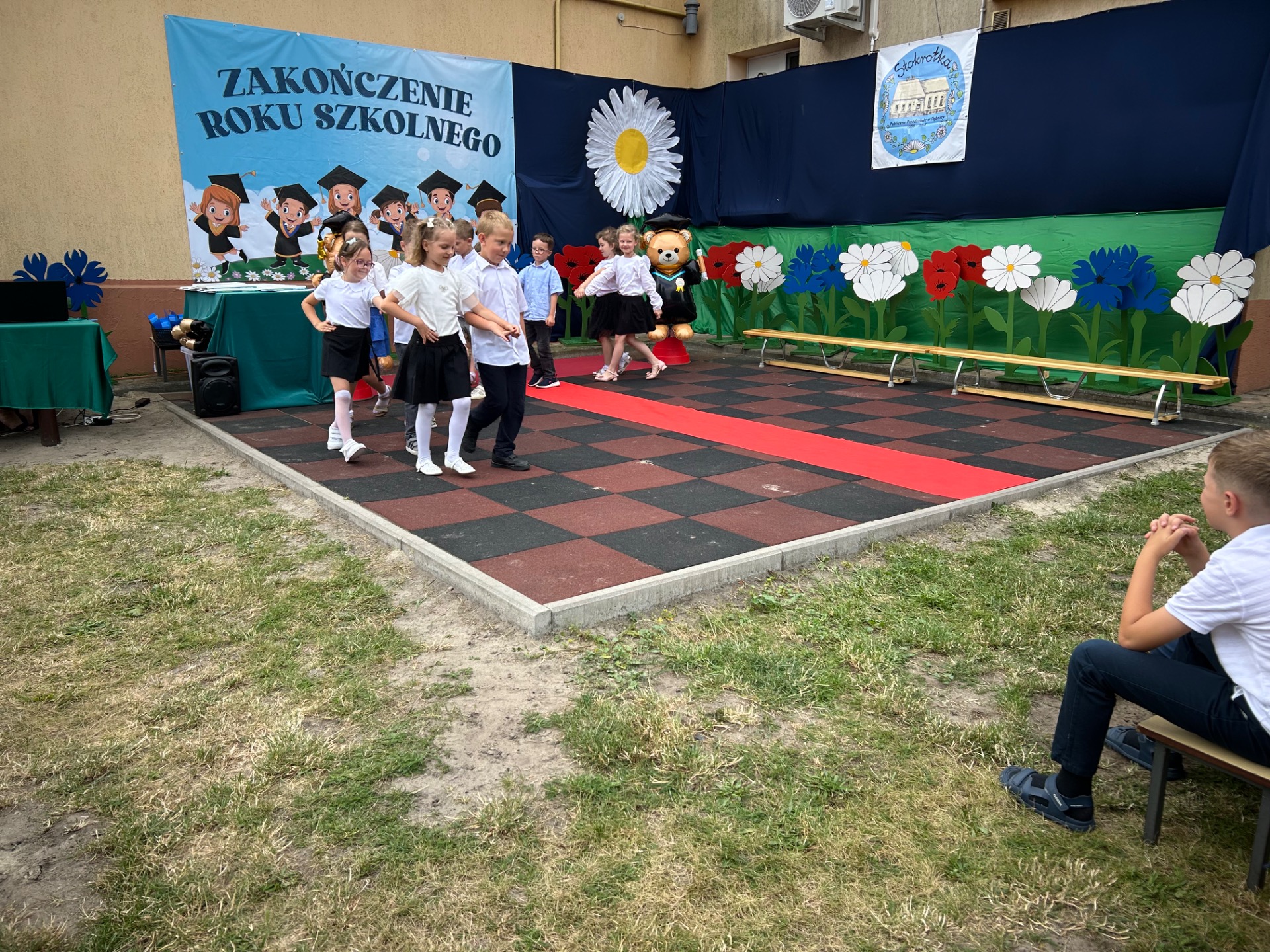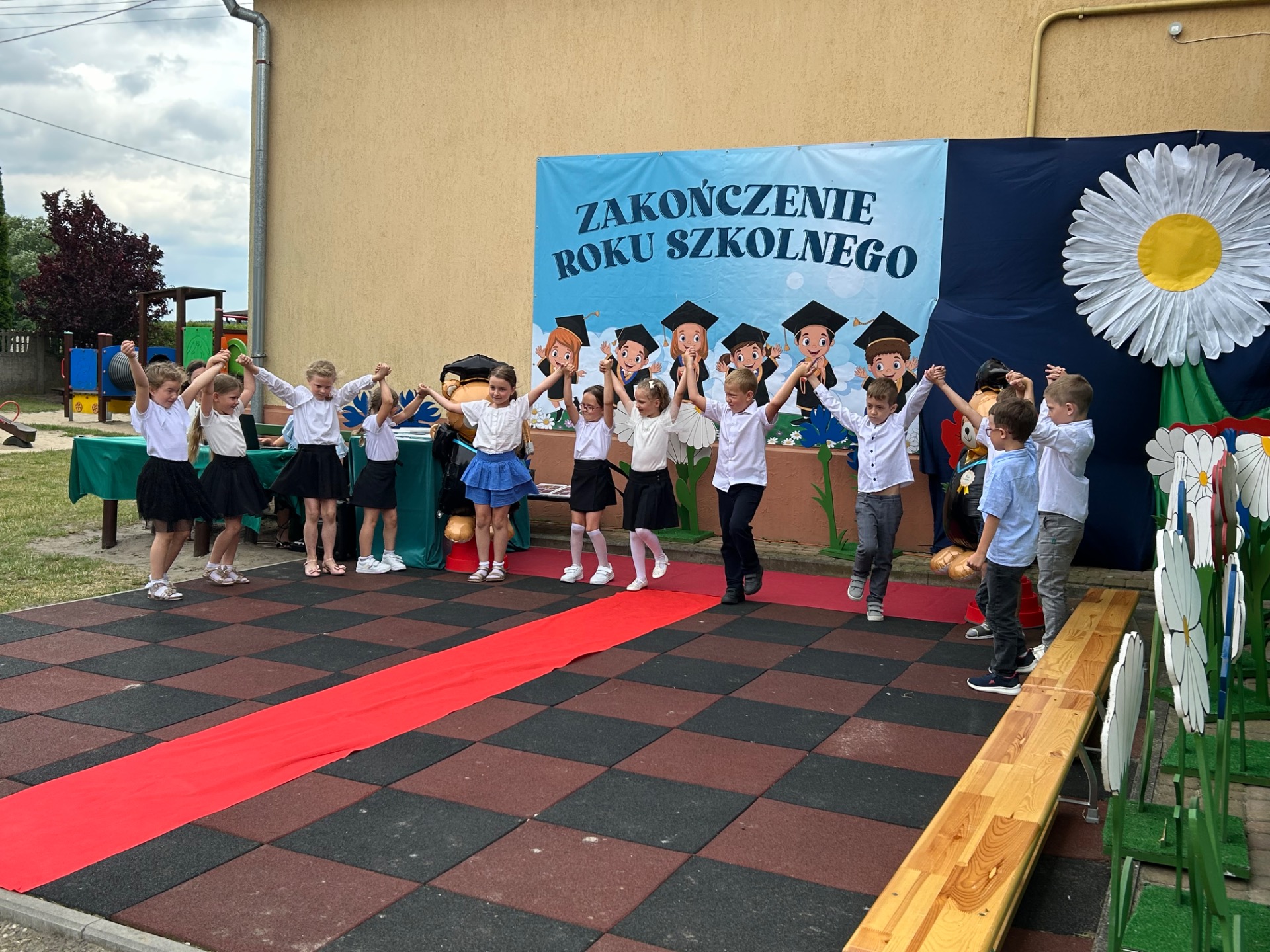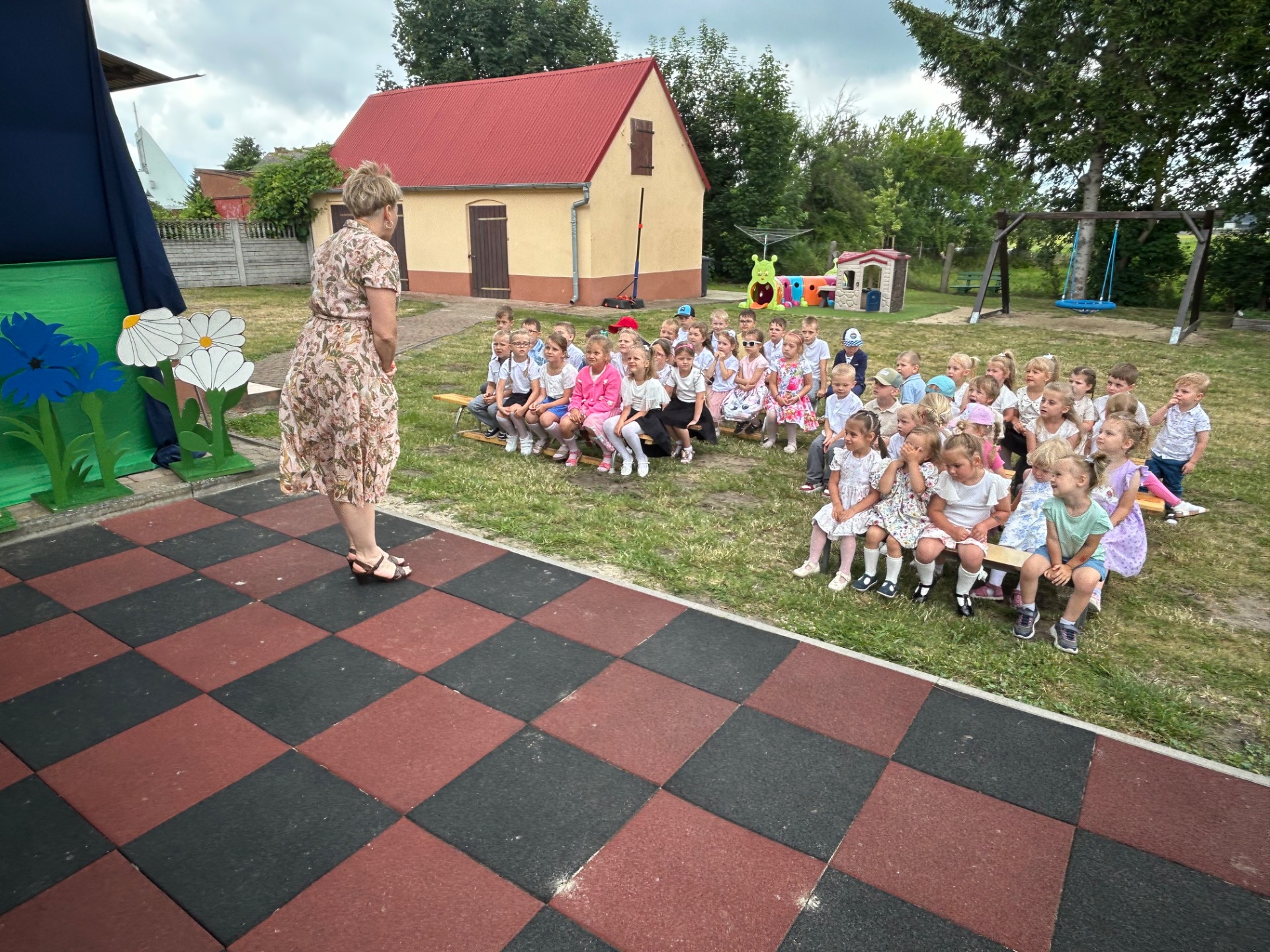 Następnie przyszedł czas na wyjątkowy moment – pożegnanie dzieci, które we wrześniu rozpoczną naukę w szkole. Była to szczególna uroczystość, pełna wzruszeń i dumy. Przedszkolaki, pod czujnym okiem swoich nauczycielek, przygotowały krótki program artystyczny. Były wiersze, piosenki i taniec – wszystko po to, aby podziękować za wspólnie spędzone lata i symbolicznie pożegnać się z przedszkolem. Na widowni zasiedli dumni rodzice, którzy z uśmiechem obserwowali występy swoich dzieci.