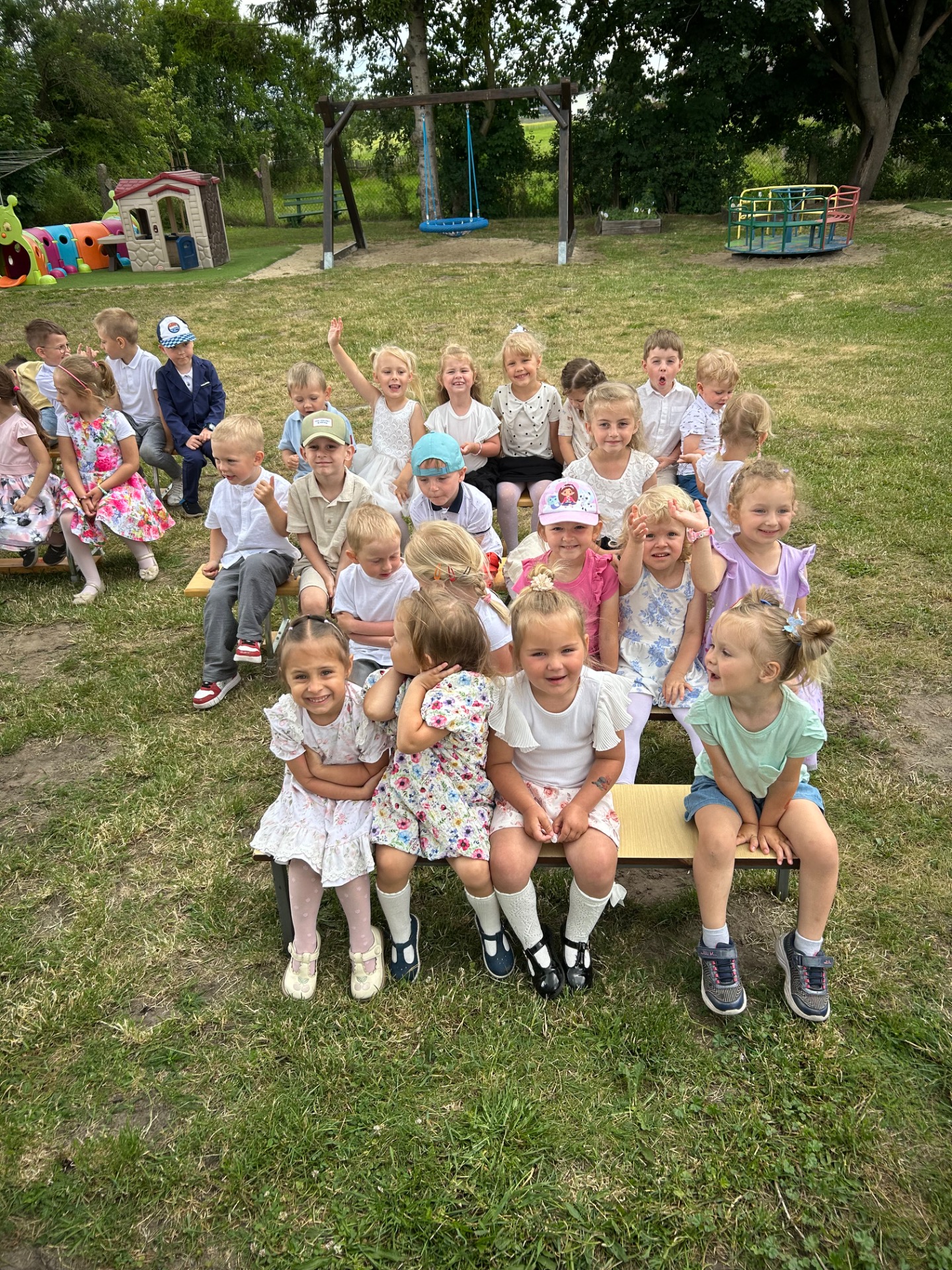 W piątek 27 czerwca w naszym przedszkolu odbyło się uroczyste zakończenie roku szkolnego. Najpierw swoje święto miały dzieci z młodszych grup. Każde z nich otrzymało nagrodę za całoroczną pracę, zaangażowanie i codzienny uśmiech, który wnosiły do naszej przedszkolnej społeczności.