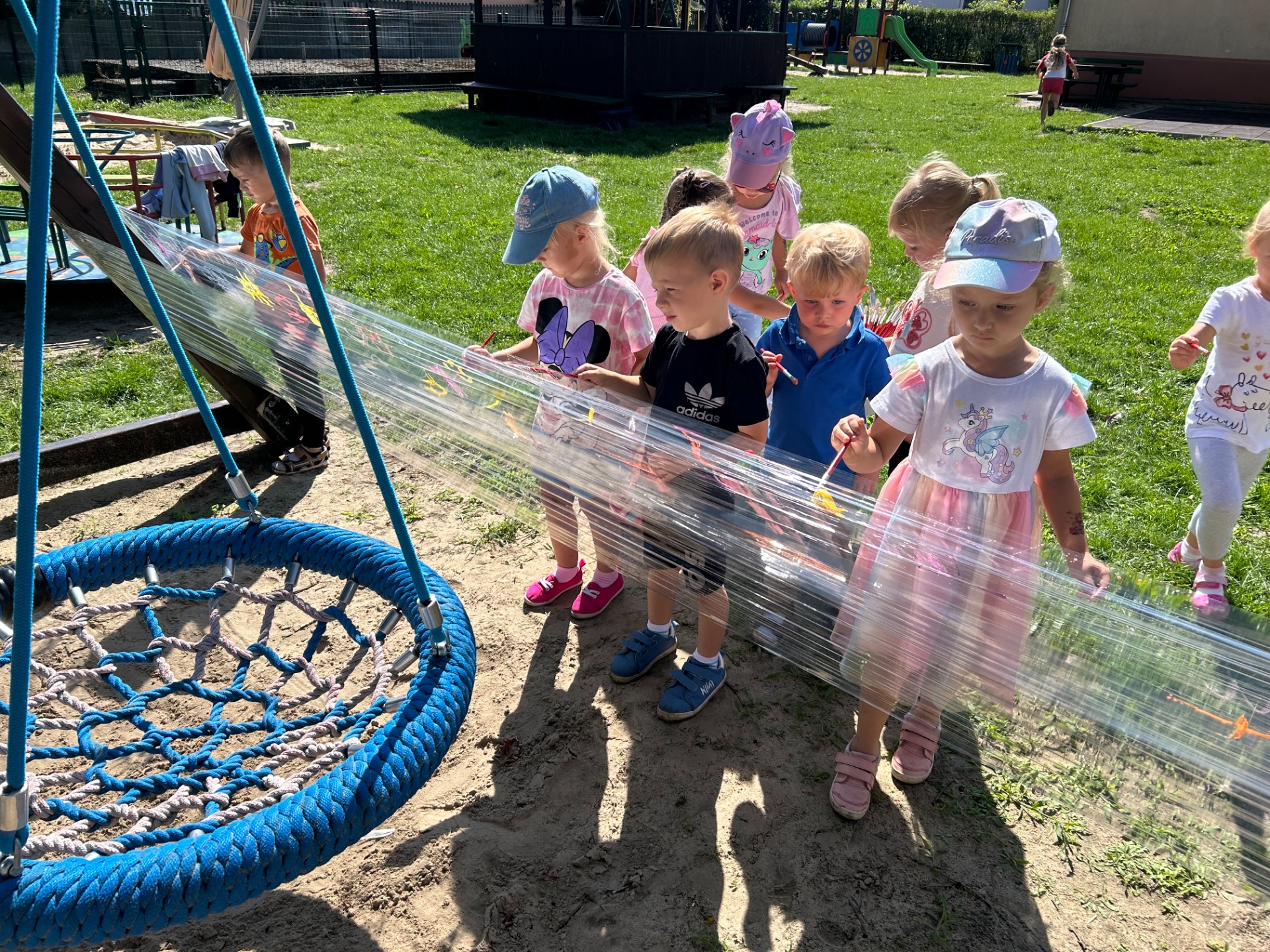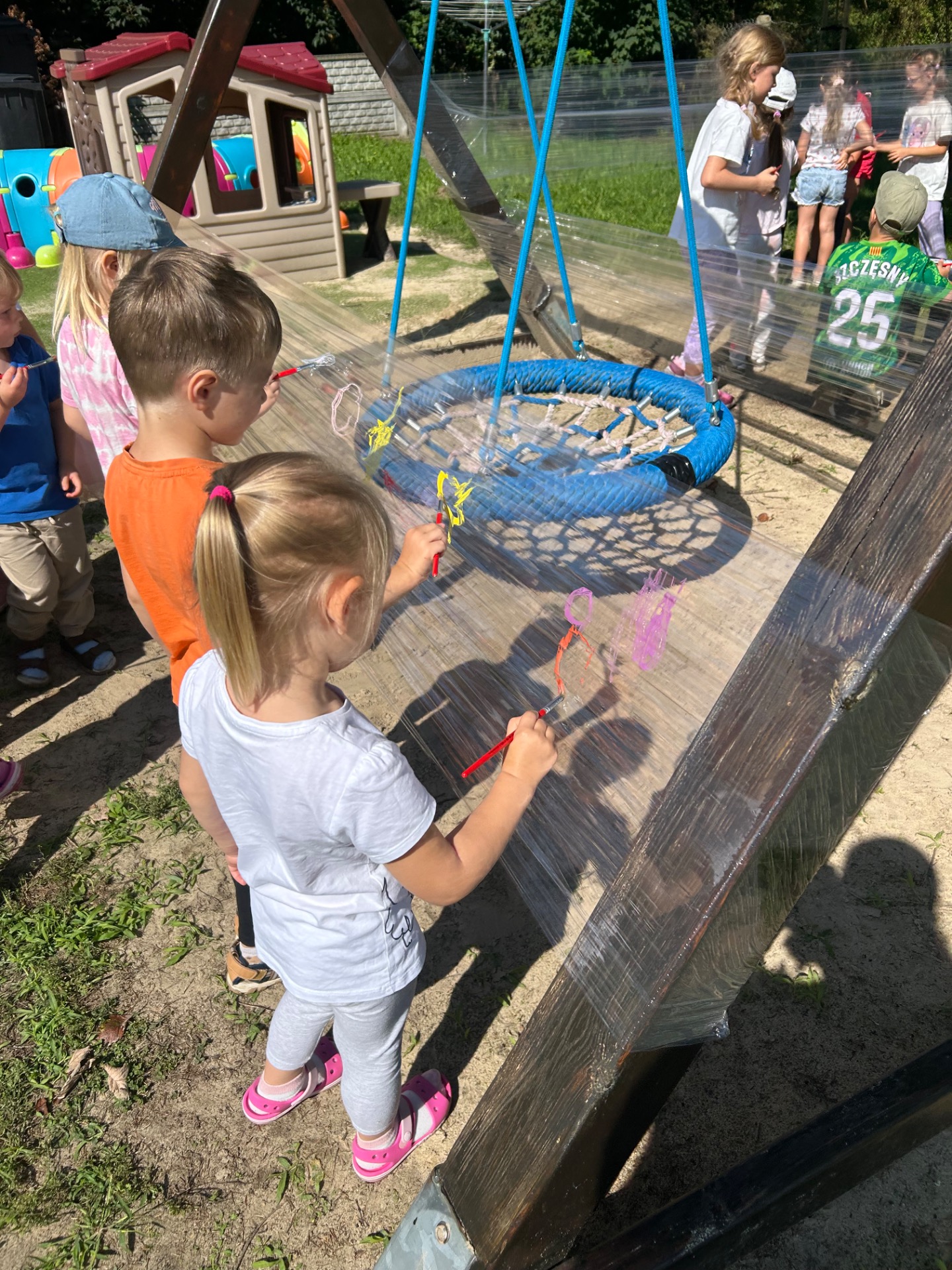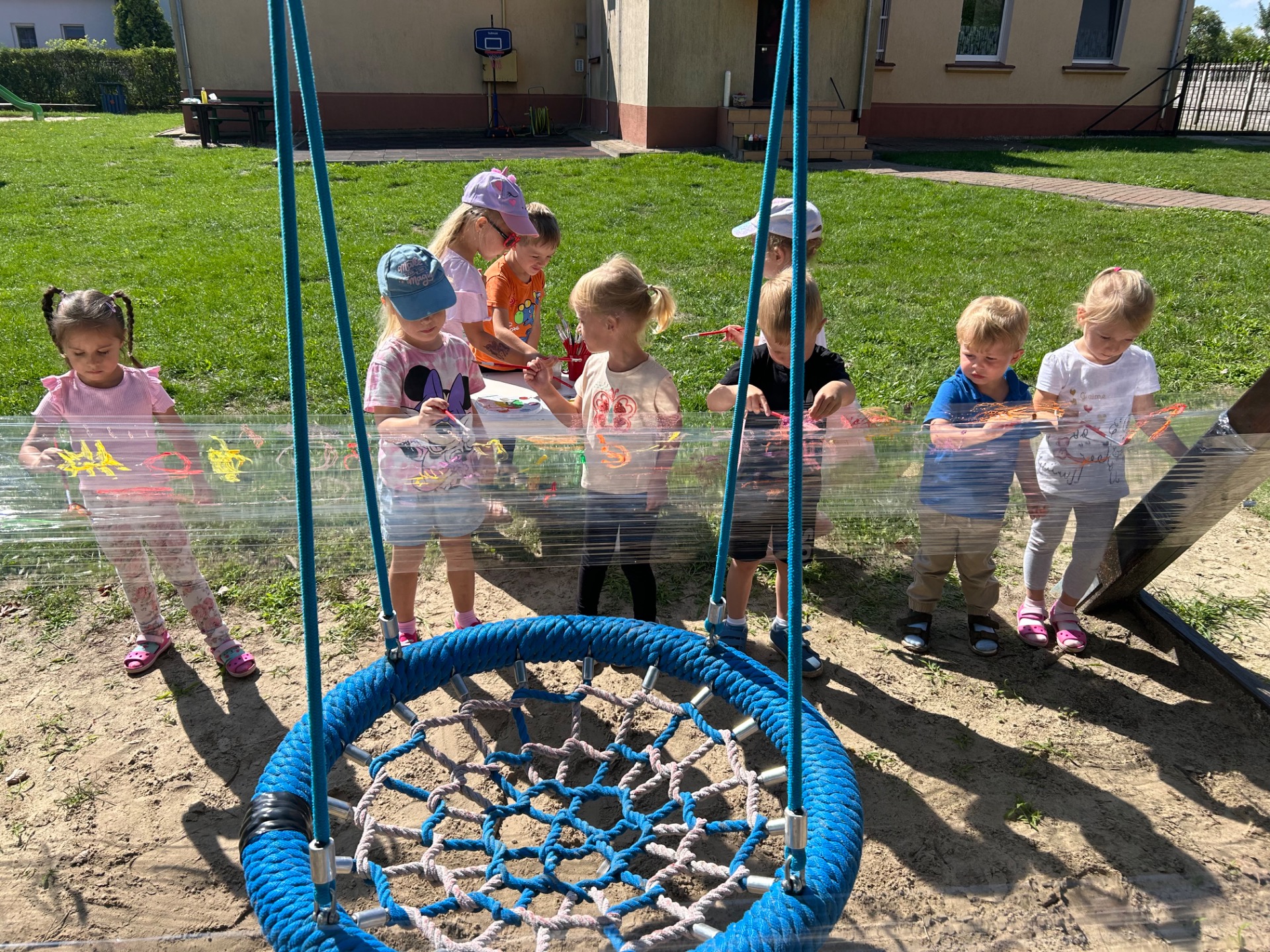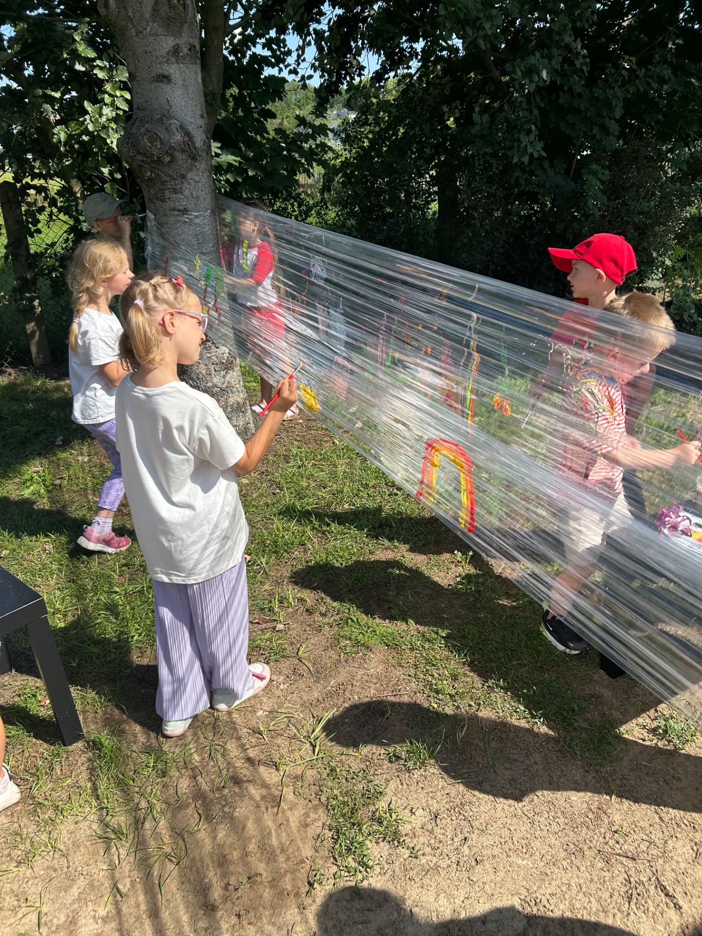 Korzystając z pięknej pogody i wakacyjnego luzu, nasze przedszkolaki miały okazję wziąć udział w wyjątkowych zajęciach plastycznych na świeżym powietrzu. Tym razem farby i pędzle poszły w ruch… na przezroczystym streczowym płótnie!