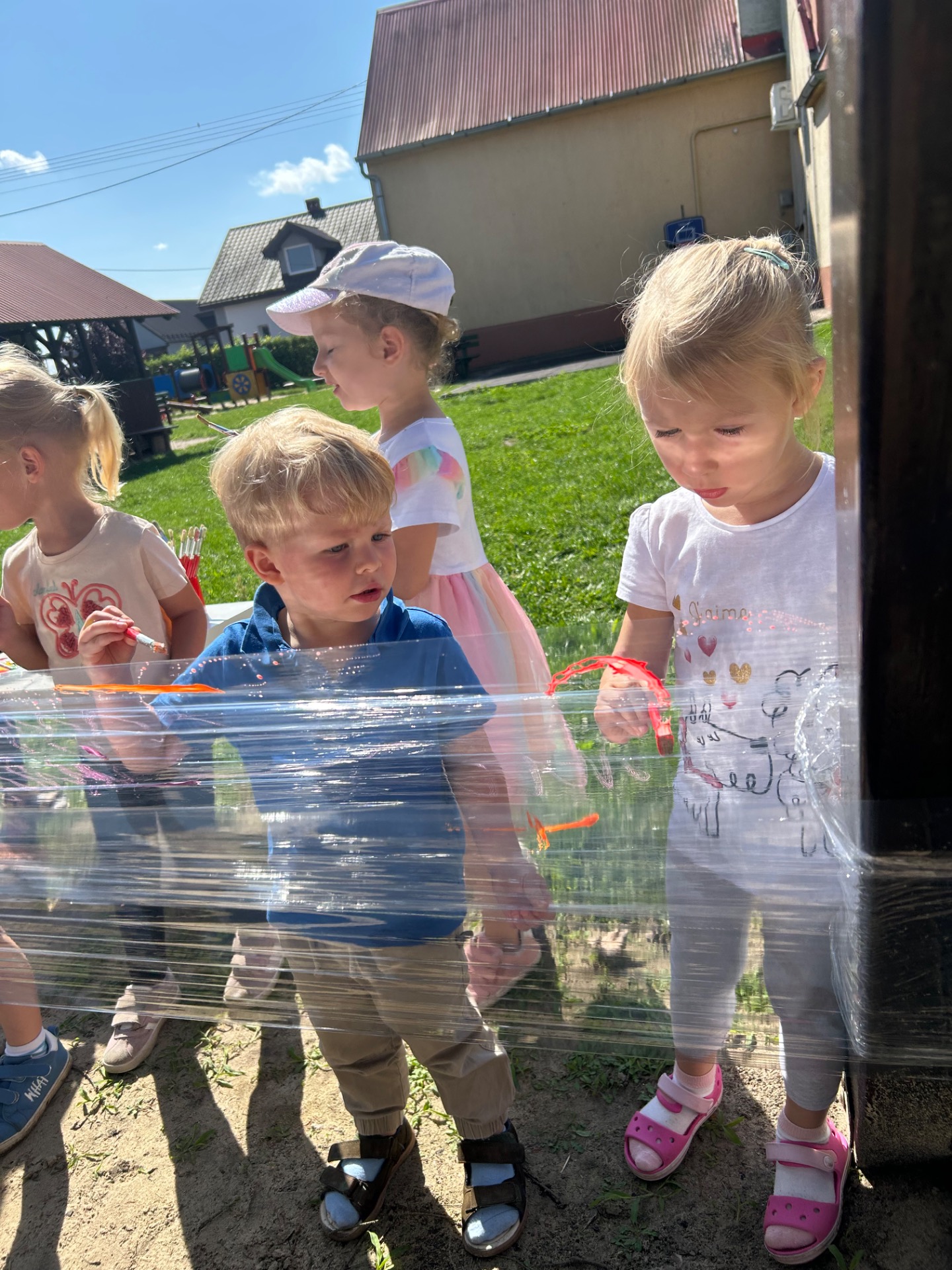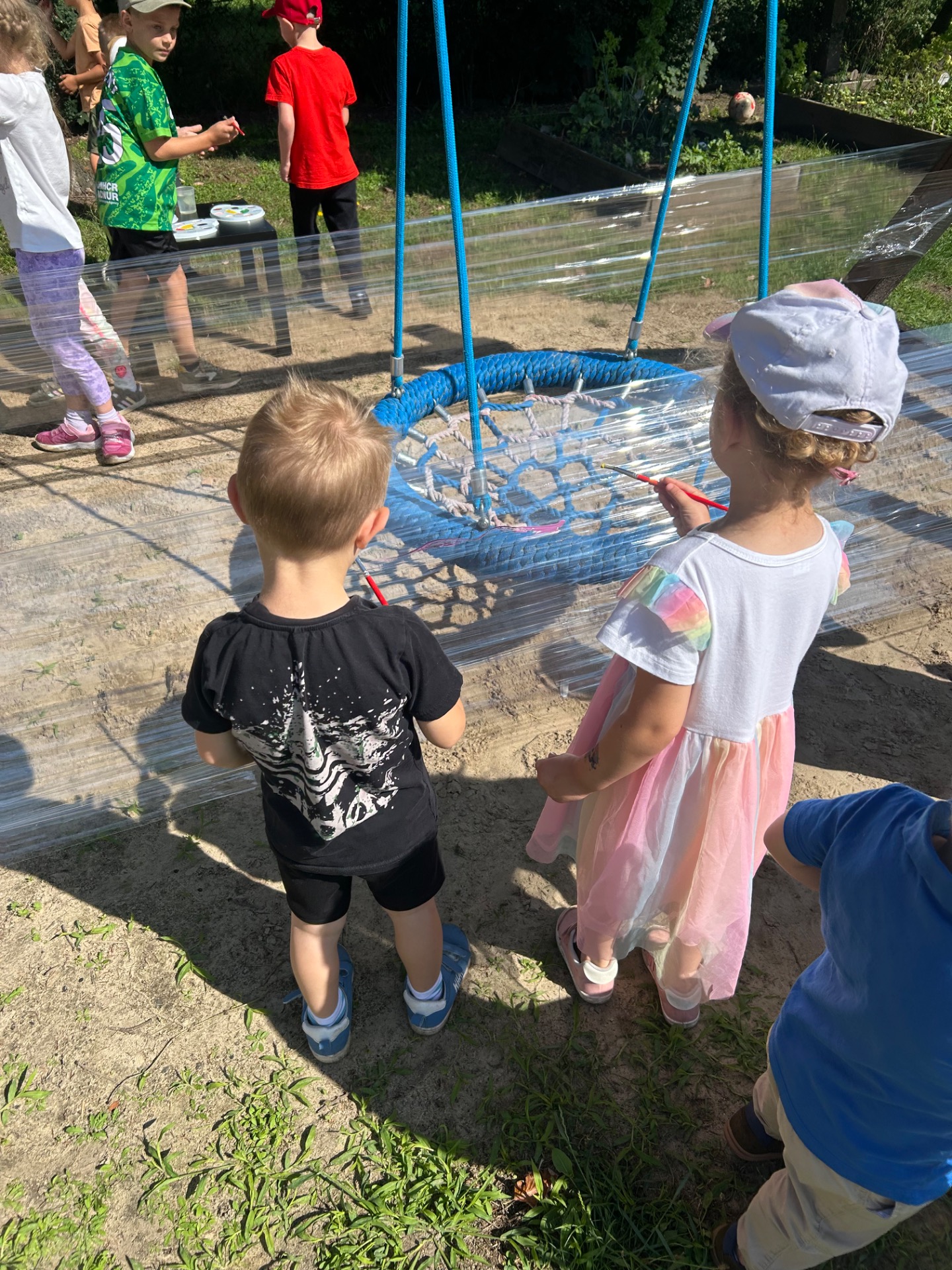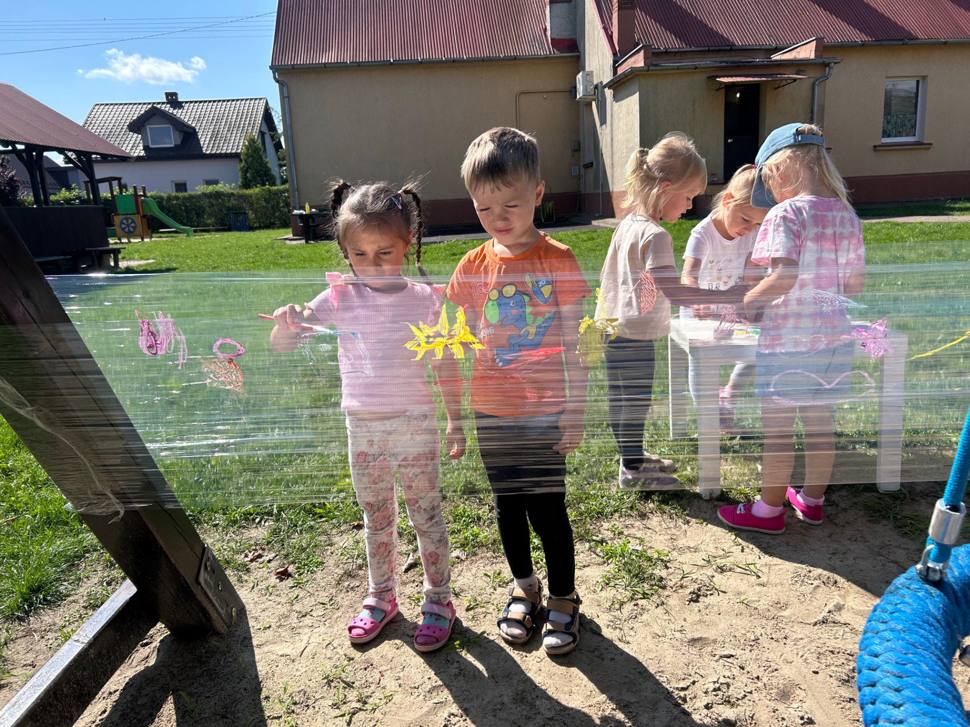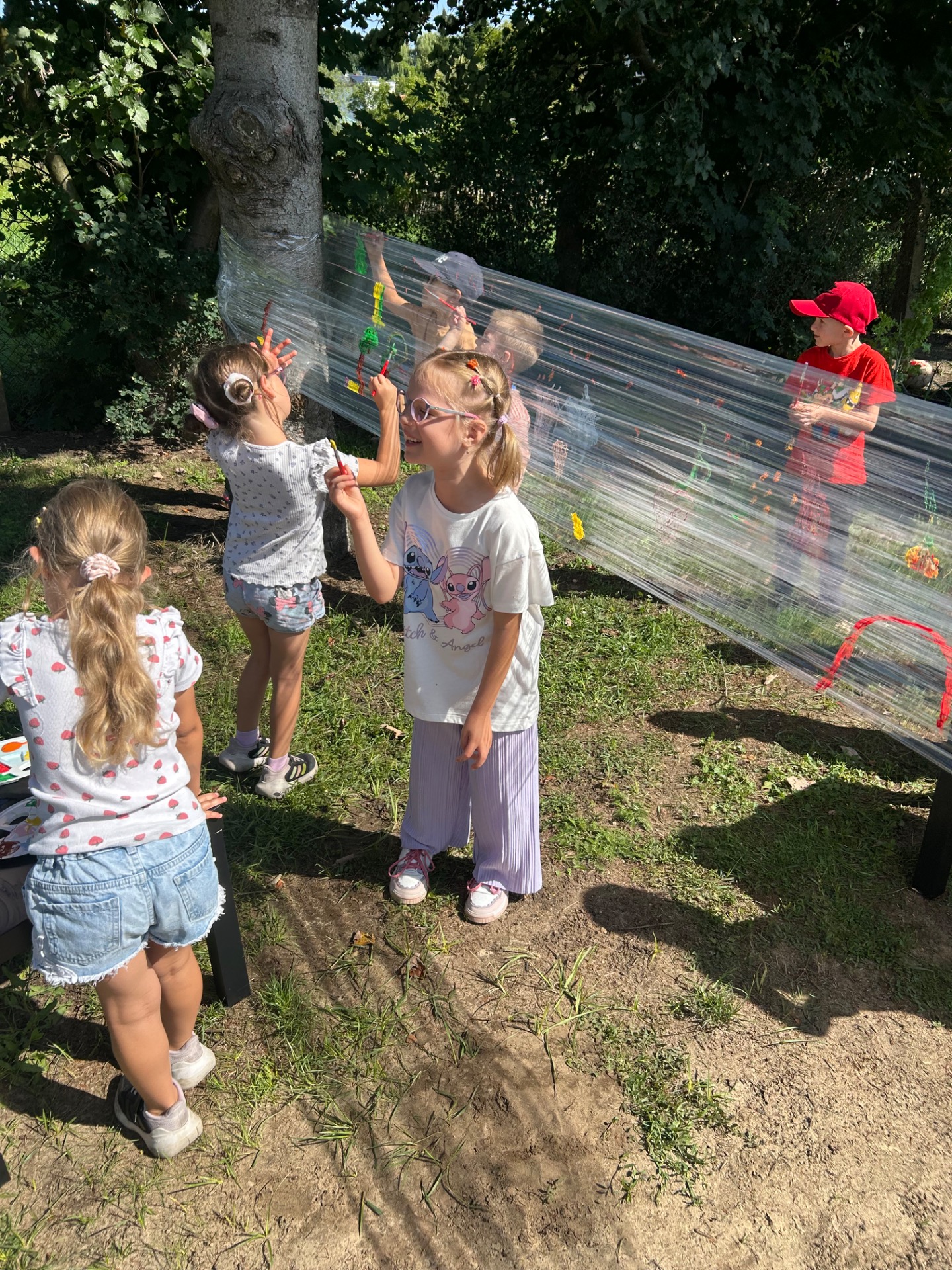 Korzystając z pięknej pogody i wakacyjnego luzu, nasze przedszkolaki miały okazję wziąć udział w wyjątkowych zajęciach plastycznych na świeżym powietrzu. Tym razem farby i pędzle poszły w ruch… na przezroczystym streczowym płótnie!