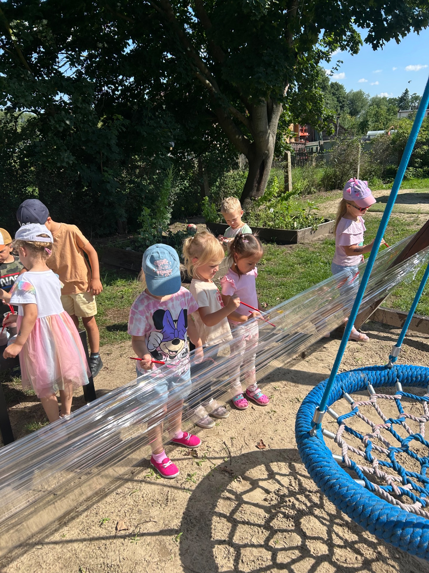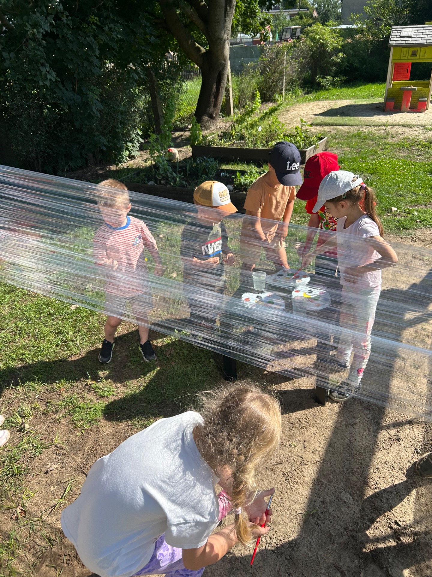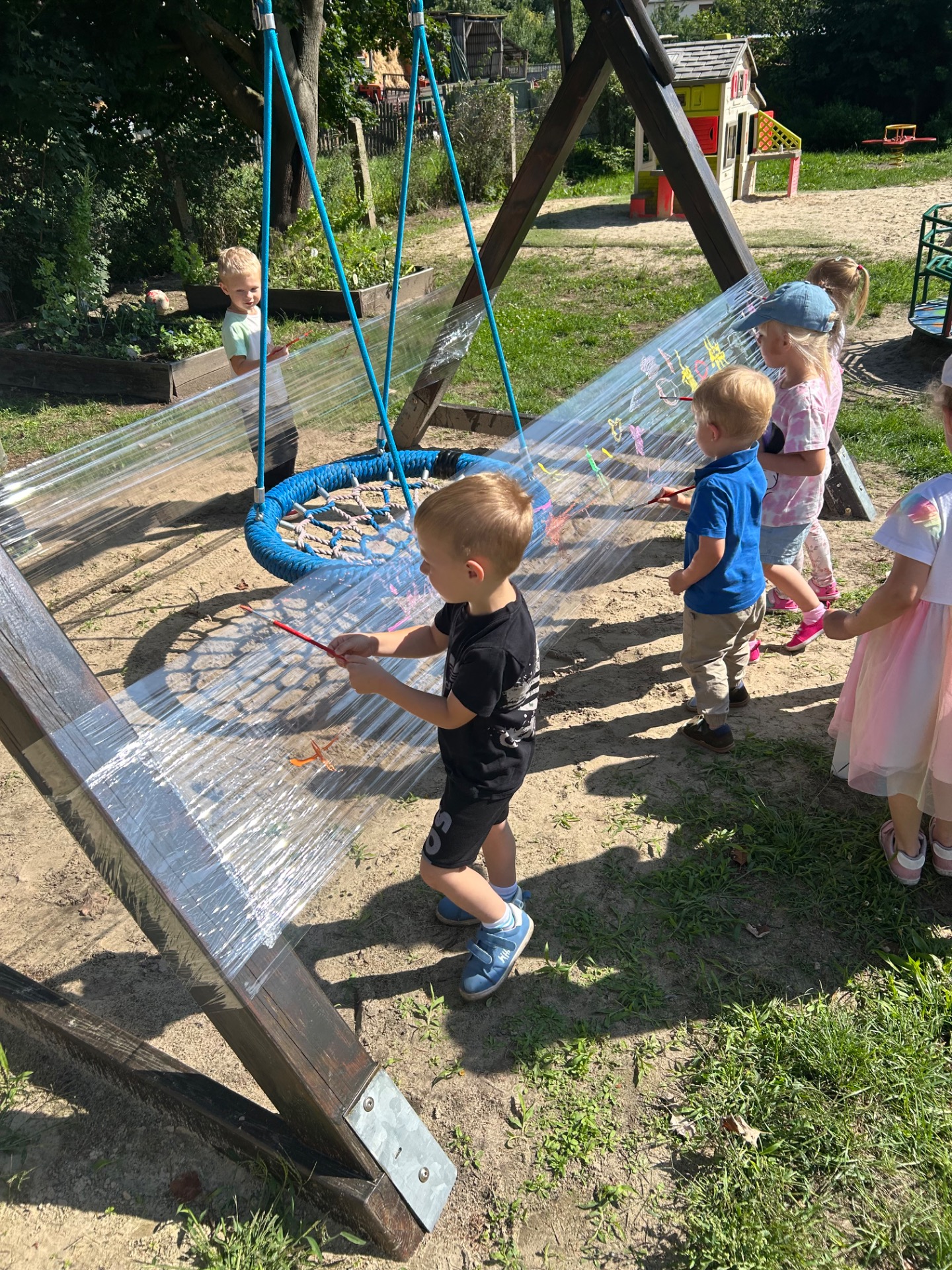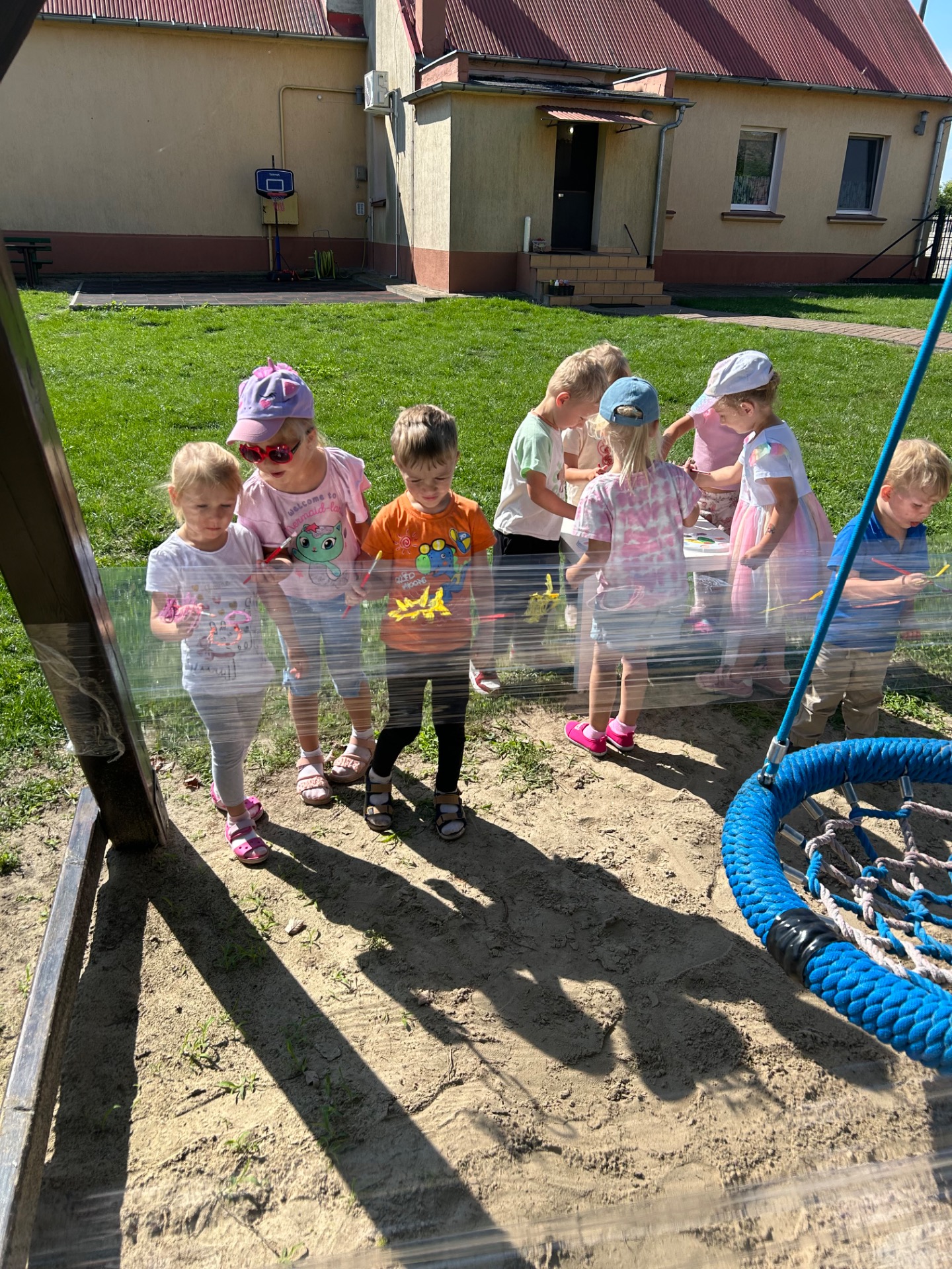 Korzystając z pięknej pogody i wakacyjnego luzu, nasze przedszkolaki miały okazję wziąć udział w wyjątkowych zajęciach plastycznych na świeżym powietrzu. Tym razem farby i pędzle poszły w ruch… na przezroczystym streczowym płótnie!