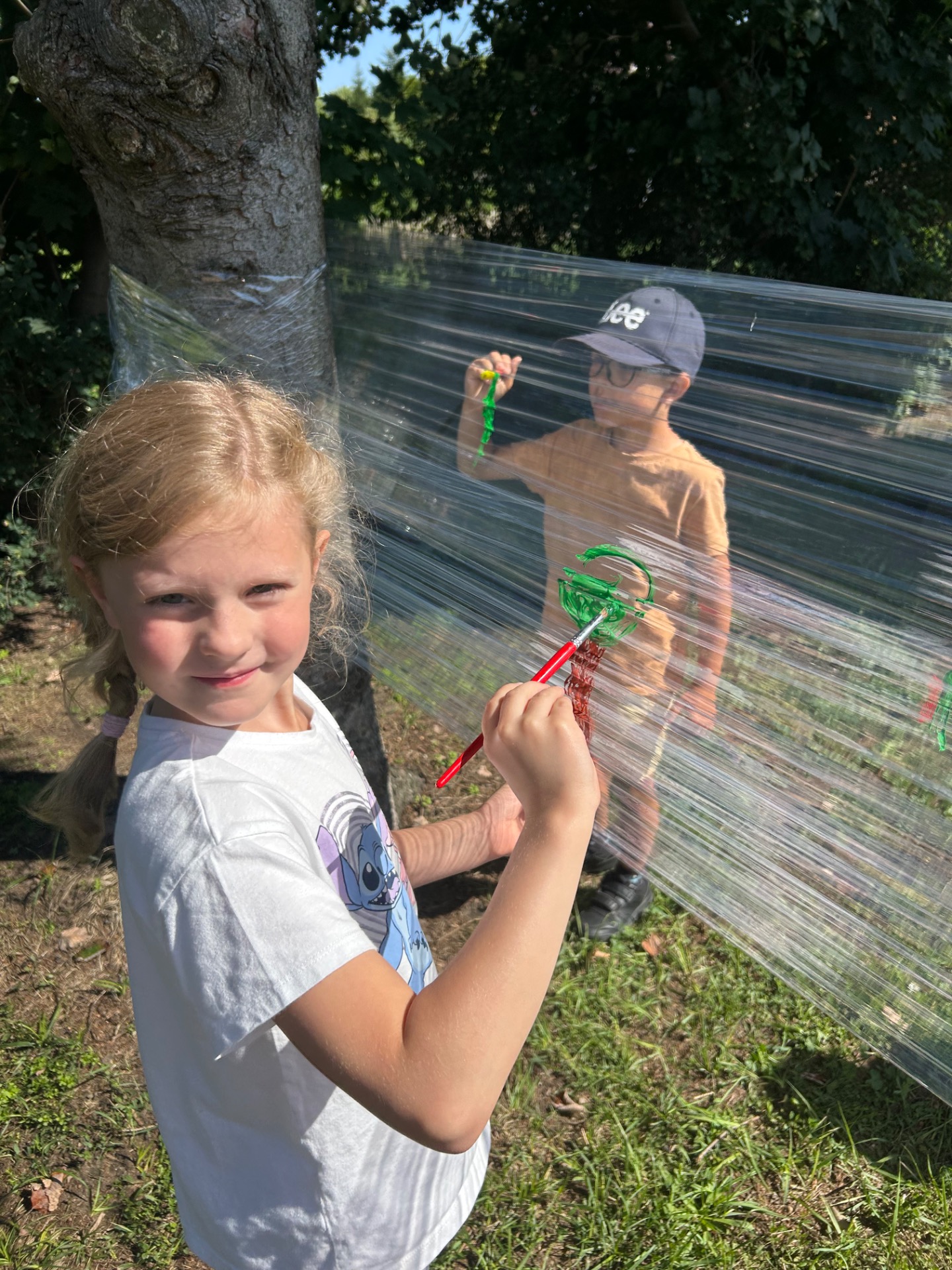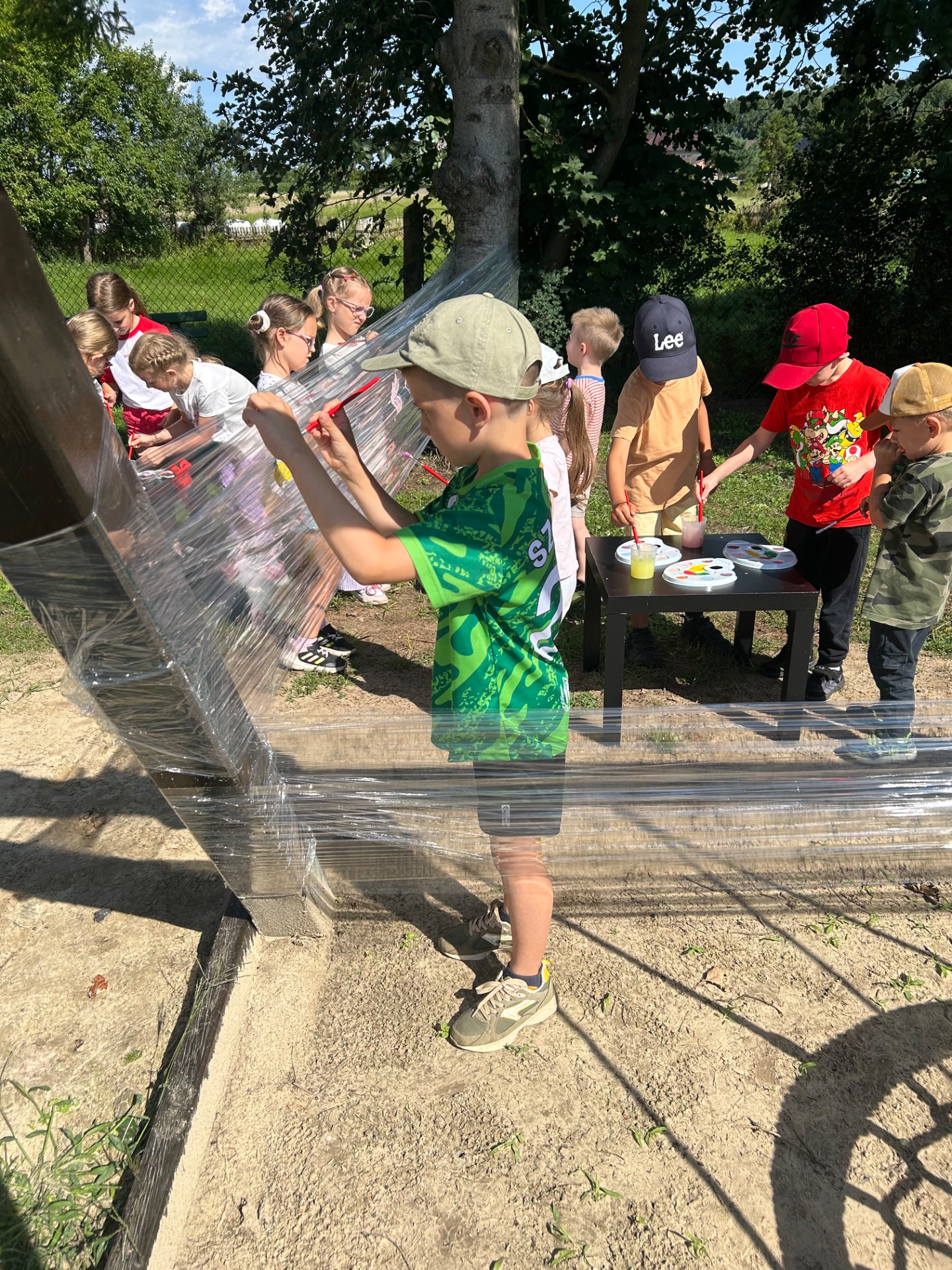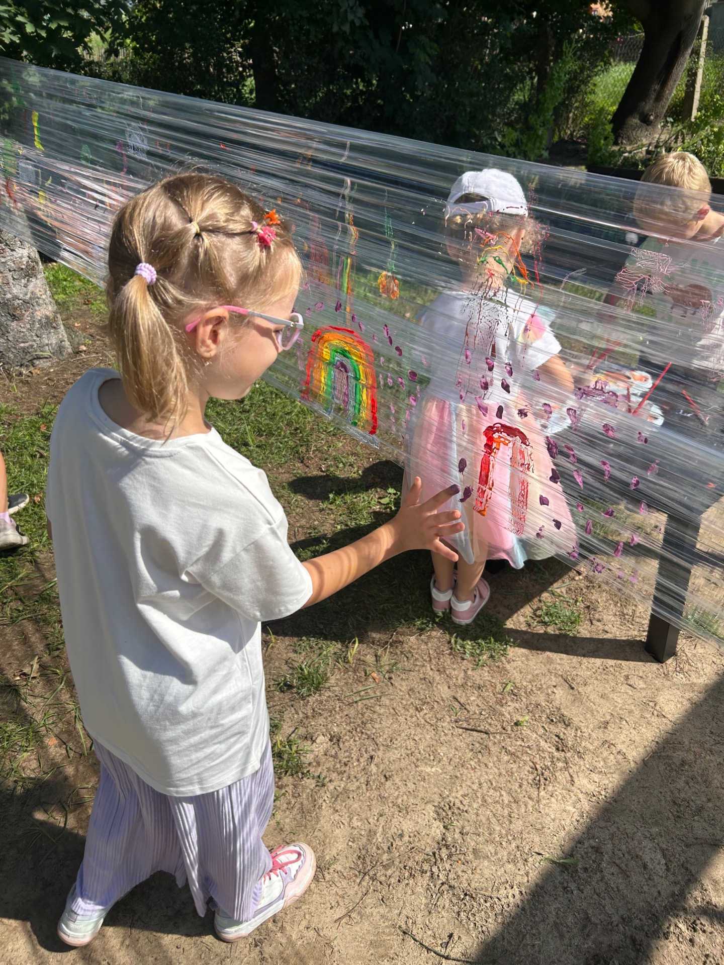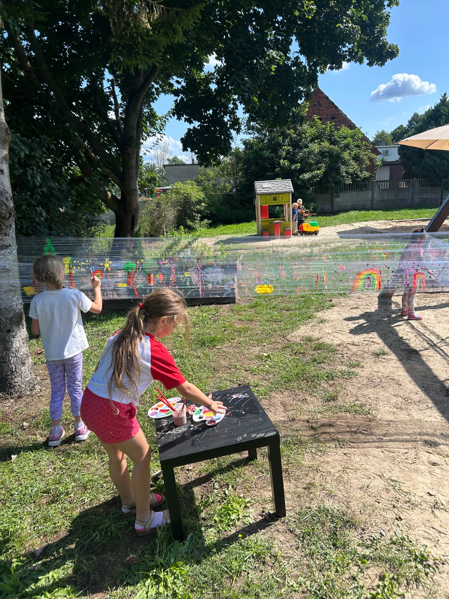Korzystając z pięknej pogody i wakacyjnego luzu, nasze przedszkolaki miały okazję wziąć udział w wyjątkowych zajęciach plastycznych na świeżym powietrzu. Tym razem farby i pędzle poszły w ruch… na przezroczystym streczowym płótnie!