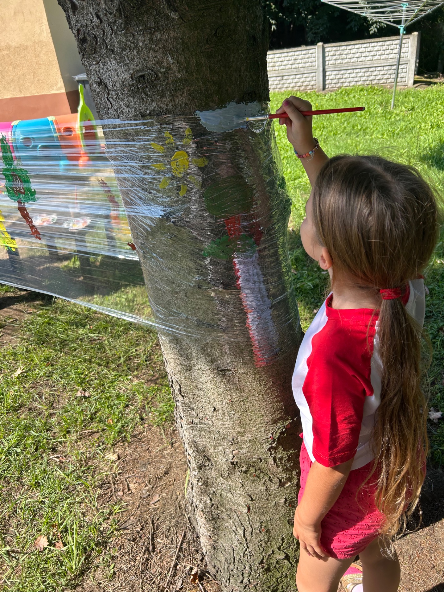 Rozciągnięta folia między drzewami zamieniła się w prawdziwą galerię pod chmurką, a dzieci z ogromnym zaangażowaniem tworzyły barwne dzieła – od tęcz, przez zwierzątka, po abstrakcyjne kompozycje. Zabawa była nie tylko kreatywna, ale i rozwijająca – doskonała okazja do ćwiczenia motoryki małej oraz wyobraźni.