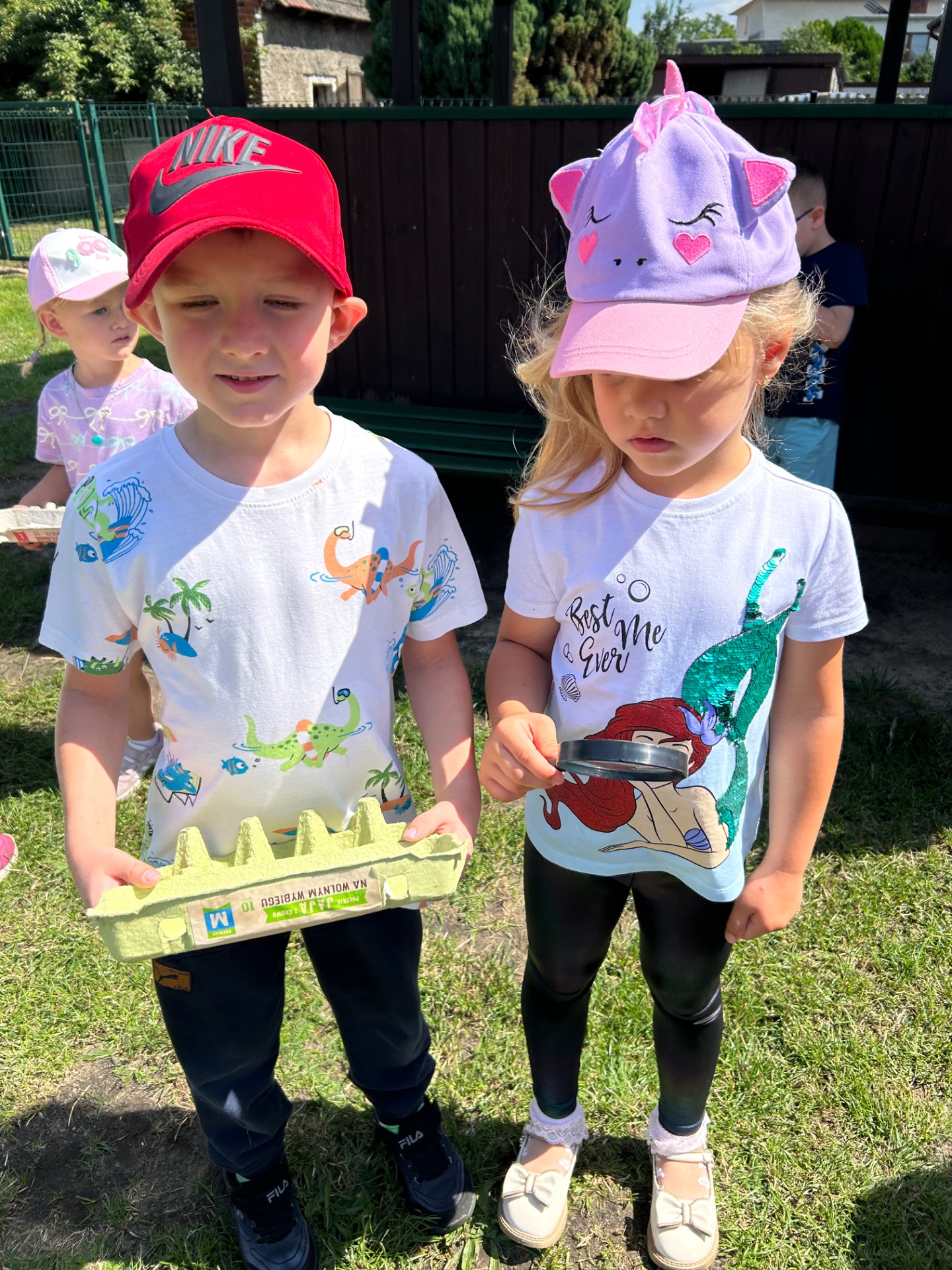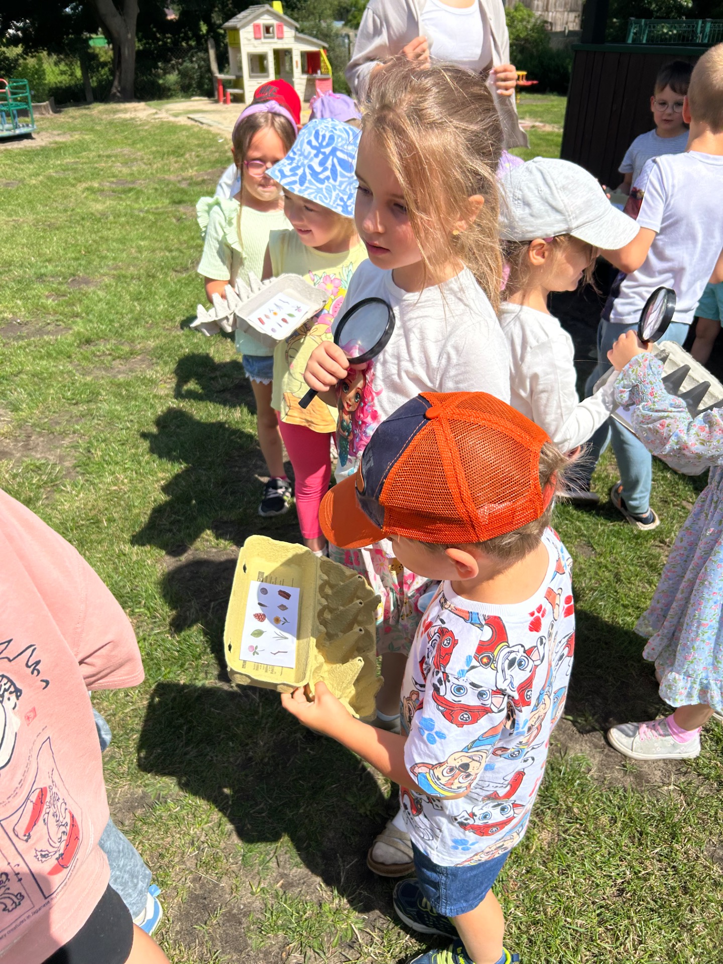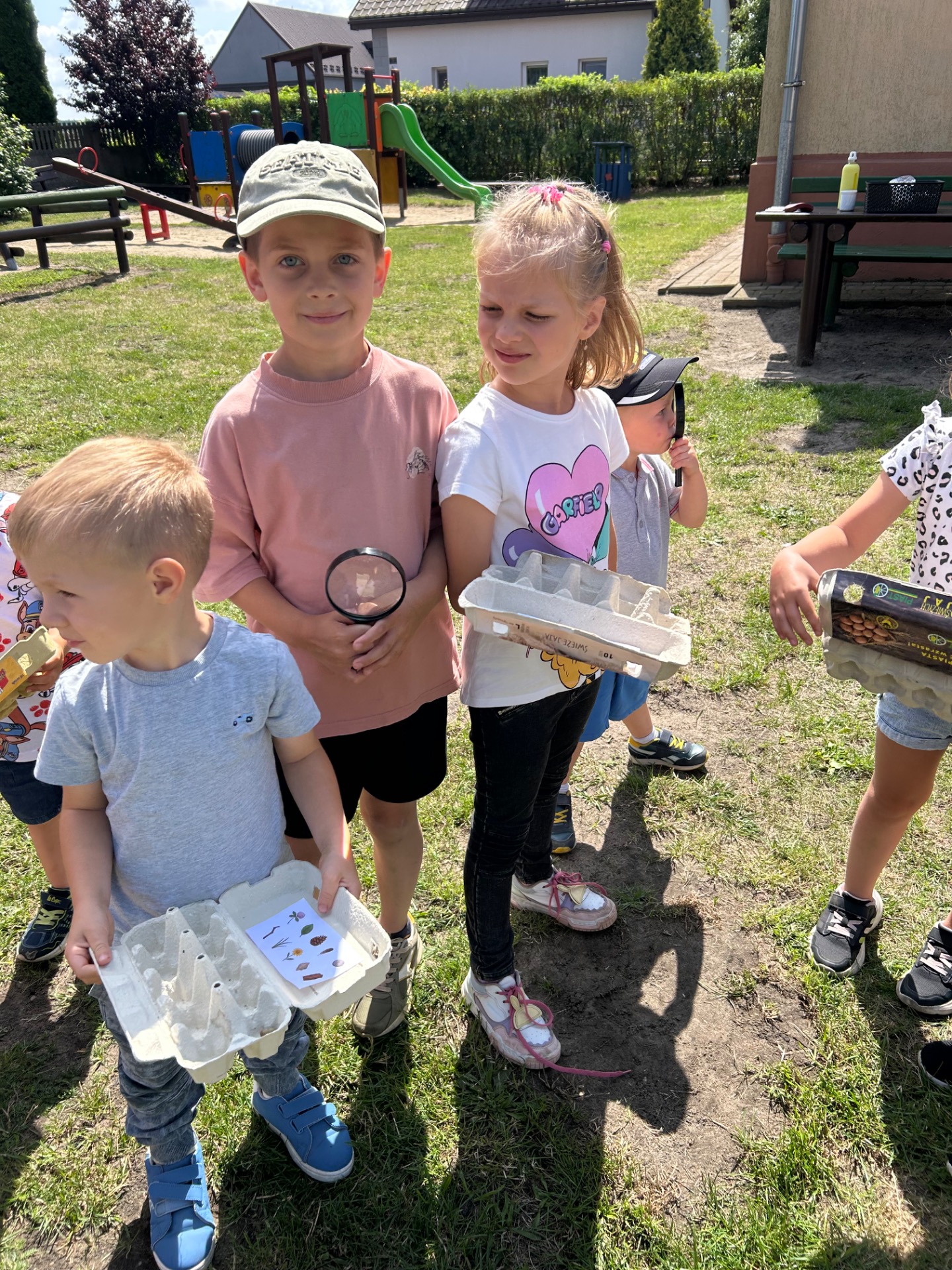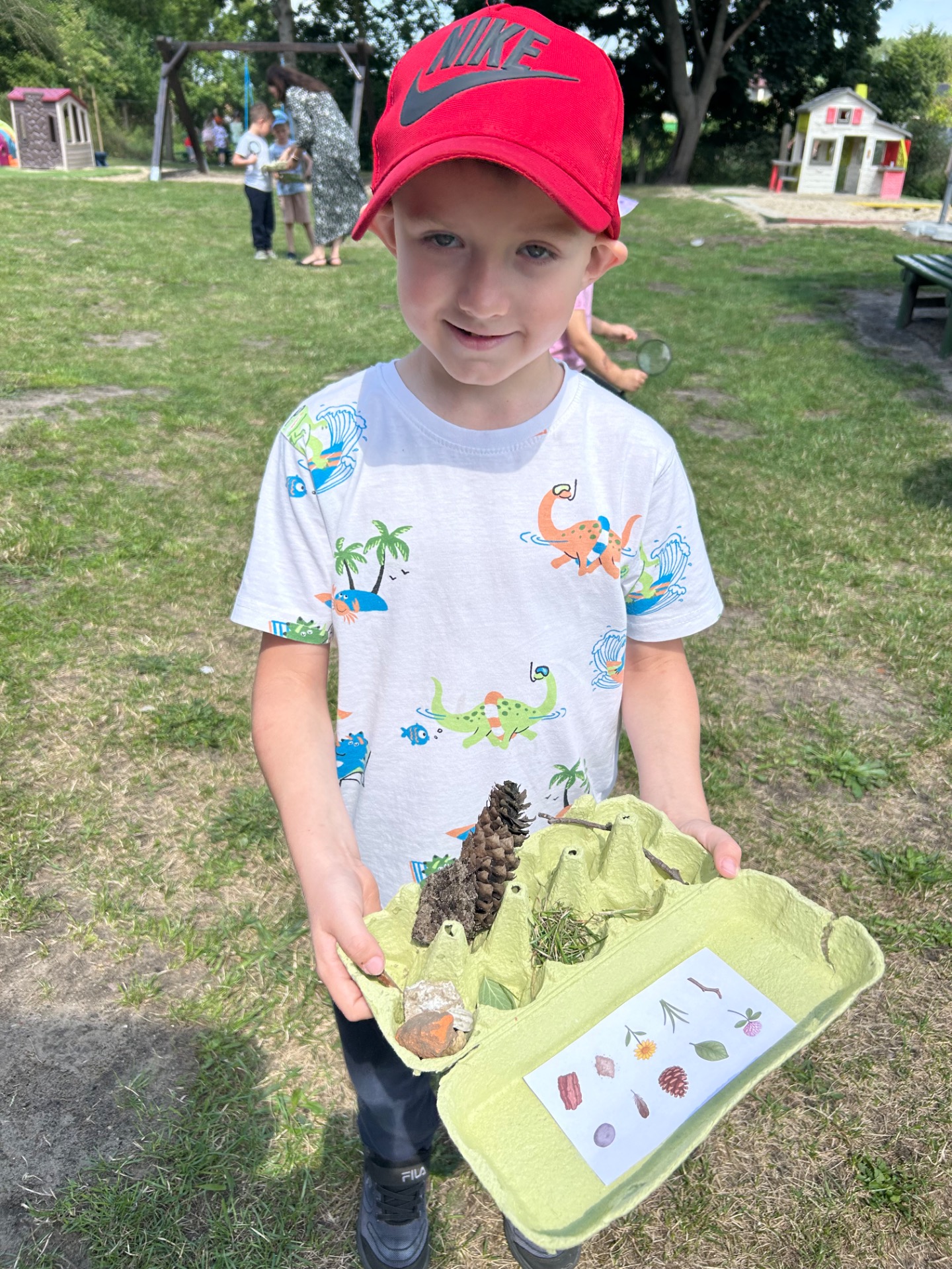W ostatnich dniach dzieci wzięły udział w wakacyjnej zabawie pod hasłem „Letnie Skarby Przyrody”. Ich zadaniem było odnalezienie różnych elementów natury, takich jak liście, patyki, szyszki, kwiaty, piórka czy kamyki. Zbieranie tych „skarbów” sprawiło dzieciom wiele radości i jednocześnie zachęciło je do uważnego przyglądania się otaczającemu światu.