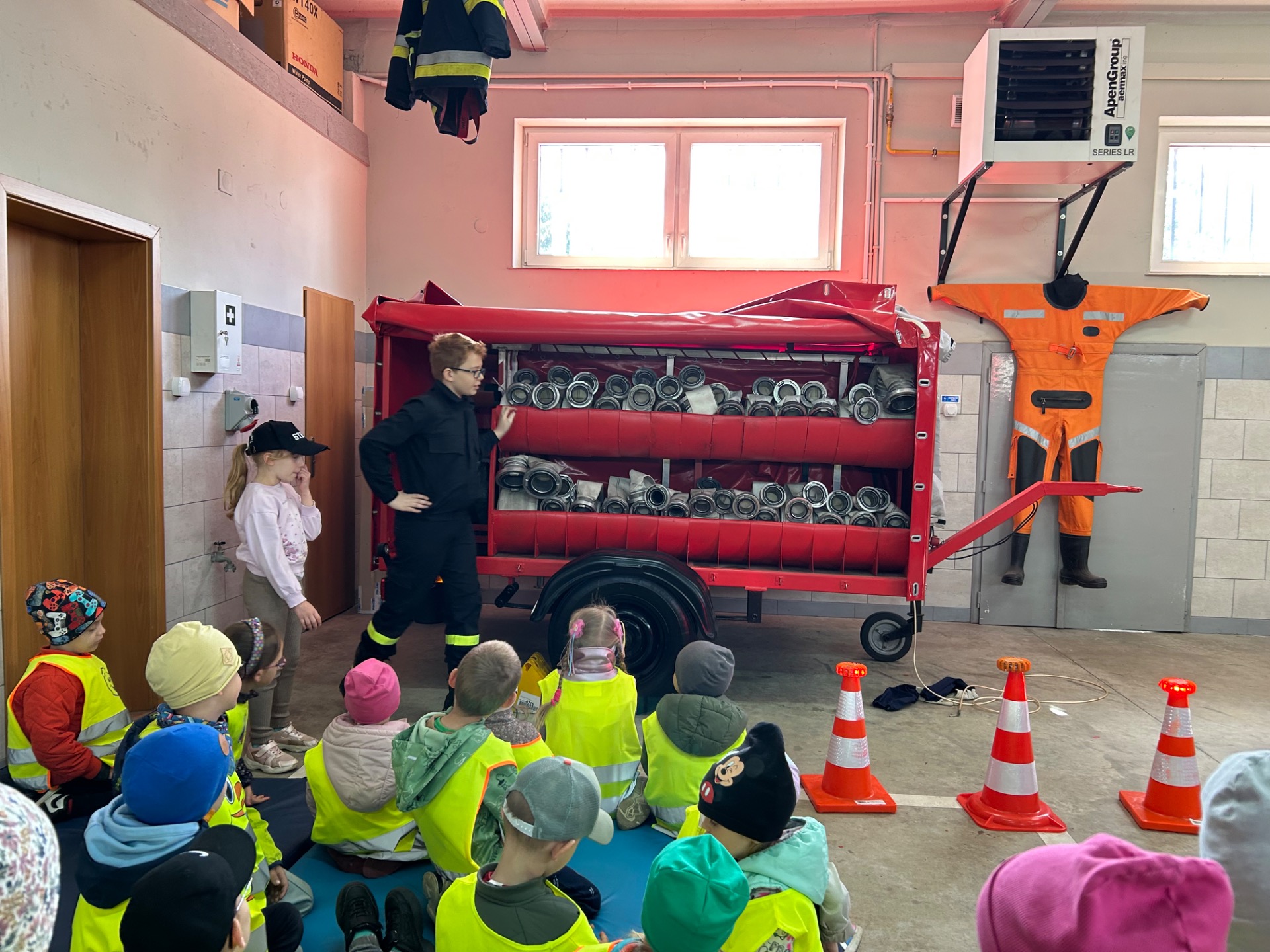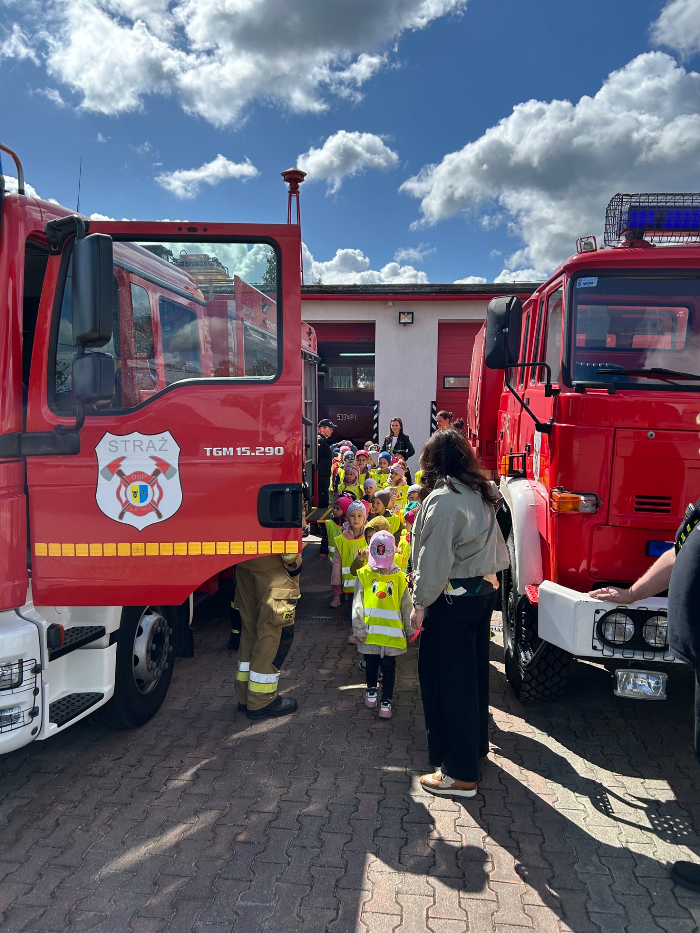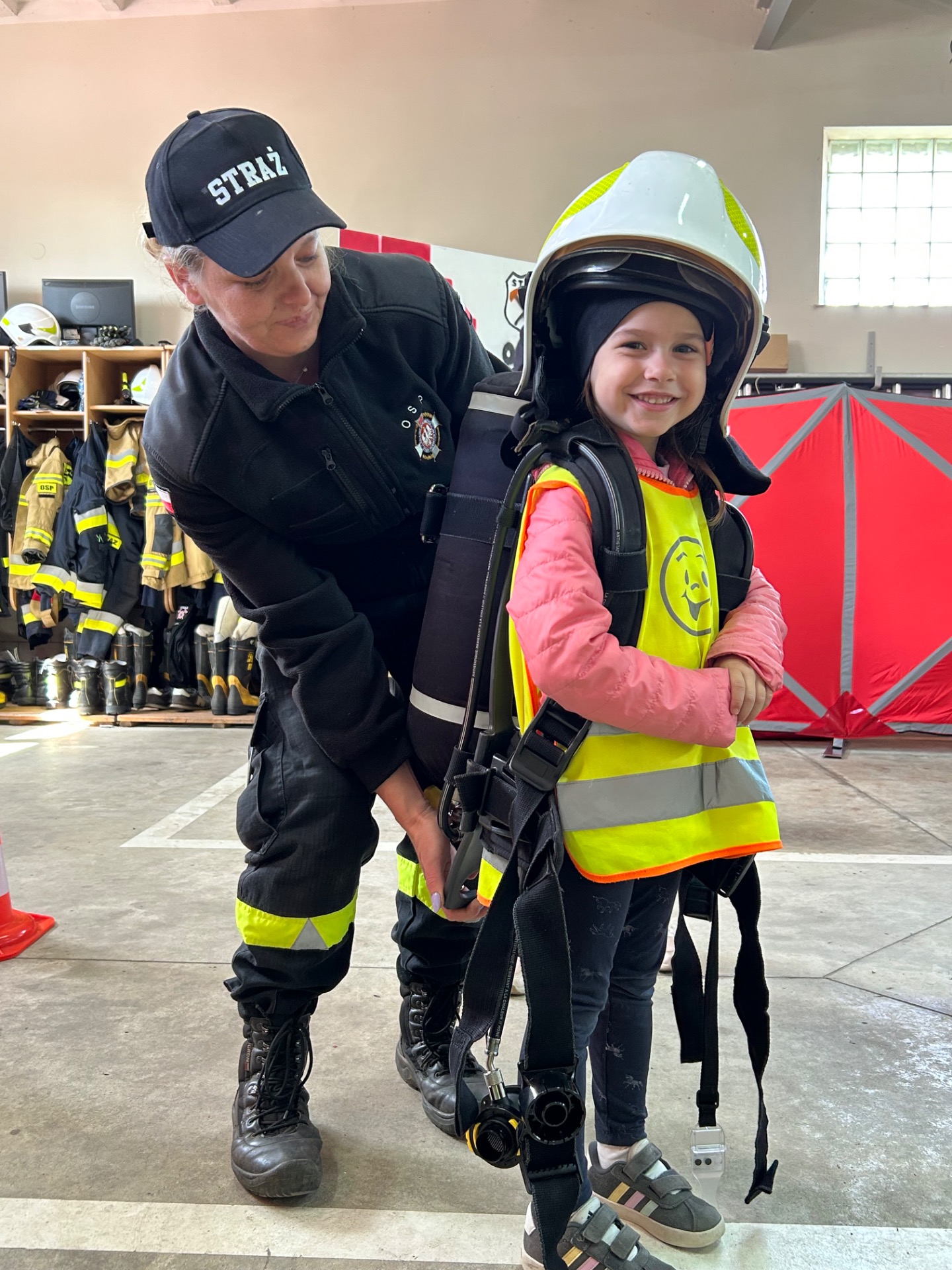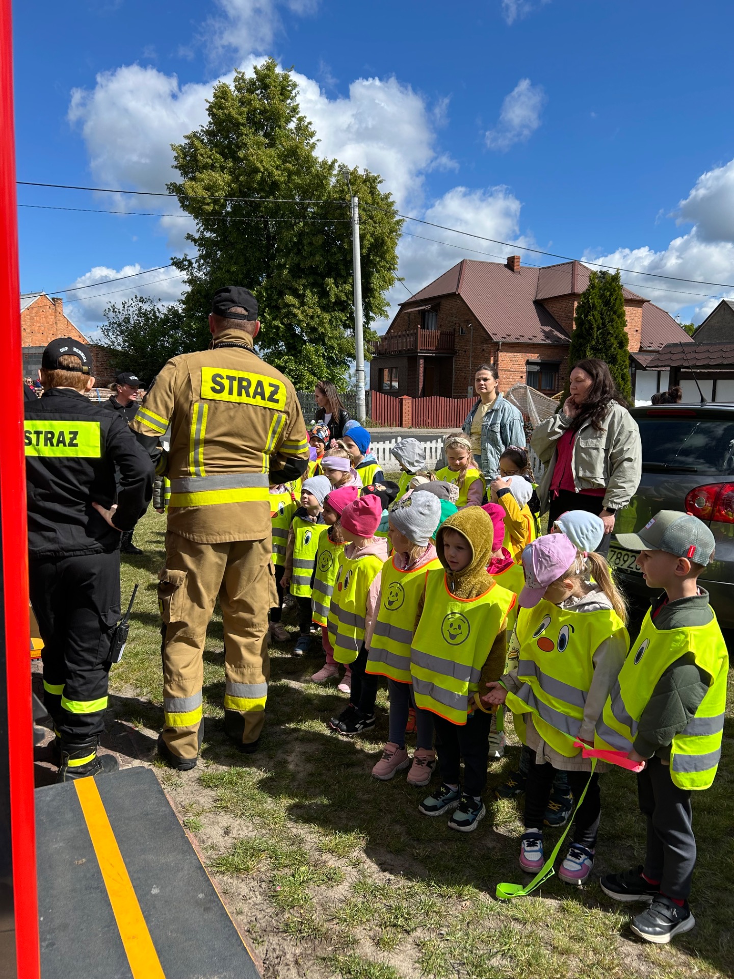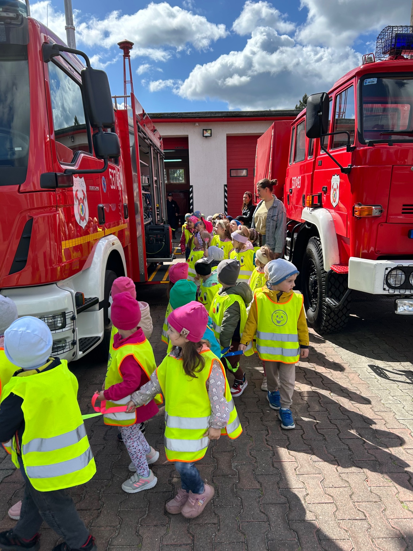 Strażacy przyjęli nas bardzo serdecznie i z ogromnym zaangażowaniem zaprezentowali cały sprzęt, którym posługują się podczas akcji ratunkowych. Dzieci mogły obejrzeć wozy strażackie, hełmy, węże oraz wiele innych ciekawych narzędzi.