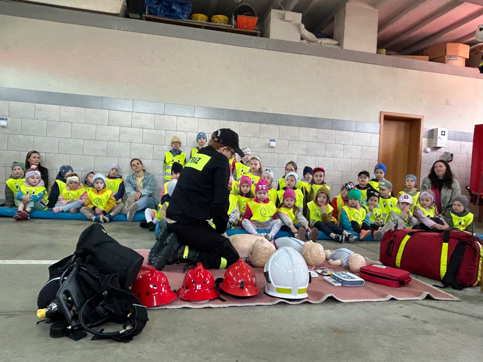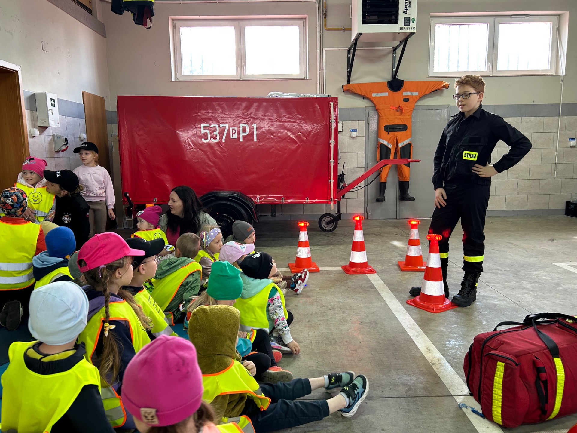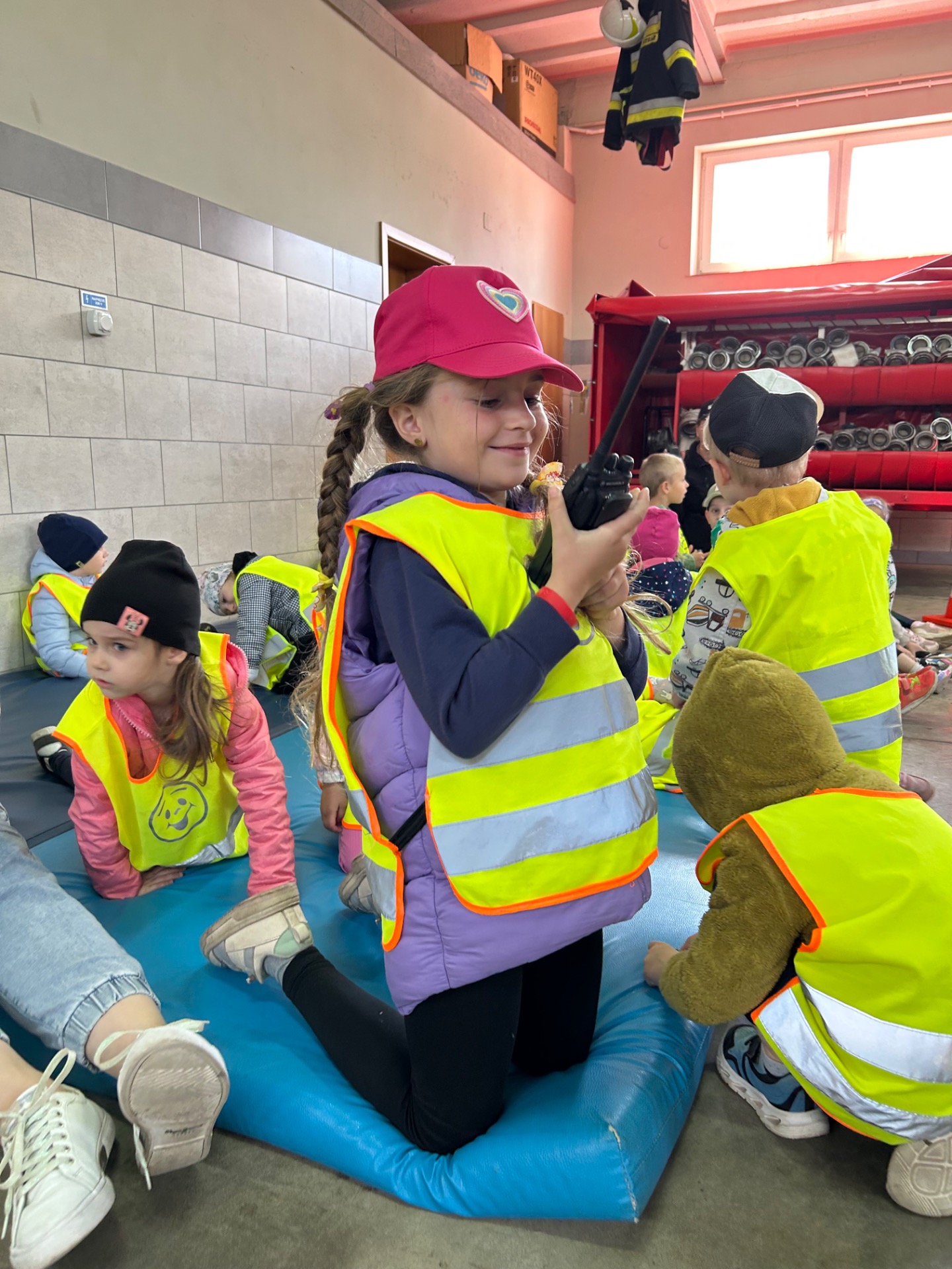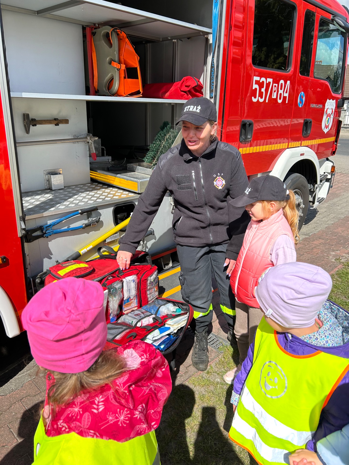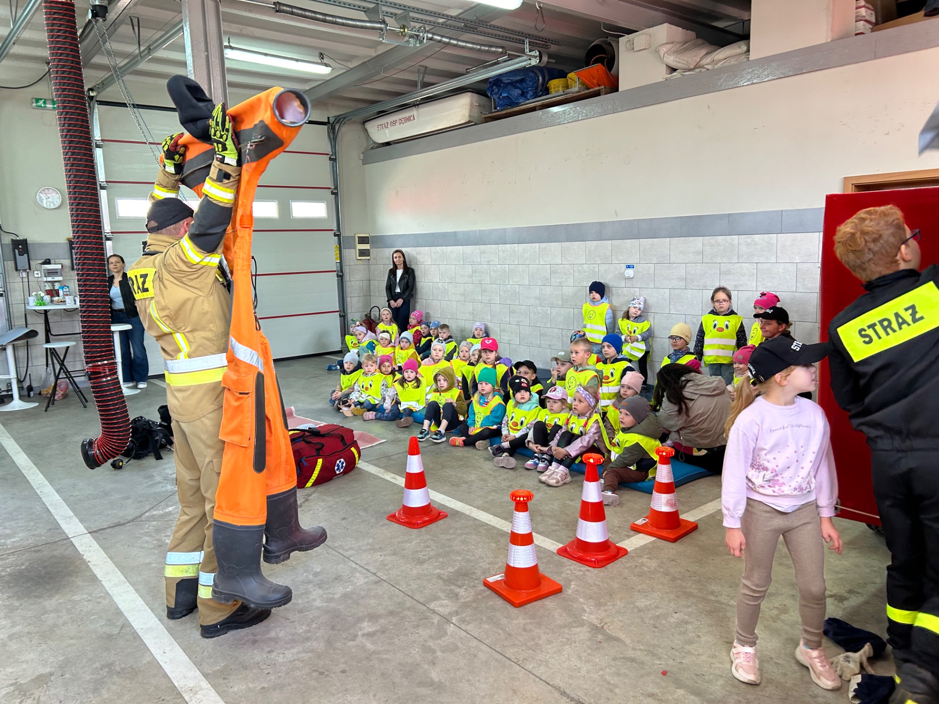 Strażacy przyjęli nas bardzo serdecznie i z ogromnym zaangażowaniem zaprezentowali cały sprzęt, którym posługują się podczas akcji ratunkowych. Dzieci mogły obejrzeć wozy strażackie, hełmy, węże oraz wiele innych ciekawych narzędzi.