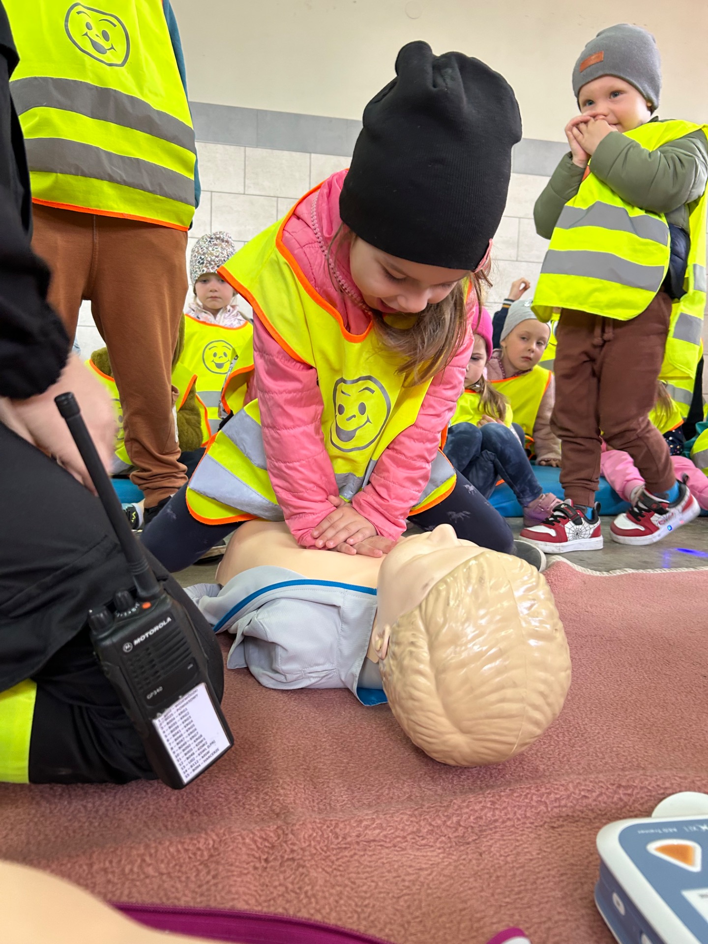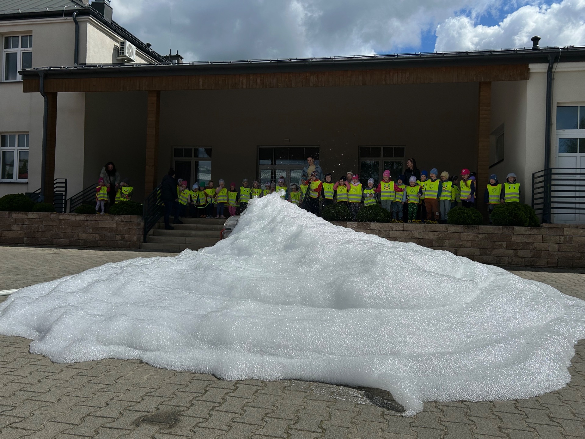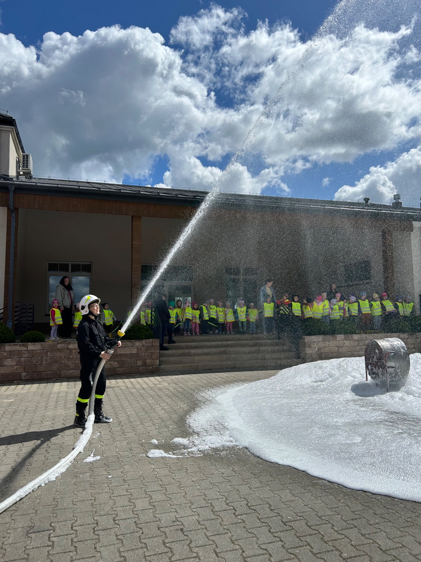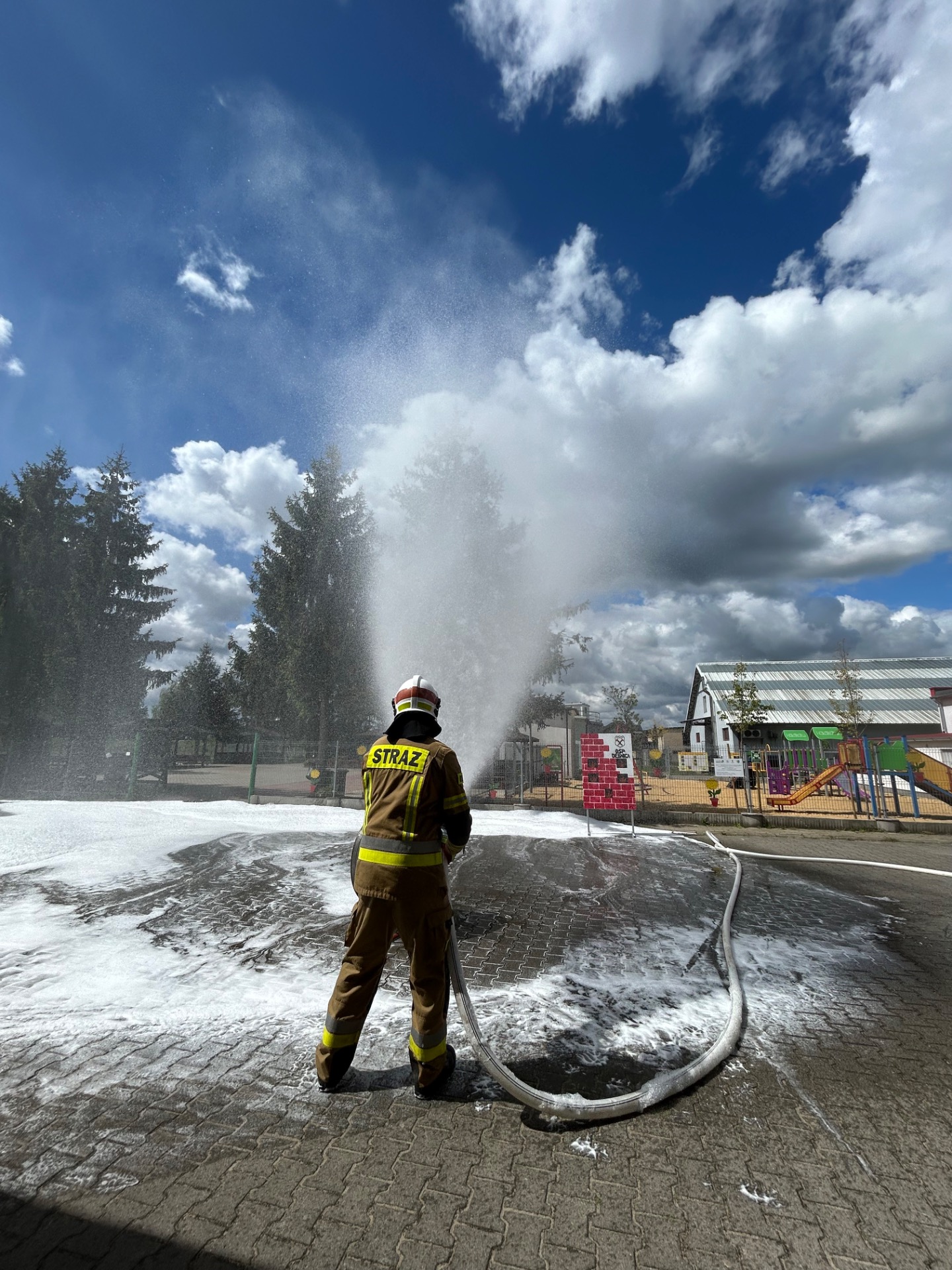 Nie zabrakło również pokazu piany gaśniczej, który wzbudził ogromne emocje. Dzieci z zaciekawieniem obserwowały, jak piana pokrywa teren, tworząc białą, puszystą warstwę.