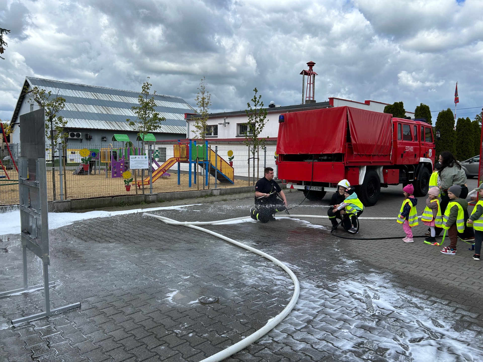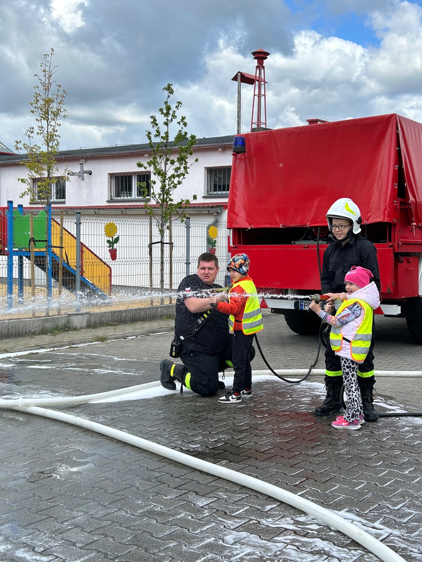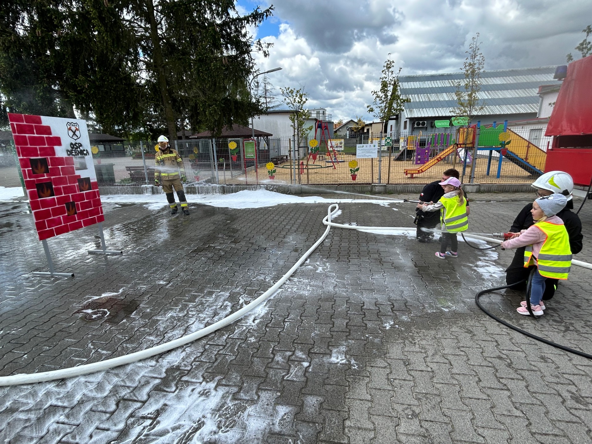 Największą atrakcją była możliwość samodzielnego spróbowania swoich sił w gaszeniu “pożaru”. Przedszkolaki z wielkim entuzjazmem chwytały za wąż strażacki i próbowały gasić wodą wyznaczony cel. Radości było co niemiara!